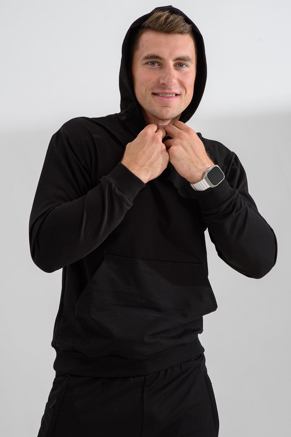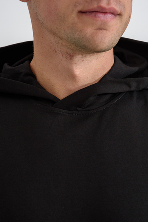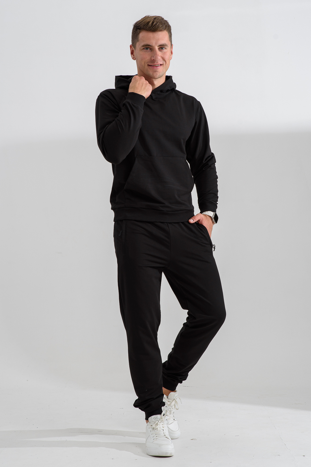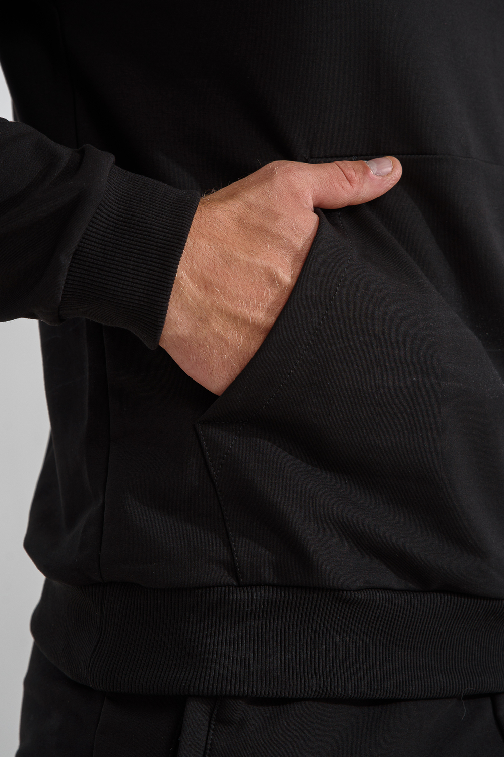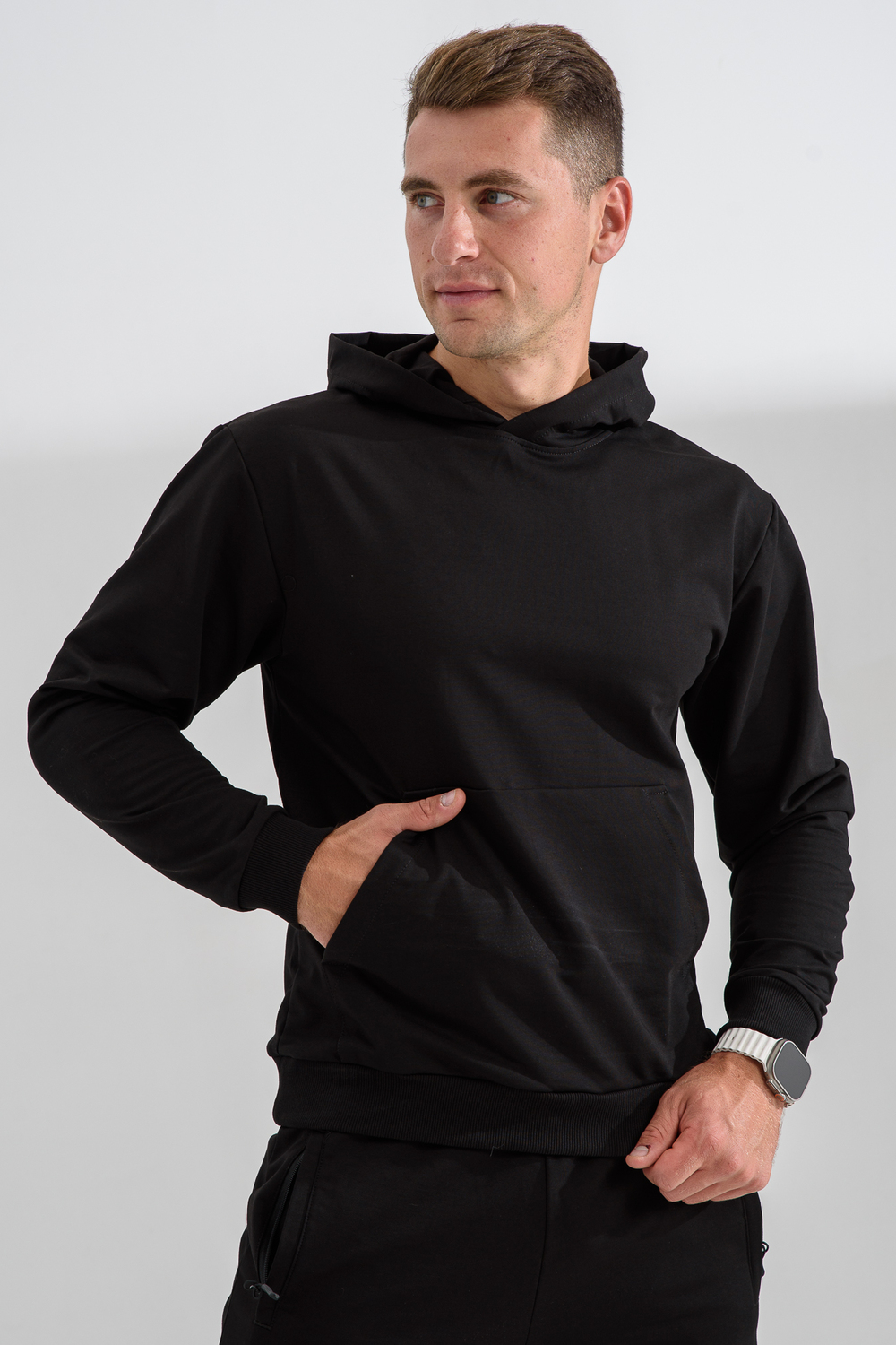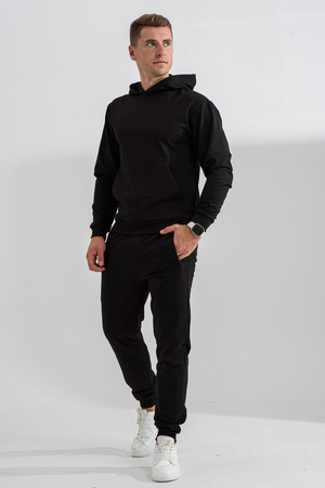 Костюм спортивный мужской с худи и джоггерами. Костюм свободного кроя состоит из толстовки с капюшоном и карманом кенгуру и брюк джоггеров на манжете с карманами в боковых швах. Костюм однотонный сшит из качественного хлопкового трикотажного материала - футера 2-х нитки. Обладает отличной эластичностью, не сковывает движений. Идеален для занятий спортом. Зимой костюм возможно носить в тренажерный зал или использовать как домашнюю одежду.