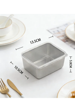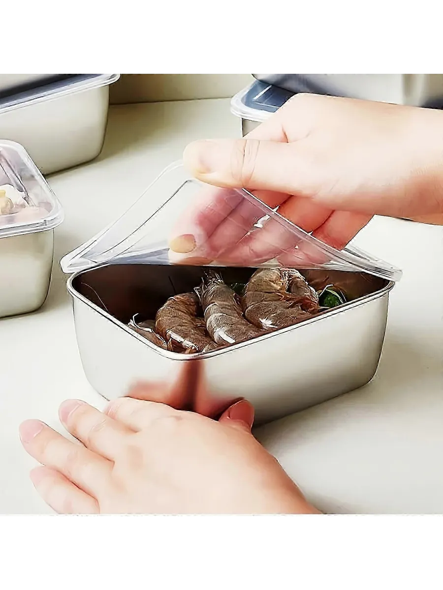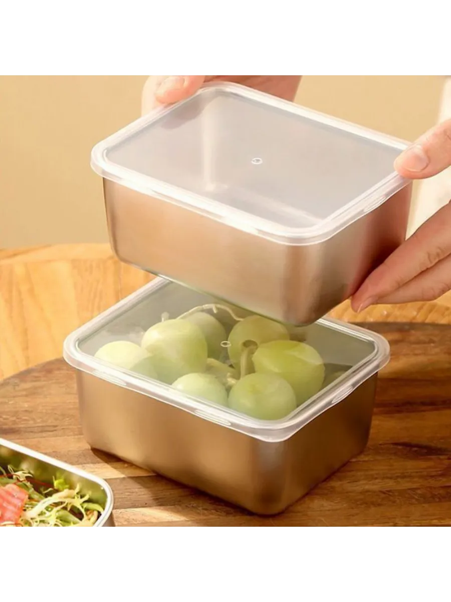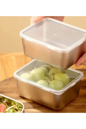 Пищевые контейнеры из нержавеющей стали с крышками в наборе 2 штуки. Прямоугольная форма, герметичные крышки в комплекте. Подходят для хранения продуктов в холодильнике и морозильной камере. Устойчивы к высоким температурам и для мытья в посудомоечной машине. Изготовлены из пищевой нержавеющей стали.
