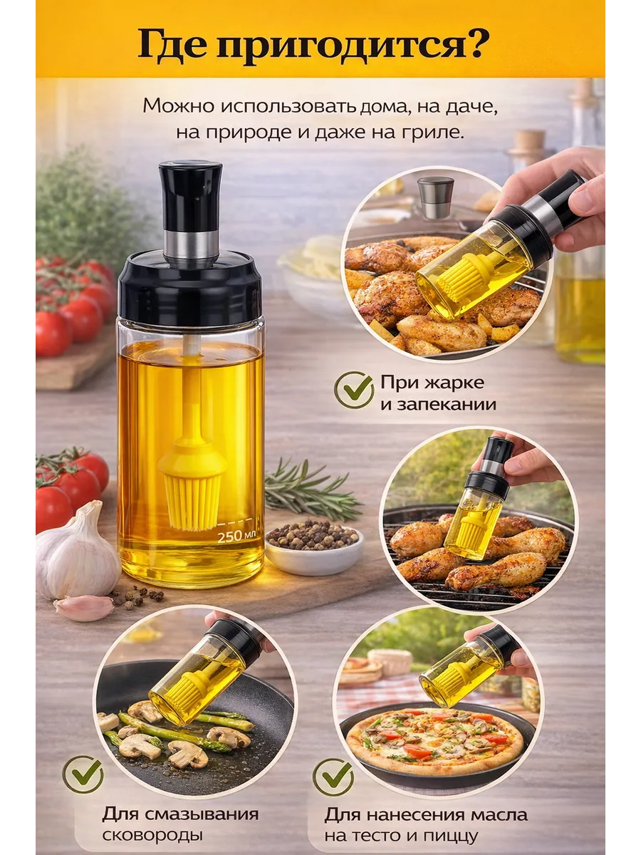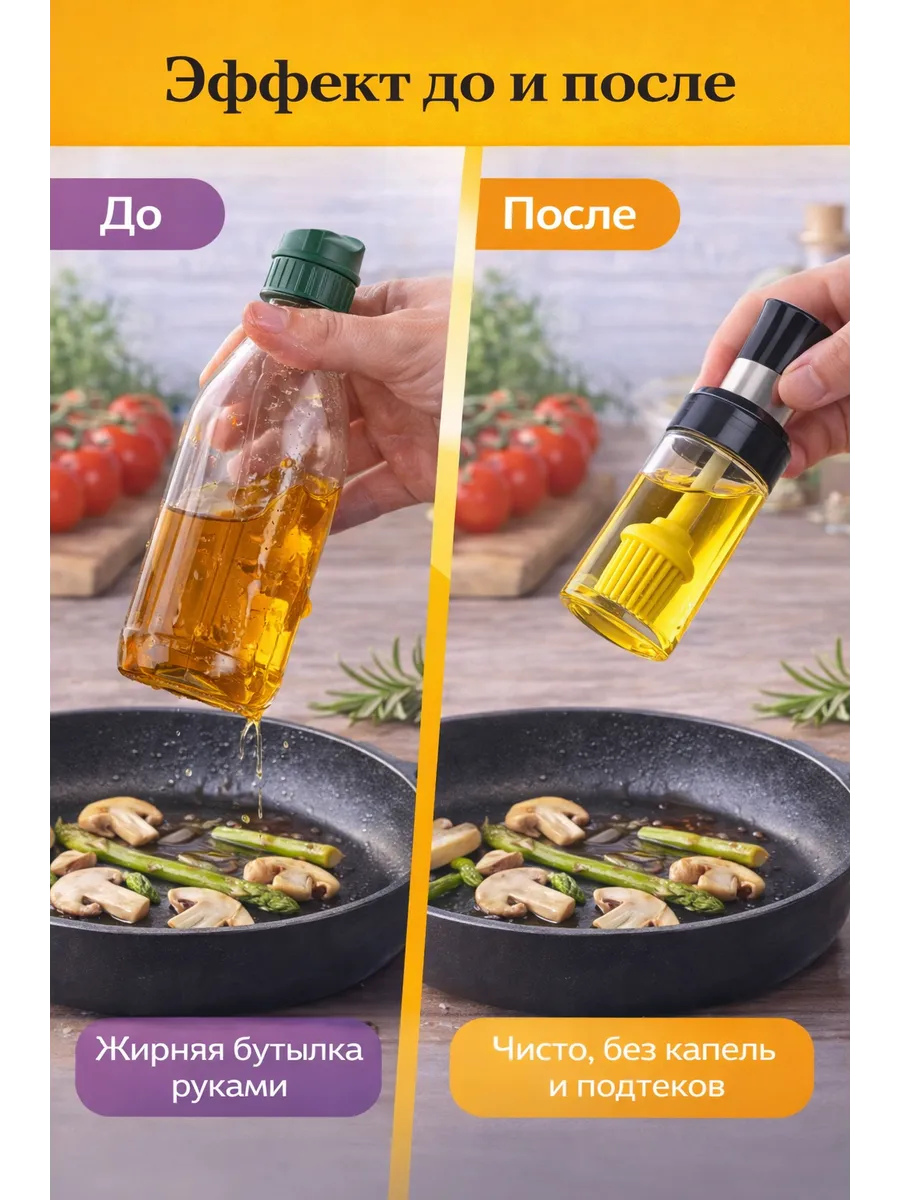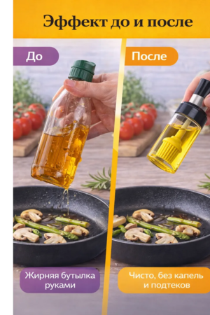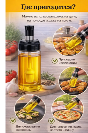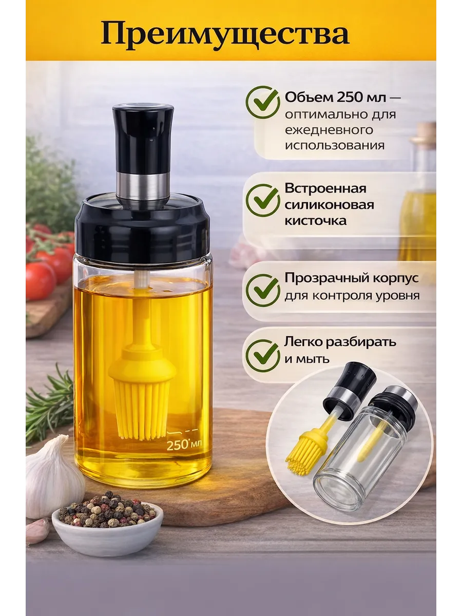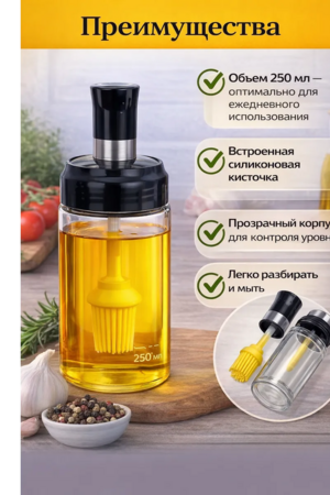 Ёмкость для масла с встроенной силиконовой кисточкой — практичный и удобный аксессуар для современной кухни. Объем 250 мл оптимален для ежедневного использования: масла достаточно для приготовления любимых блюд, при этом флакон остается компактным и не занимает много места на столешнице. Главная особенность — встроенная кисточка, которая позволяет равномерно наносить масло на сковороду, противень, мясо, рыбу, овощи или тесто. Больше не нужно лить масло из бутылки и контролировать количество «на глаз». Вы распределяете его тонким слоем, экономя расход и снижая излишнюю жирность блюд. Прозрачный корпус дает возможность легко отслеживать уровень масла. Вы всегда видите, сколько продукта осталось внутри. Плотная крышка защищает содержимое от пыли и загрязнений, а удобная конструкция предотвращает протекание и образование жирных подтеков. Силиконовая кисточка мягкая, гибкая и устойчивая к высоким температурам. Она не впитывает запахи и легко очищается после использования. Ёмкость можно быстро разобрать и помыть вручную, что значительно упрощает уход.