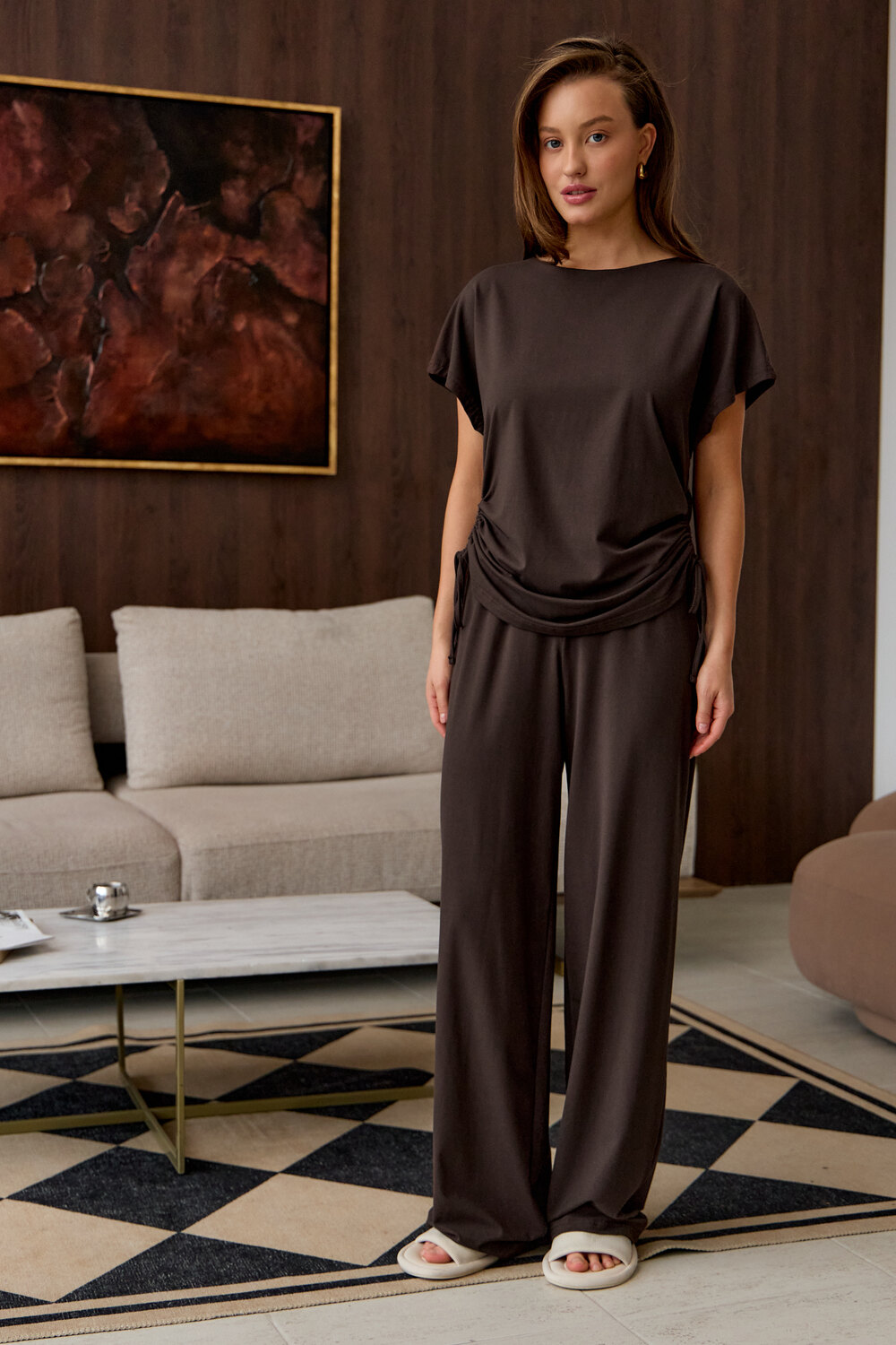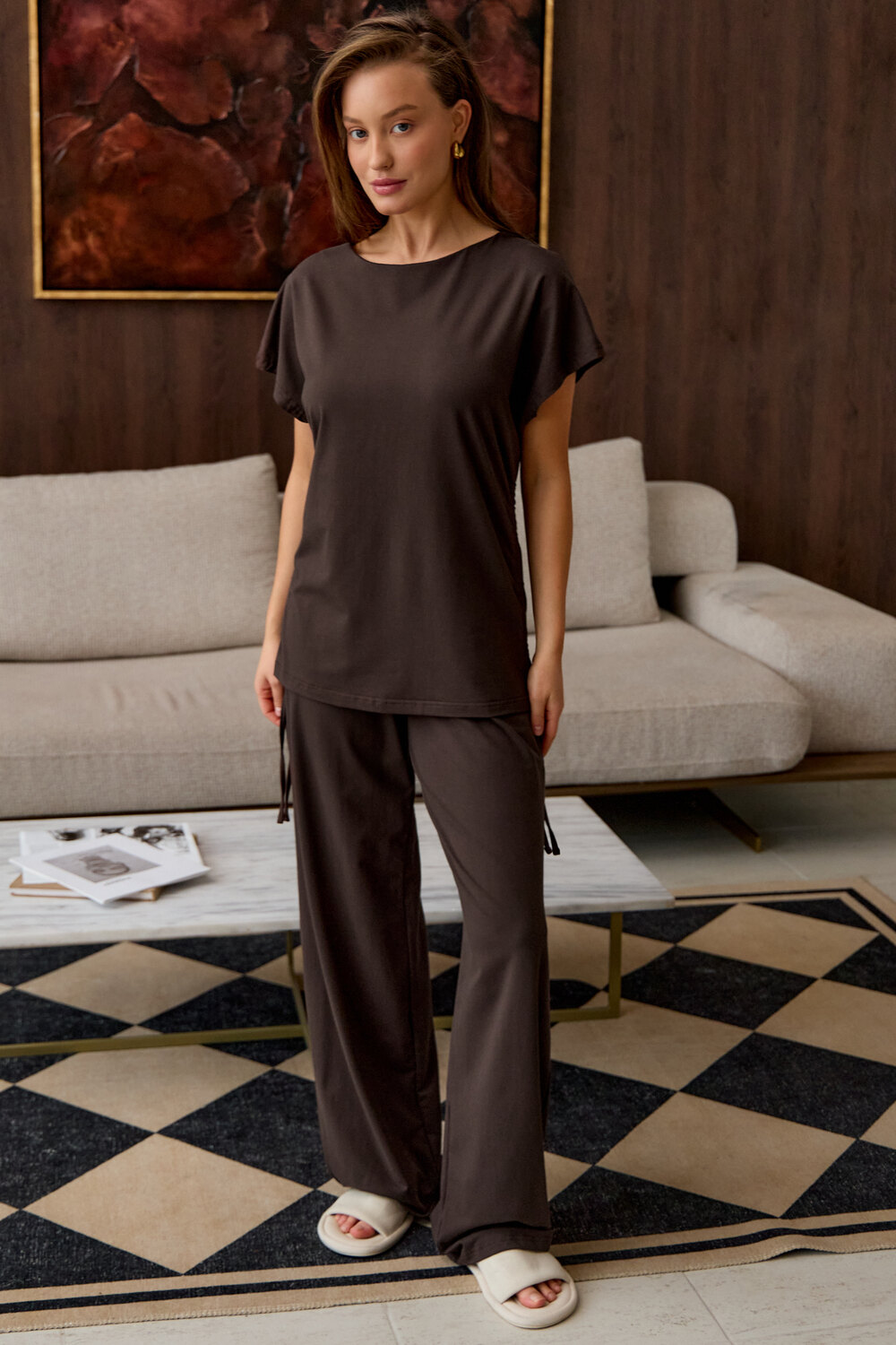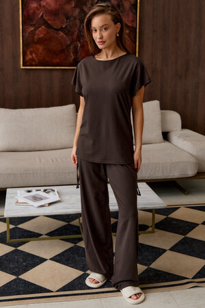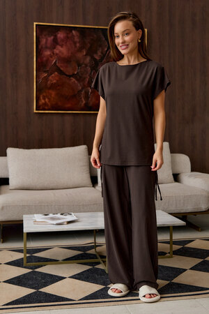 Представляем вам стильный комплект домашней пижамы женской, который станет незаменимым в вашем гардеробе. Этот костюм включает в себя футболку с завязками и с брюками палаццо, выполненный из премиальной вискозы, что обеспечивает невероятный комфорт и приятные ощущения на коже.