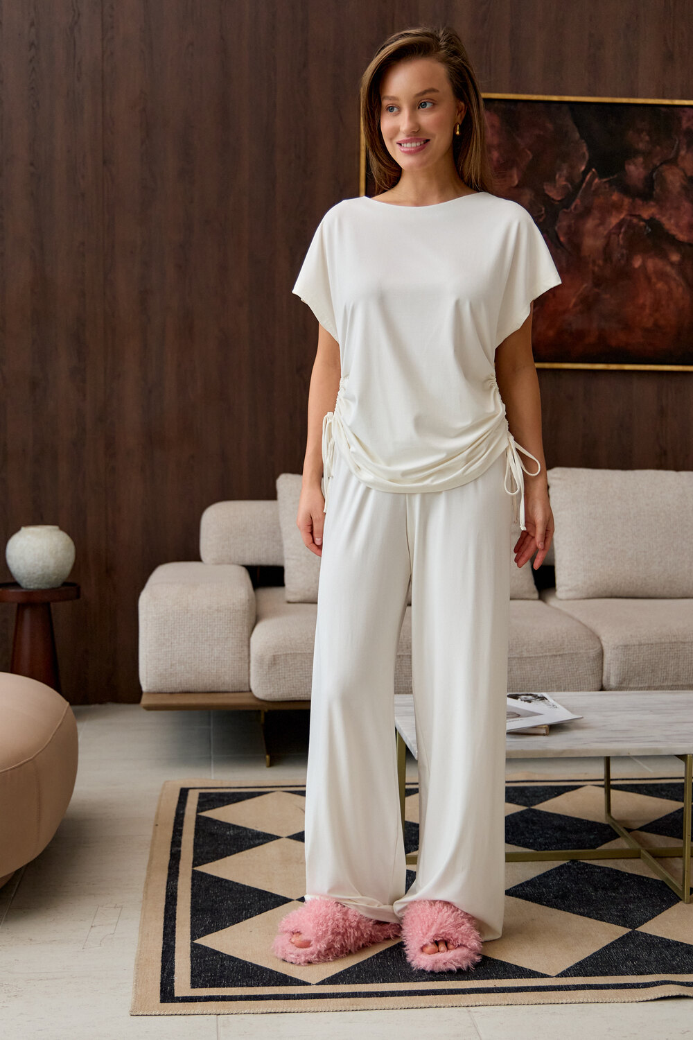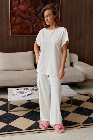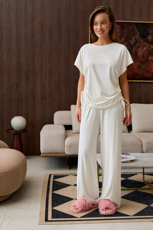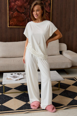 Представляем вам стильный комплект домашней пижамы женской, который станет незаменимым в вашем гардеробе. Этот костюм включает в себя футболку с завязками и с брюками палаццо, выполненный из премиальной вискозы, что обеспечивает невероятный комфорт и приятные ощущения на коже.