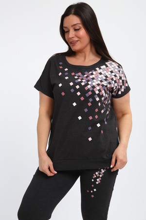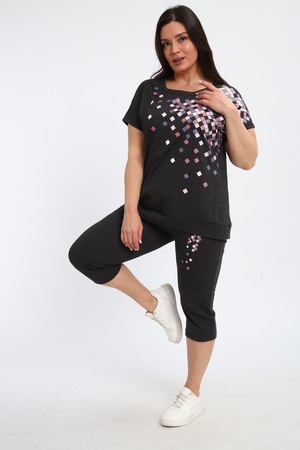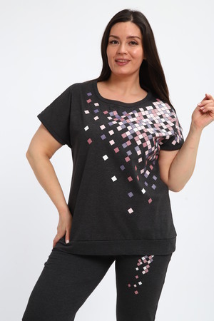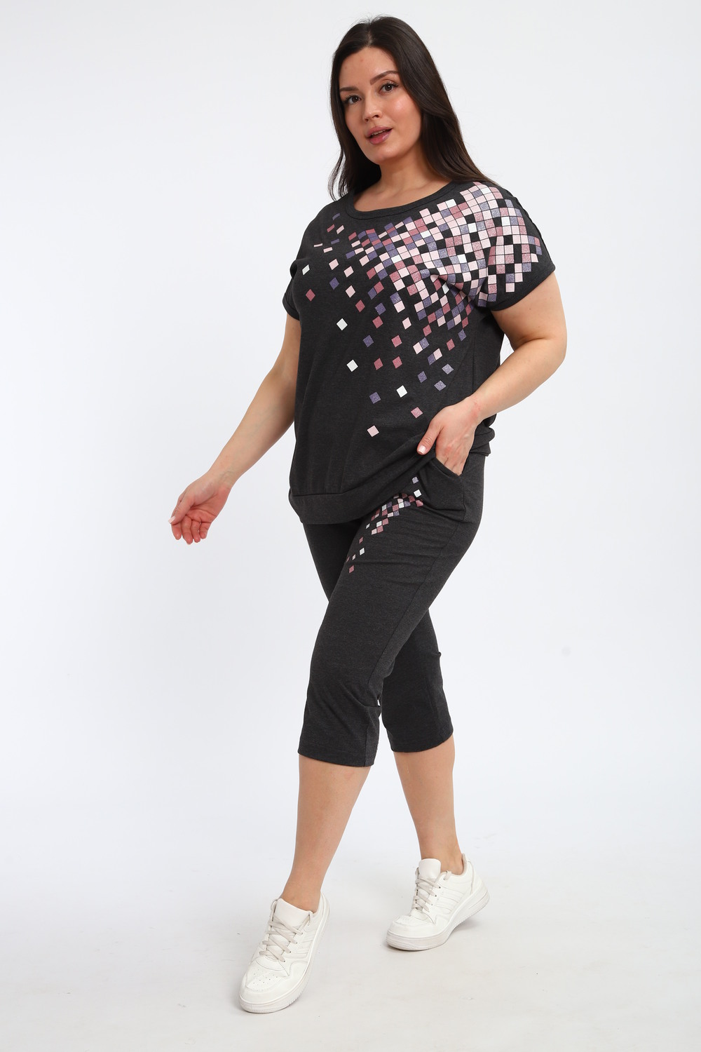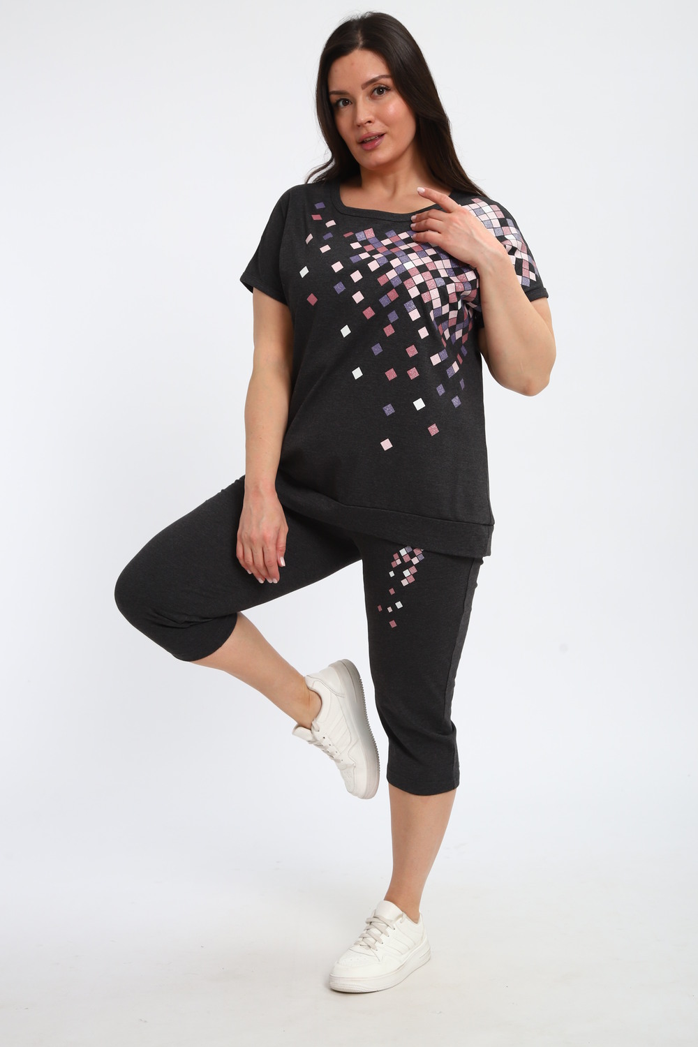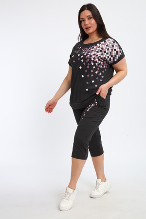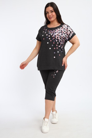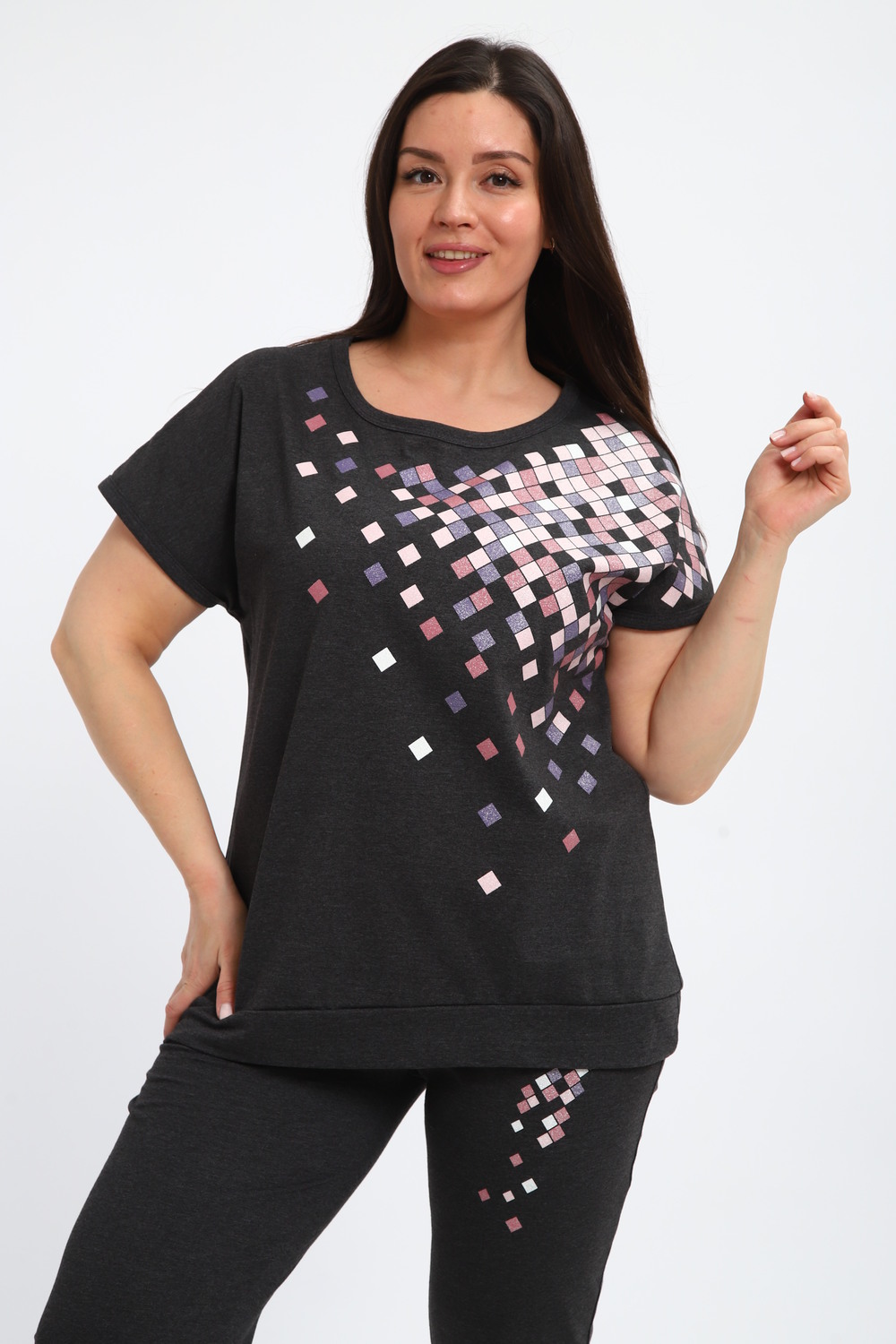 Женский домашний костюм с бриджами выполнен из комфортного материала, в составе которого 50% хлопок и 50% ПЭ, что обеспечивает приятные тактильные ощущения и простоту ухода. Модель представлена в графитовом цвете, изумрудном цвете и фисташковом цвете которые подчеркивают стиль и современность образа. Футболка имеет свободный крой, короткий рукав и круглый вырез, обеспечивая удобство и свободу движений в повседневной носке. На передней части футболки выполнена печать методом шелкографии, что гарантирует долговечность рисунка и устойчивость к стиркам. Бриджи средней длины, с эластичным поясом, хорошо сидят на фигуре и подходят для женщин больших размеров. Благодаря продуманной конструкции, костюм подходит для домашнего отдыха, прогулок и легких занятий спортом. Собственное производство гарантирует контроль качества на всех этапах изготовления. Материал дышащий и приятный к телу, не вызывает раздражения. Костюм с бриджами хорошо сохраняет форму после многочисленных стирок, не теряет насыщенность цвета и не деформируется.