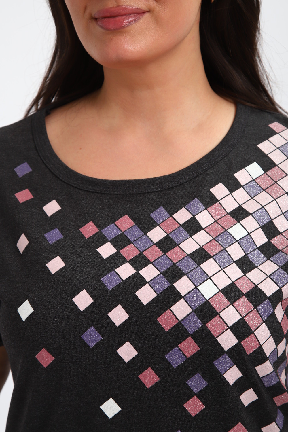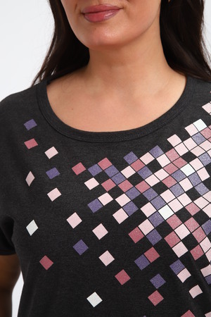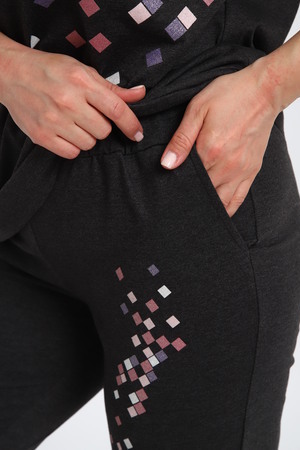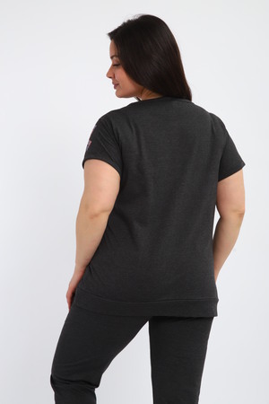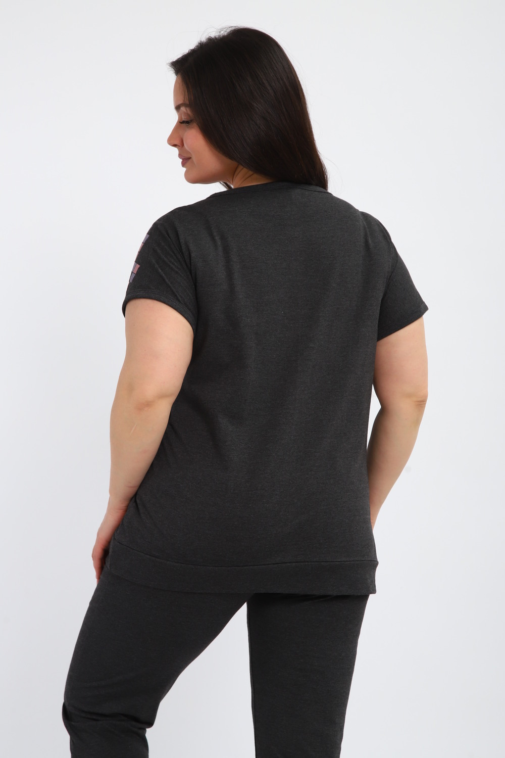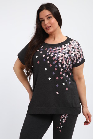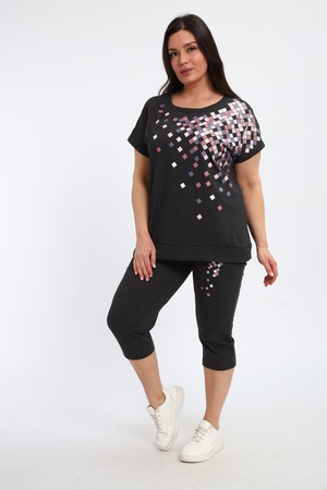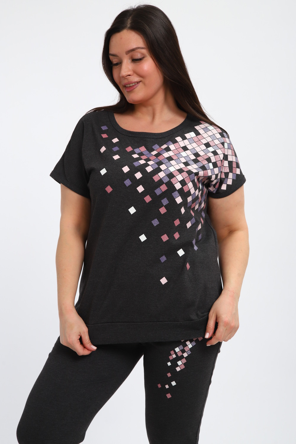 Женский домашний костюм с бриджами выполнен из комфортного материала, в составе которого 50% хлопок и 50% ПЭ, что обеспечивает приятные тактильные ощущения и простоту ухода. Модель представлена в графитовом цвете, изумрудном цвете и фисташковом цвете которые подчеркивают стиль и современность образа. Футболка имеет свободный крой, короткий рукав и круглый вырез, обеспечивая удобство и свободу движений в повседневной носке. На передней части футболки выполнена печать методом шелкографии, что гарантирует долговечность рисунка и устойчивость к стиркам. Бриджи средней длины, с эластичным поясом, хорошо сидят на фигуре и подходят для женщин больших размеров. Благодаря продуманной конструкции, костюм подходит для домашнего отдыха, прогулок и легких занятий спортом. Собственное производство гарантирует контроль качества на всех этапах изготовления. Материал дышащий и приятный к телу, не вызывает раздражения. Костюм с бриджами хорошо сохраняет форму после многочисленных стирок, не теряет насыщенность цвета и не деформируется.