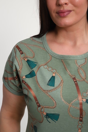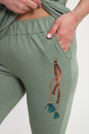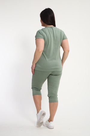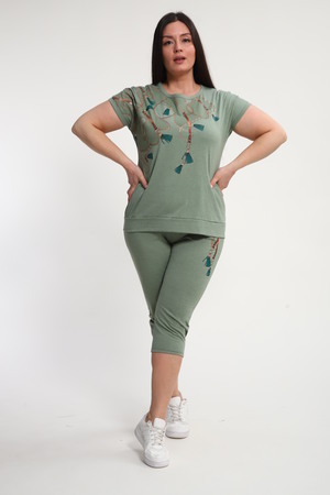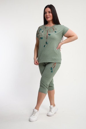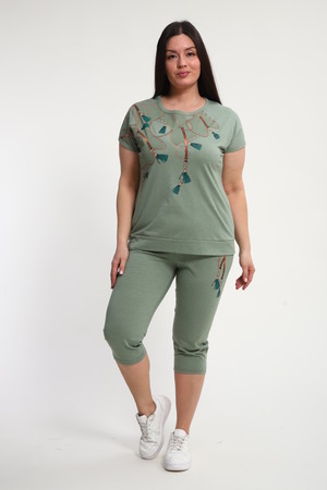 Женский домашний костюм с бриджами выполнен из комфортного материала, в составе которого 50% хлопок и 50% ПЭ, что обеспечивает приятные тактильные ощущения и простоту ухода. Модель представлена в графитовом цвете, изумрудном цвете и фисташковом цвете которые подчеркивают стиль и современность образа. Футболка имеет свободный крой, короткий рукав и круглый вырез, обеспечивая удобство и свободу движений в повседневной носке. На передней части футболки выполнена печать методом шелкографии, что гарантирует долговечность рисунка и устойчивость к стиркам. Бриджи средней длины, с эластичным поясом, хорошо сидят на фигуре и подходят для женщин больших размеров. Благодаря продуманной конструкции, костюм подходит для домашнего отдыха, прогулок и легких занятий спортом. Собственное производство гарантирует контроль качества на всех этапах изготовления. Материал дышащий и приятный к телу, не вызывает раздражения. Костюм с бриджами хорошо сохраняет форму после многочисленных стирок, не теряет насыщенность цвета и не деформируется.