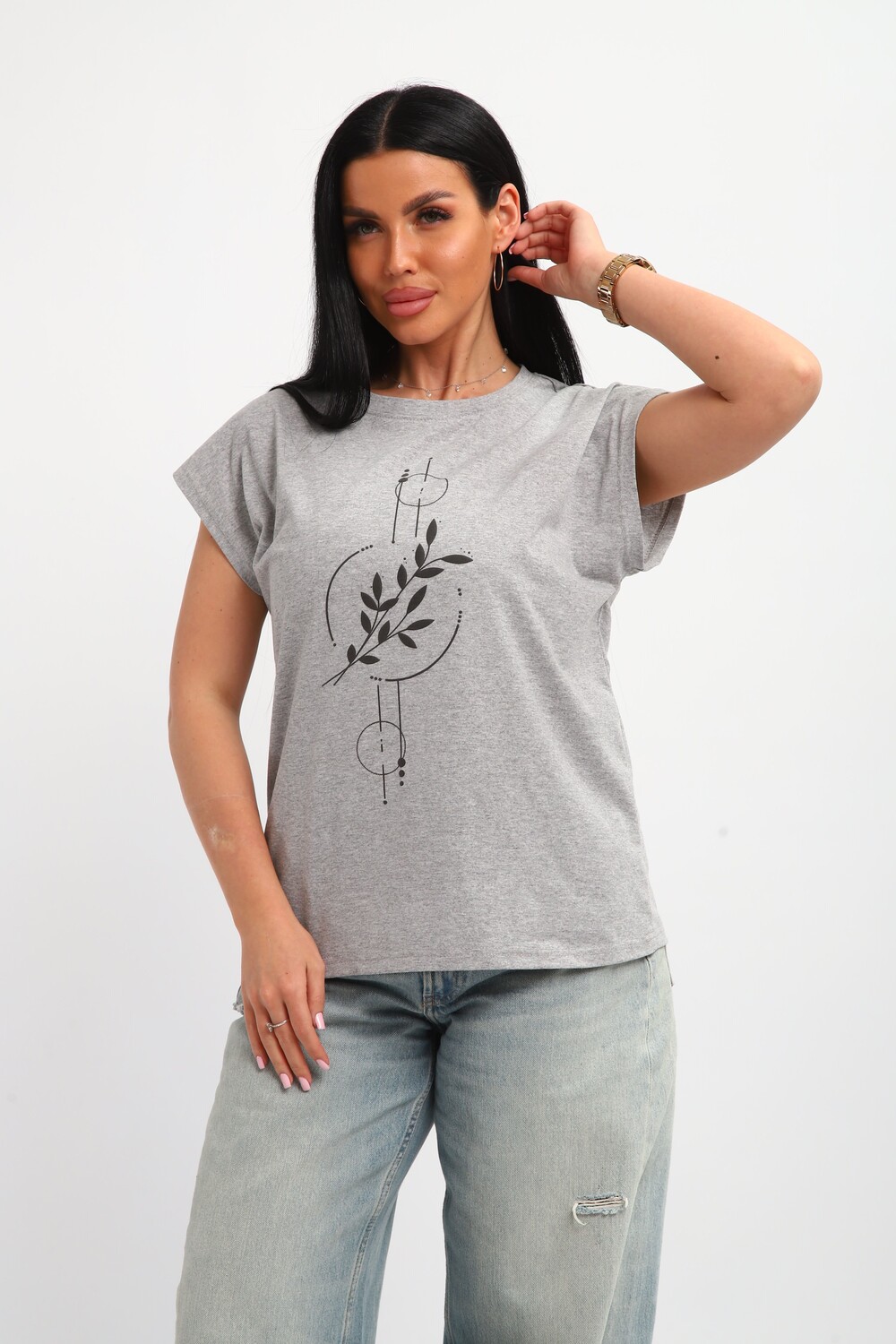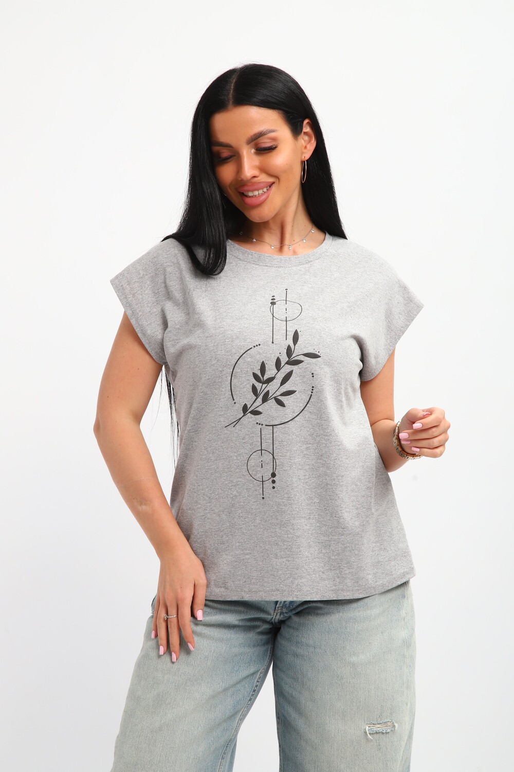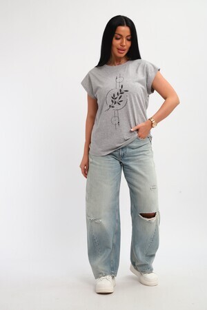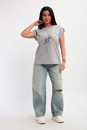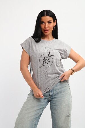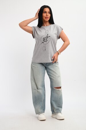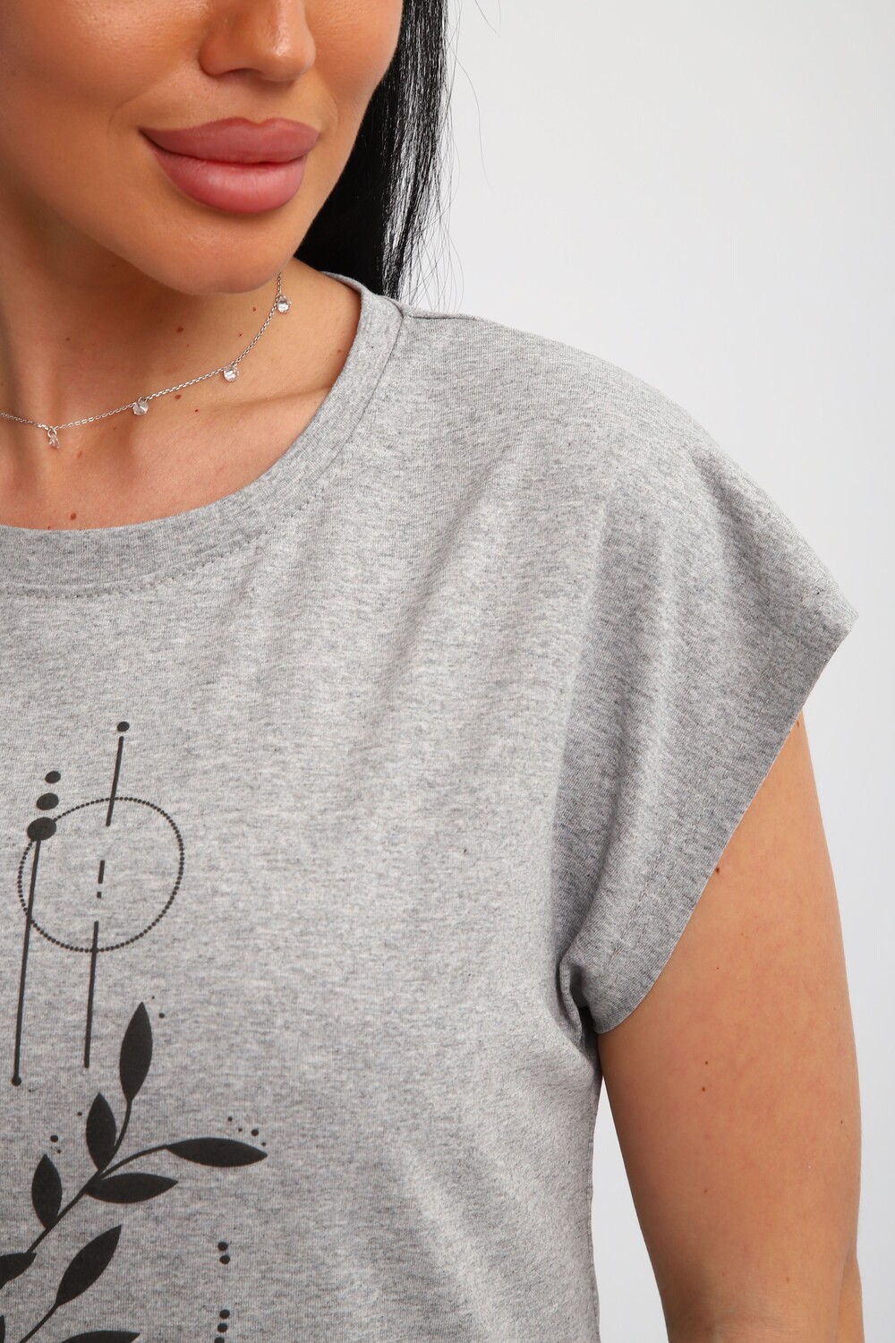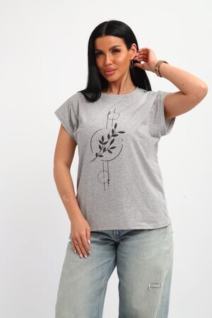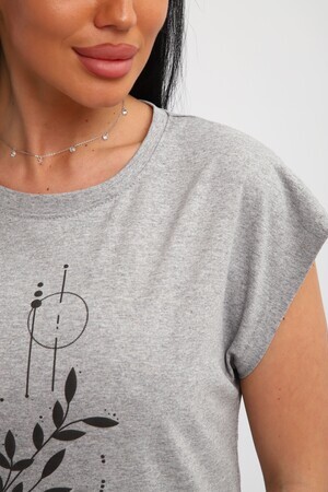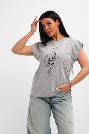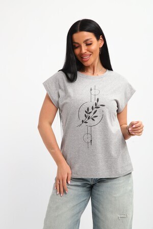 Футболка женская, изготовлена из меланжированного трикотажа. Горловина круглой формы, плечо спущено, без рукава. Низ изделия прямой. На полочке эффектный принт, выполненный методом шелкографии.