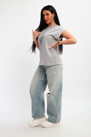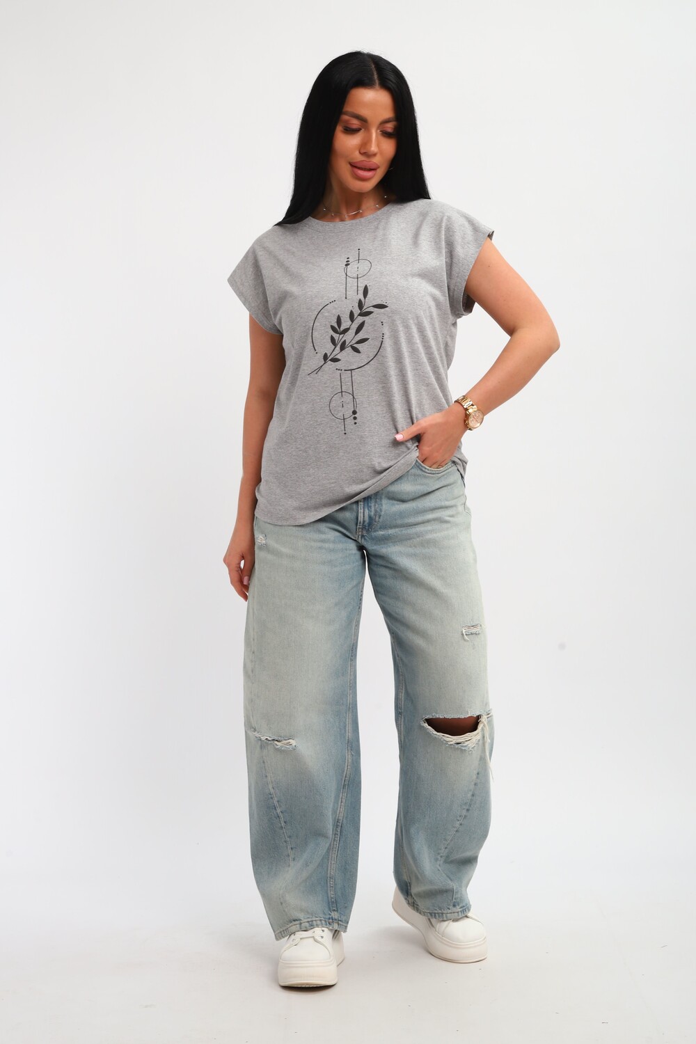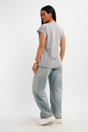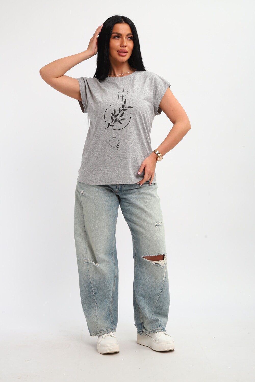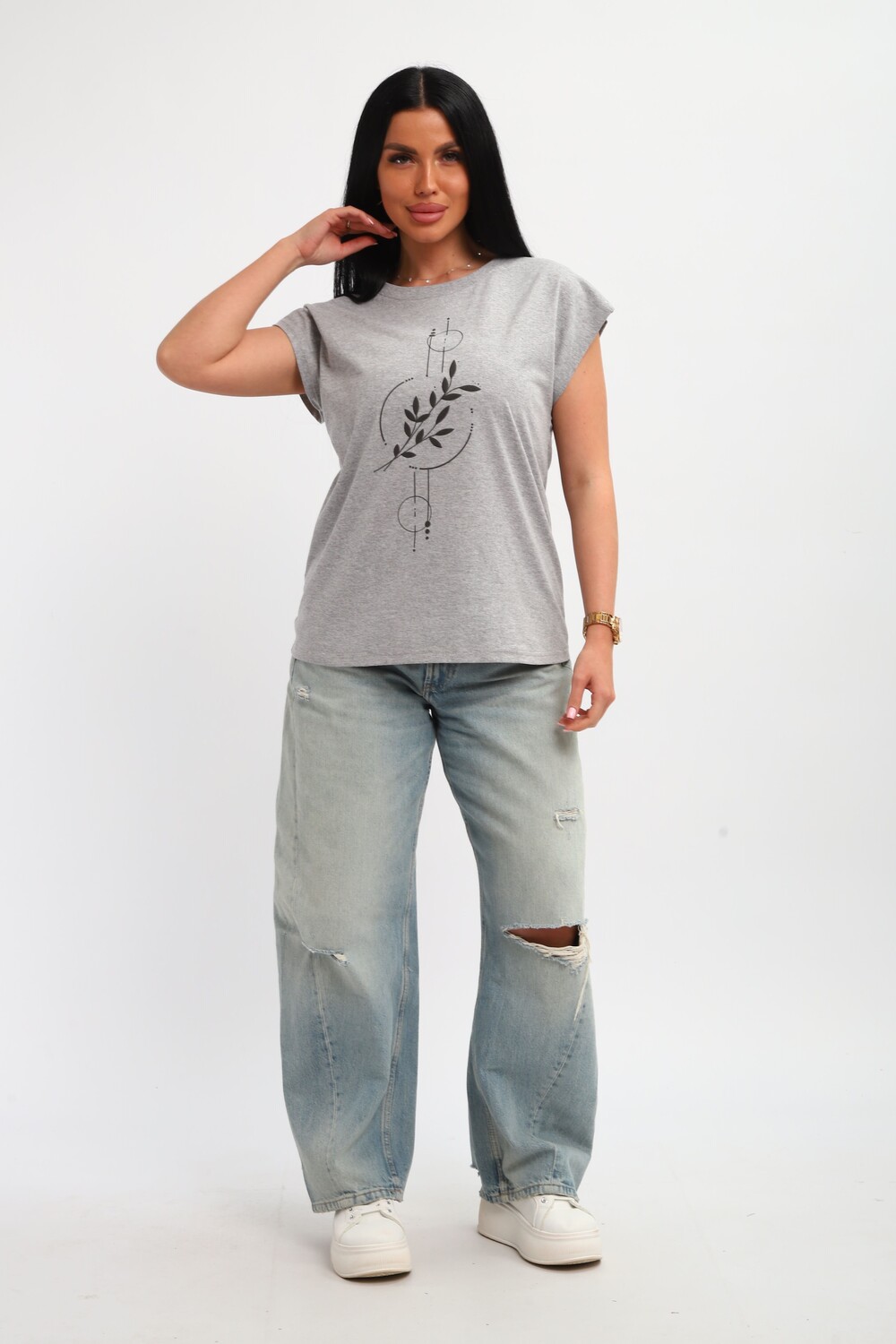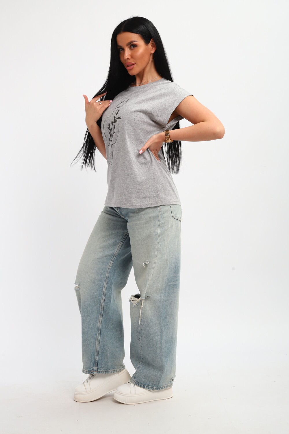 Футболка женская, изготовлена из меланжированного трикотажа. Горловина круглой формы, плечо спущено, без рукава. Низ изделия прямой. На полочке эффектный принт, выполненный методом шелкографии.