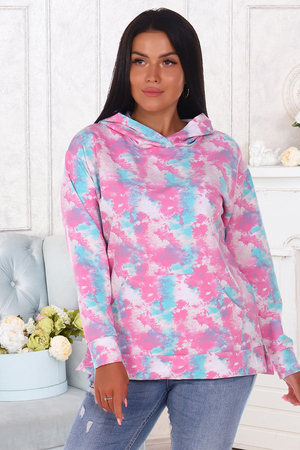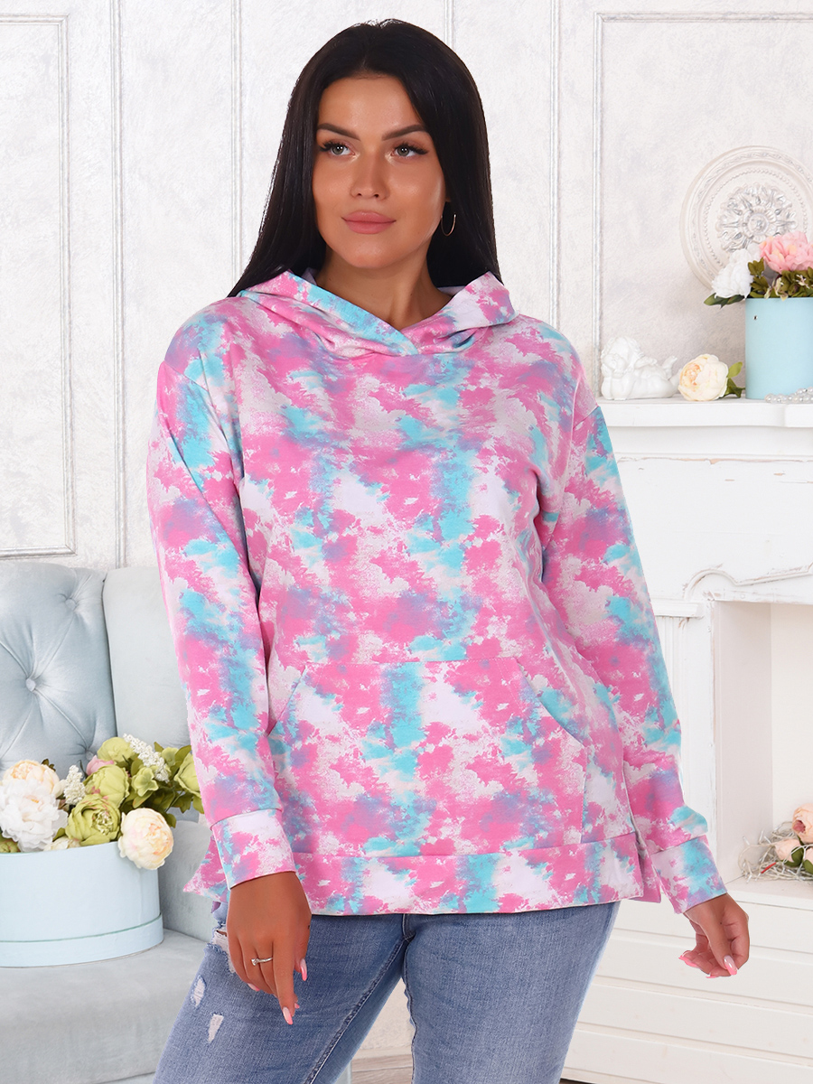 Толстовка женская со спущенным рукавом на манжете, двойным капюшоном, накладным карманом, в боковых швах разрезы.
