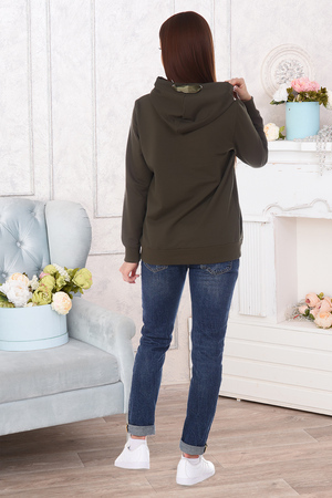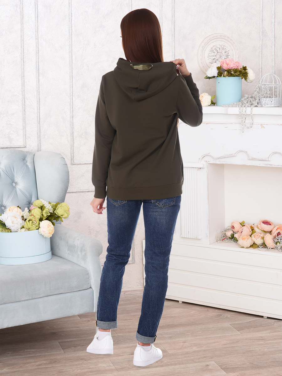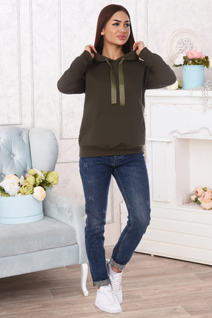 Толстовка женская из набивного футера с двойным капюшоном, длинным рукавом. На детали переда накладной карман-кенгуру. Манжеты и пояс из кашкорсе. В капюшоне декоративная лента.
