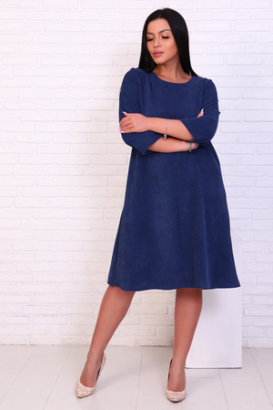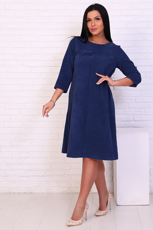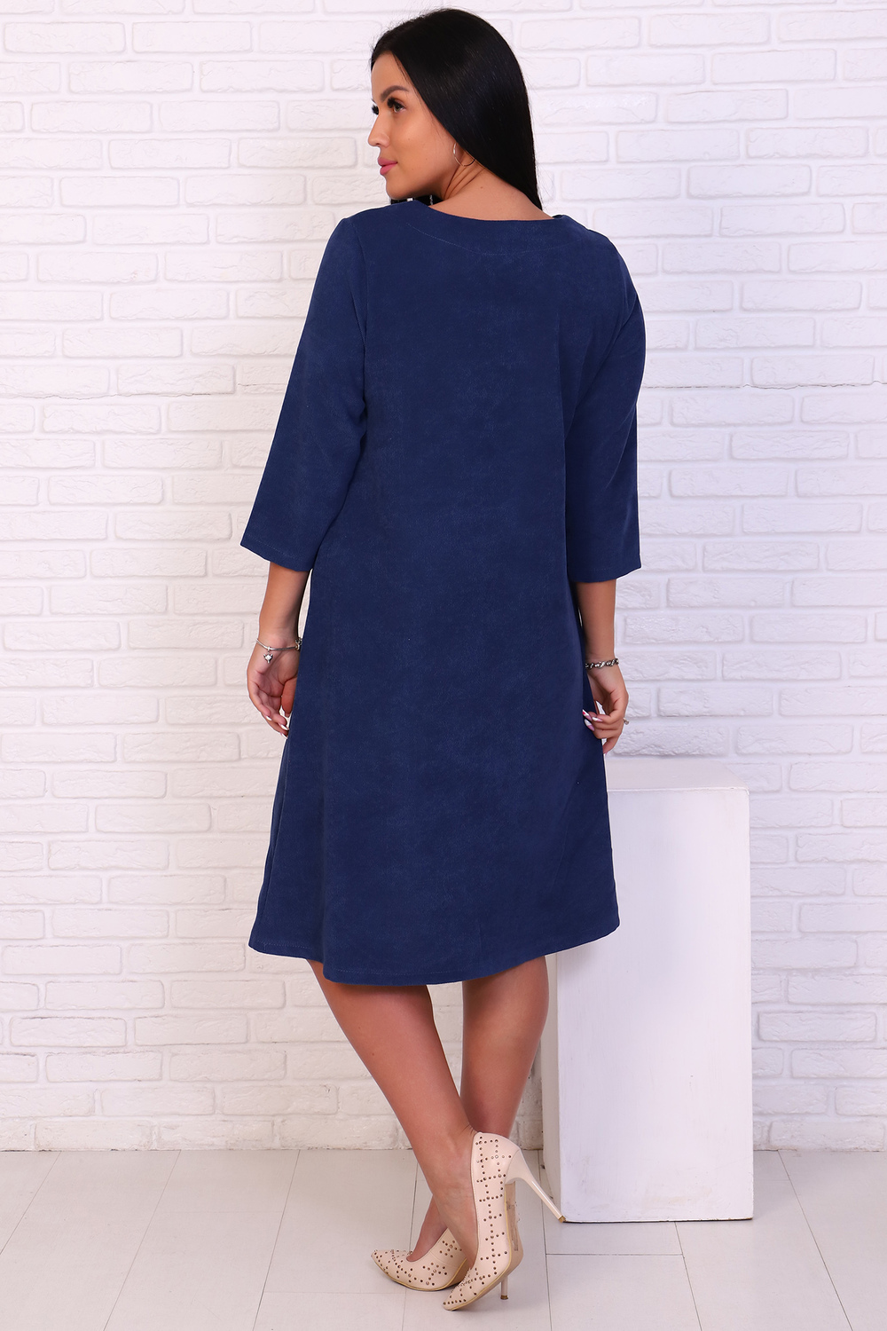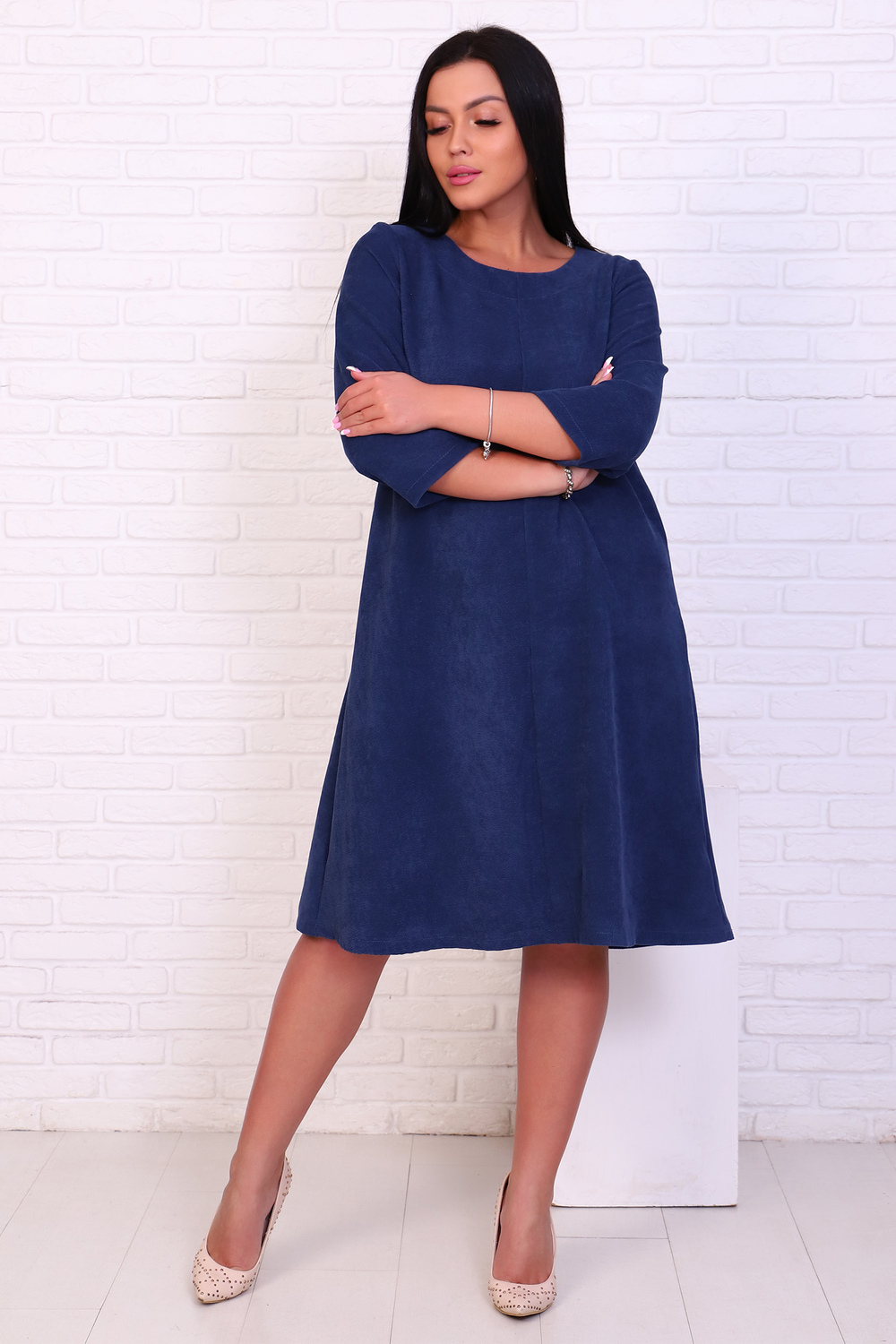 Женственное платье из фактурной ткани с рукавом ниже локтя и расклешенным низом.