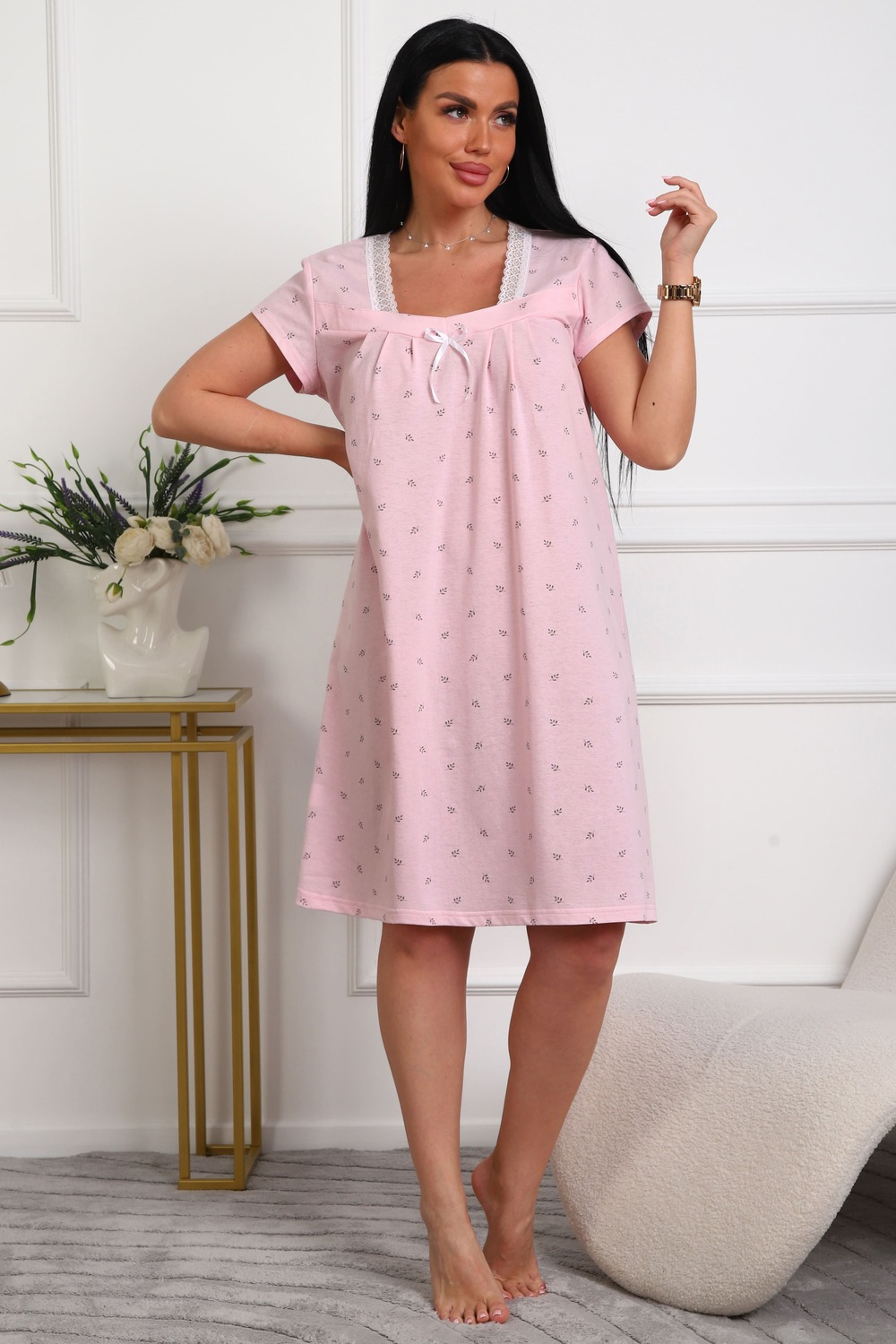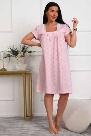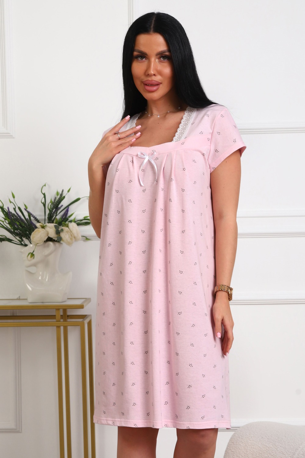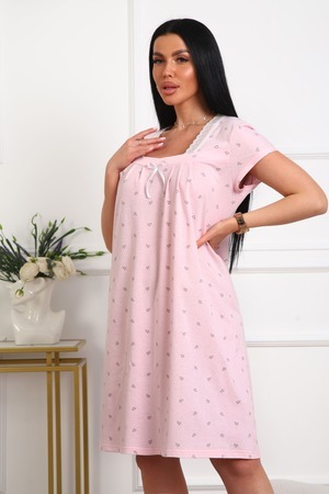 Сорочка женская из кулирки. Силуэт прямой, длина чуть ниже колен, вырез горловины фигурный, рукав короткий, отделка кружево по горловине.