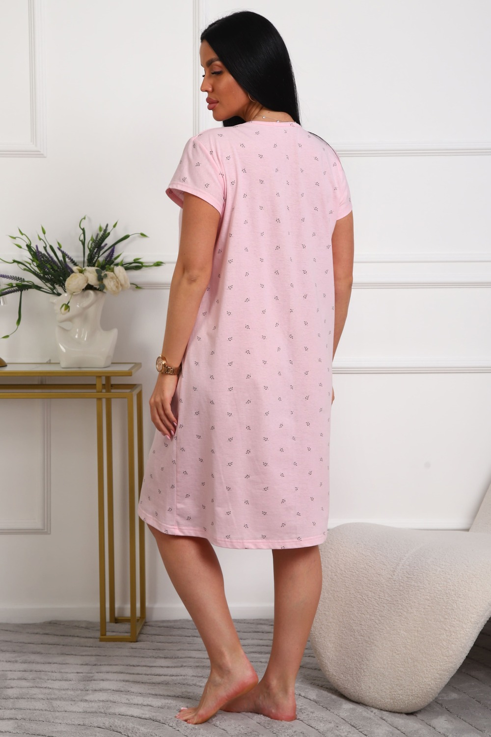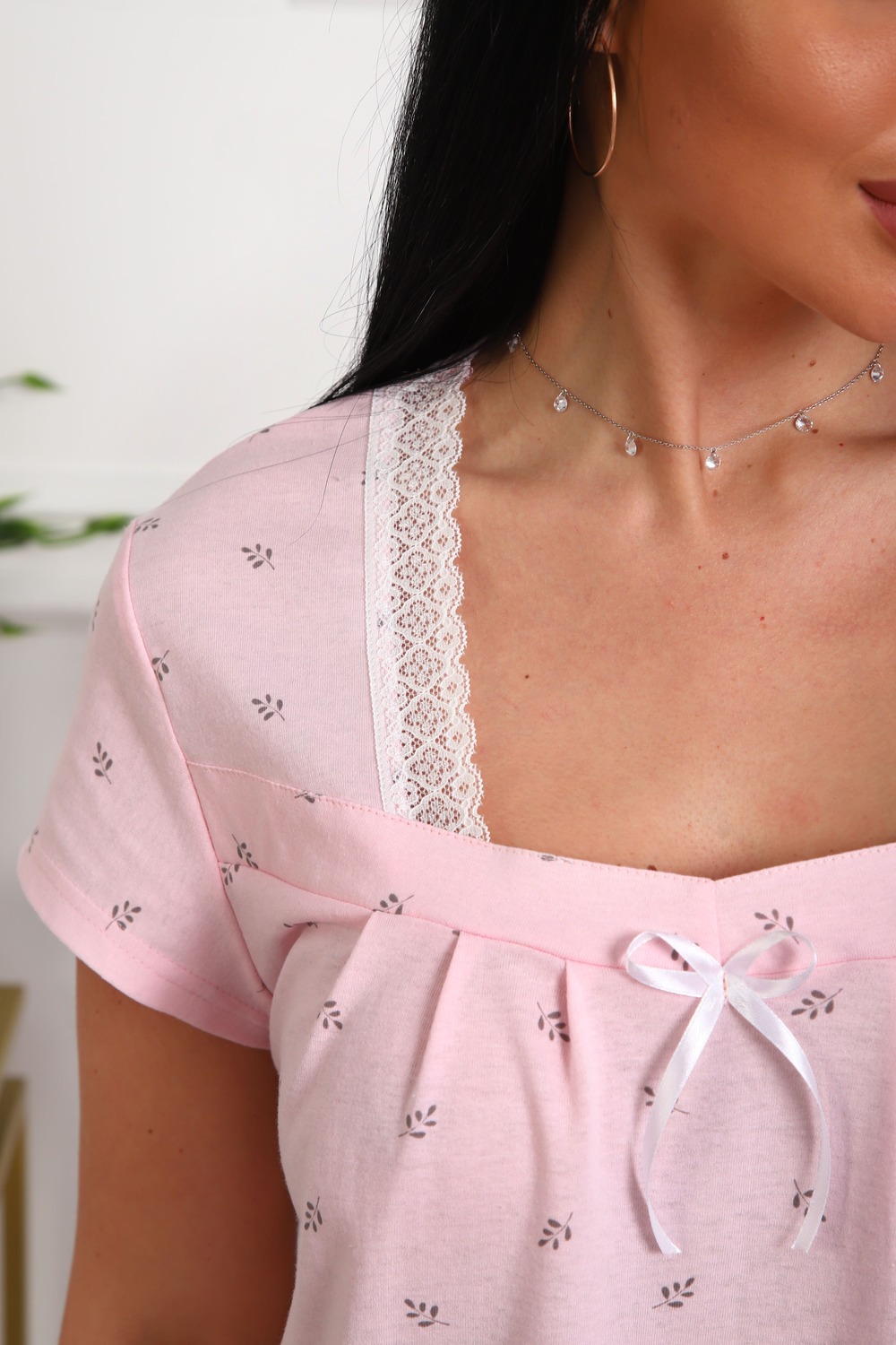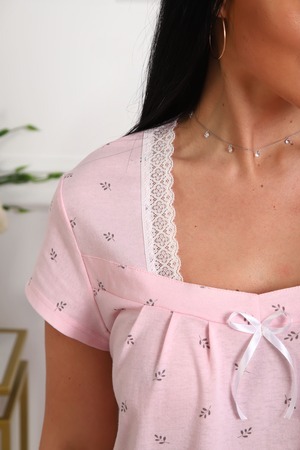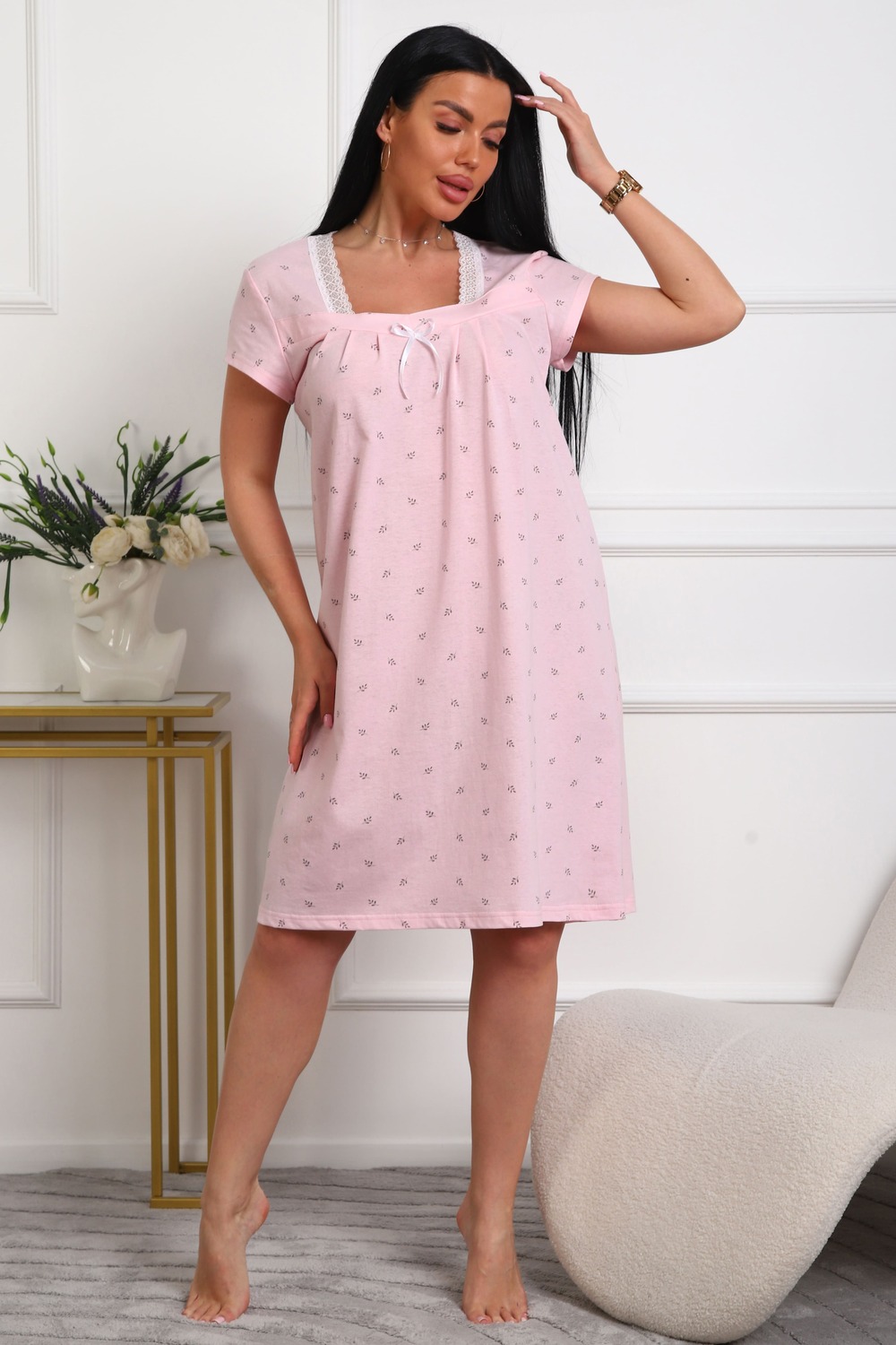 Сорочка женская из кулирки. Силуэт прямой, длина чуть ниже колен, вырез горловины фигурный, рукав короткий, отделка кружево по горловине.