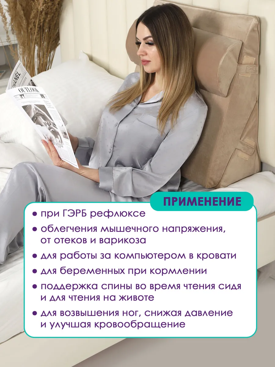 Подушка подходит: — для отдыха на кровати и диване — для поддержки спины во время сидения — для чтения и работы — для размещения под ногами и коленями — для использования дома, на даче и в поездках