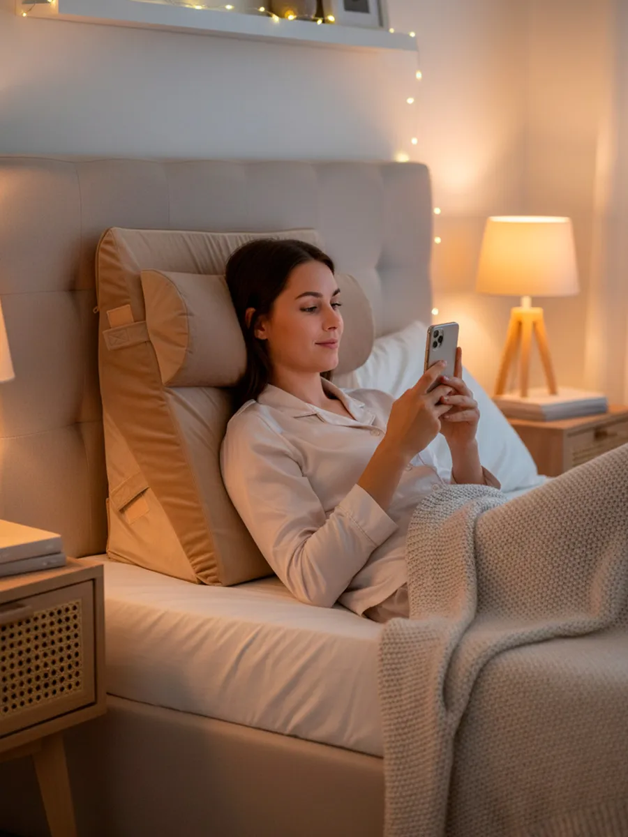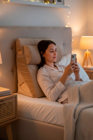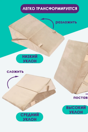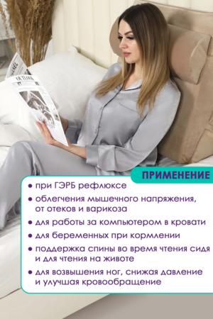 Модель отлично подходит для чтения, просмотра телевизора и работы за ноутбуком. Регулируемый угол наклона от 30 до 60 градусов позволяет легко подобрать оптимальное положение — для расслабления, поддержки спины сидя или размещения под ногами и коленями. Наклон в 30 градусов удобен при рефлюксе (ГЭРБ), а наклон в 60 градусов идеально подходит для поддержки коленей.