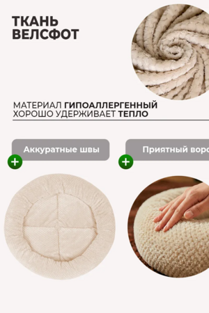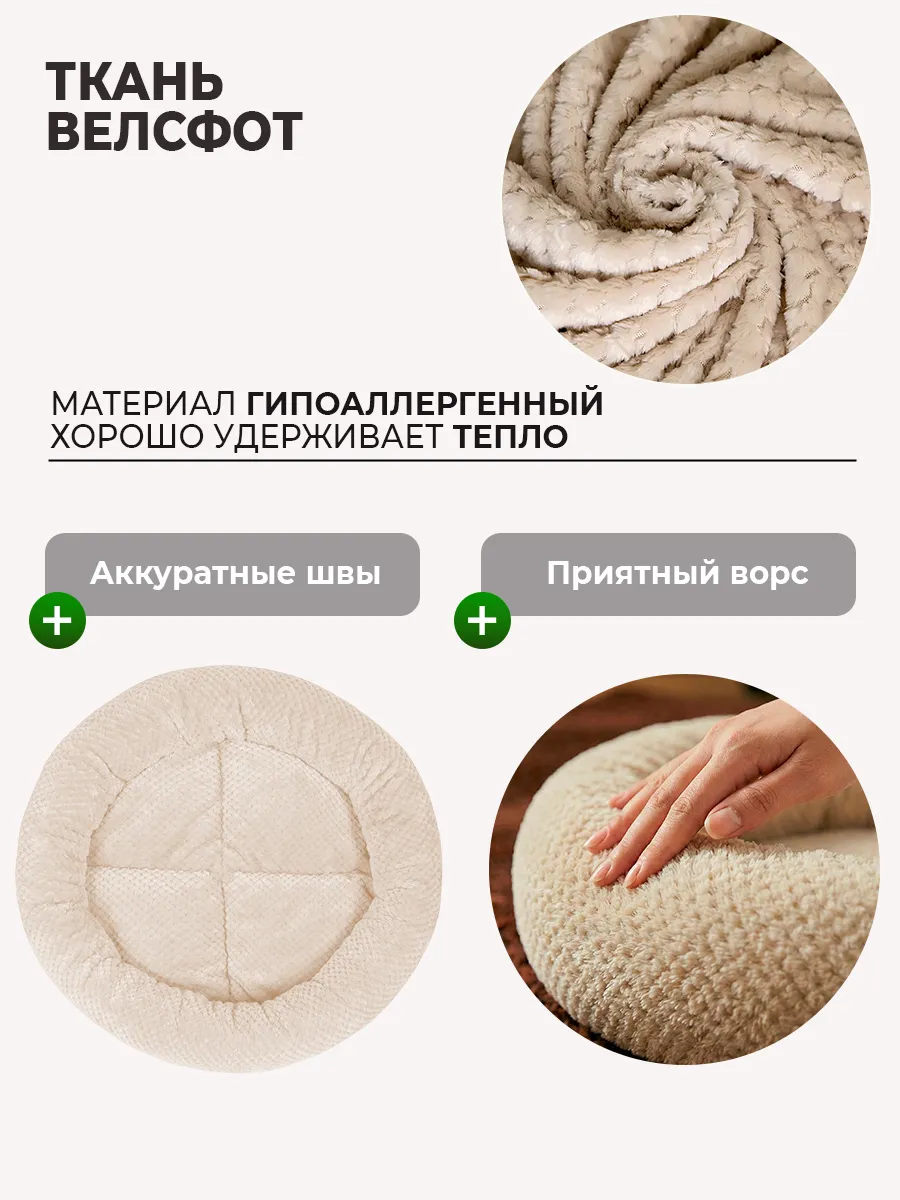 Круглая лежанка для кошек и котят выполнена из приятного и мягкого на ощупь материала. Наши лежанки – это идеальный выбор для кошечек и собачек, обеспечивающих вашим питомцам максимальное удобство. Если ваш котик любит развалиться в мягком домике, а маленькая собака — терьер или корги — ищет укромное местечко, наши спальные зоны станут отличным решением.