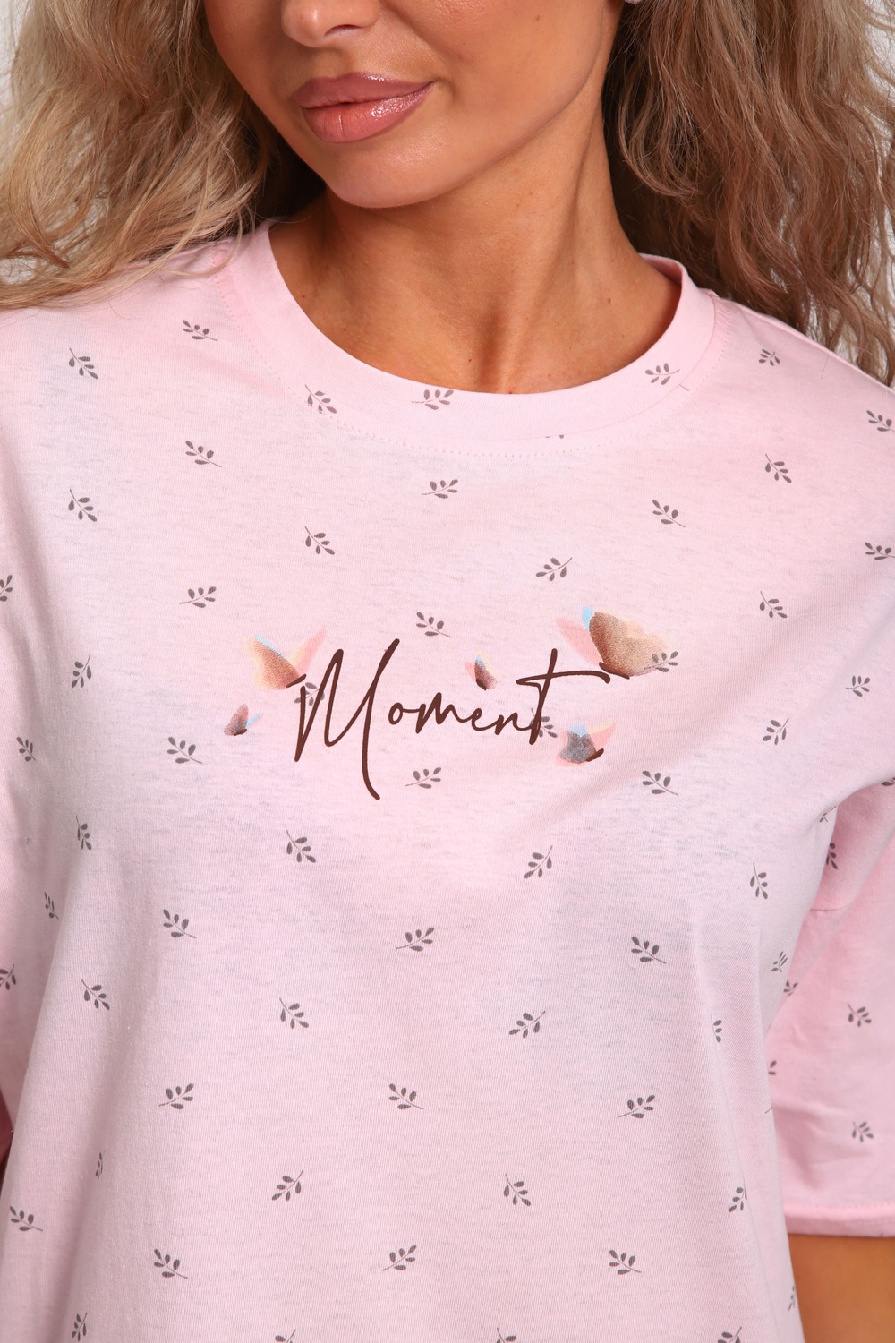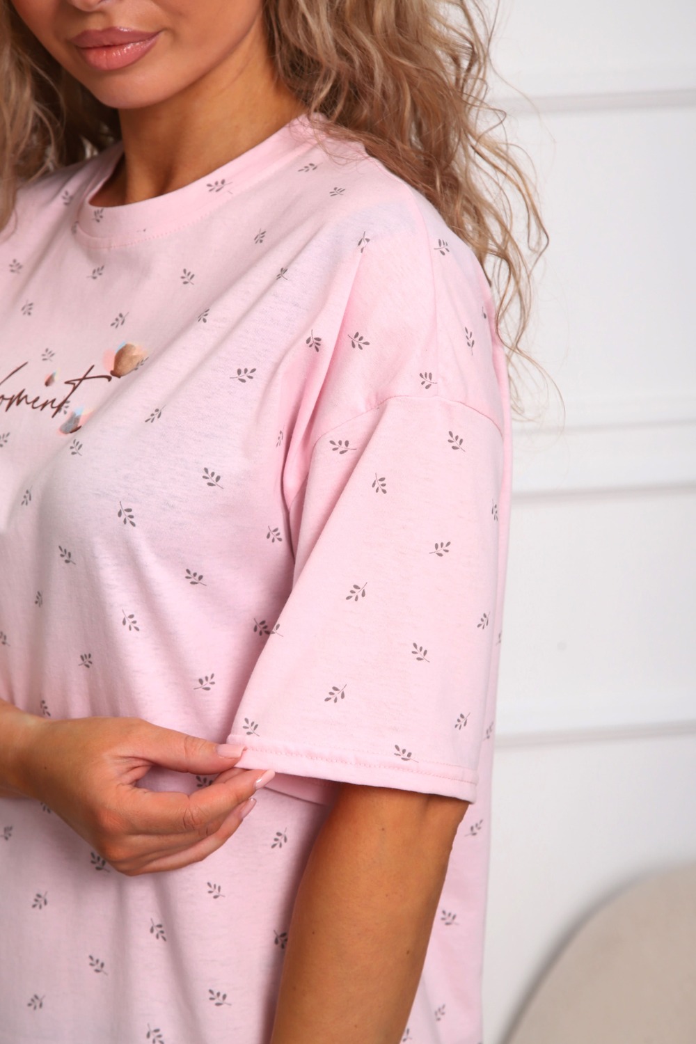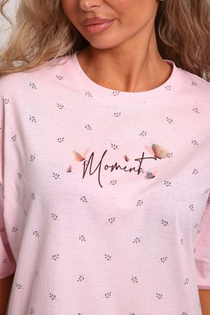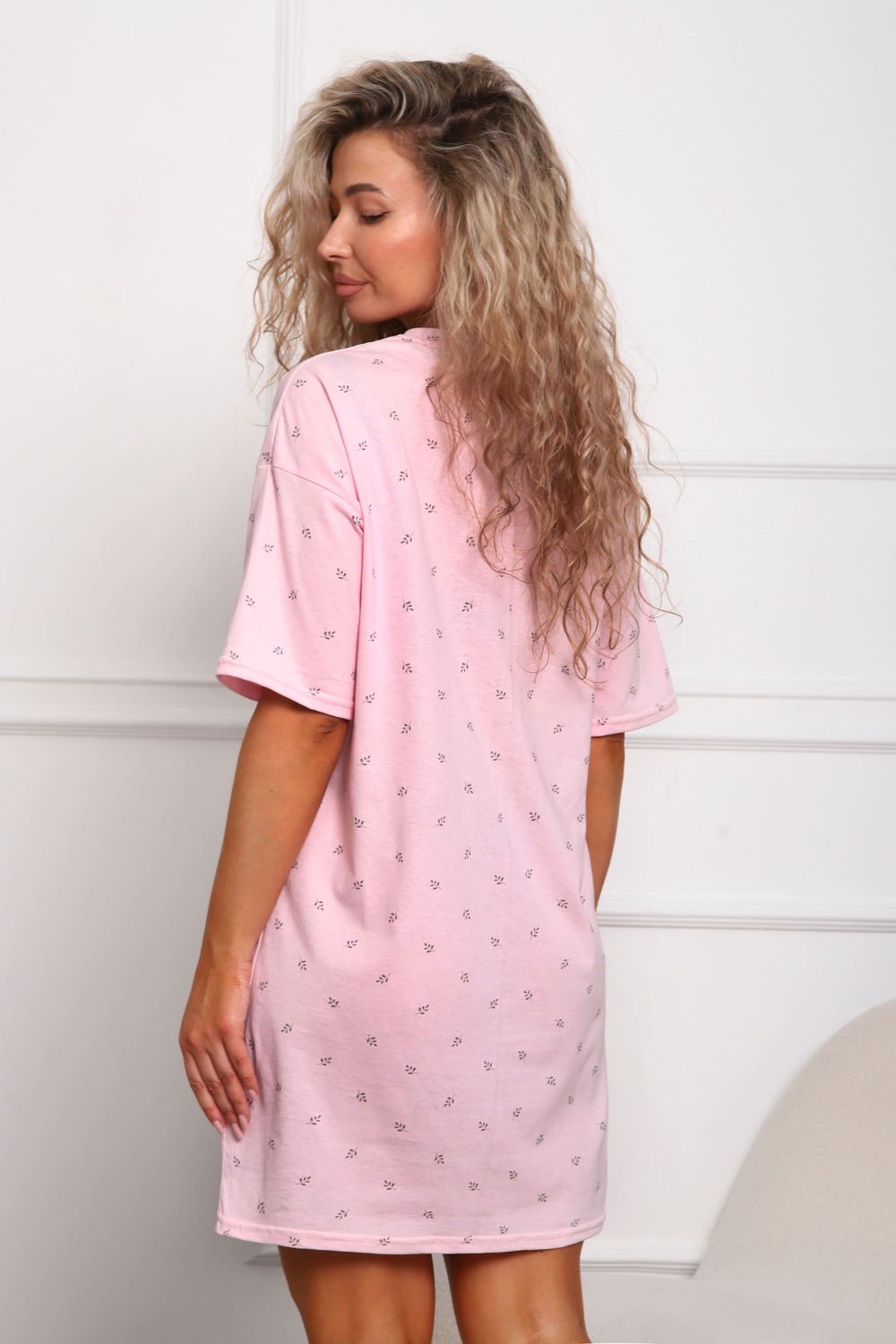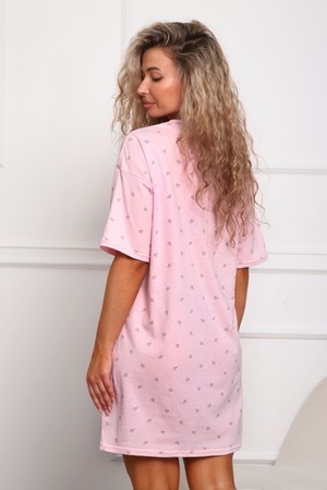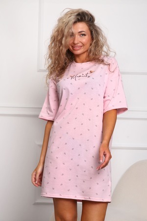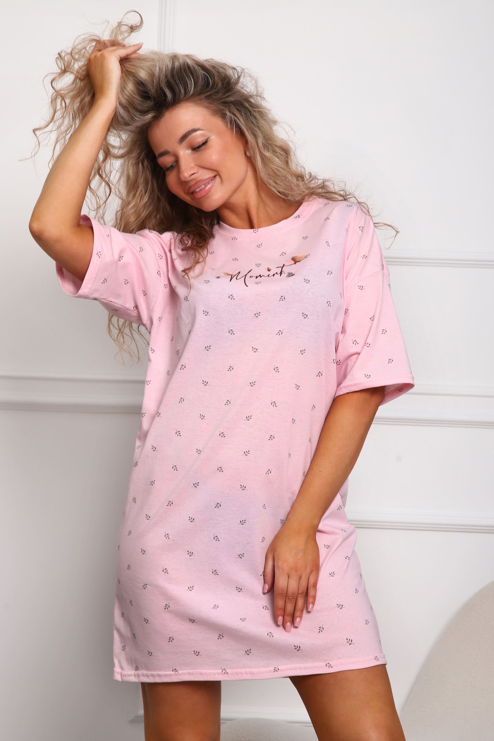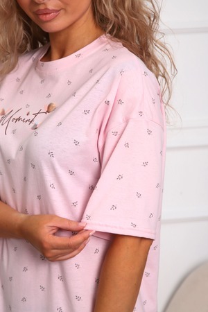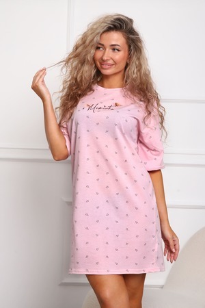 Сорочка женская прямого силуэта. Низ изделия прямой. Длинна выше колена, плечо спущенное, рукав короткий. Горловина круглой формы, обработана планкой с отделочной строчкой по шву притачивания. Принт (шелкография) располагается по центру переда.