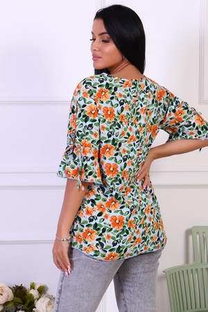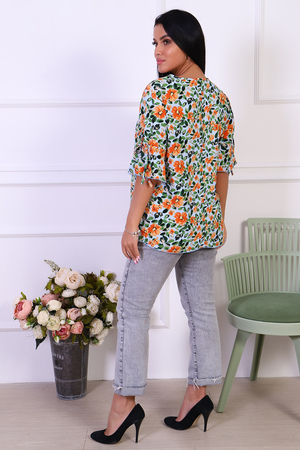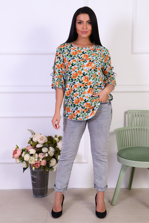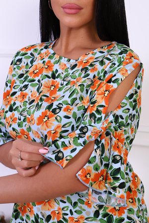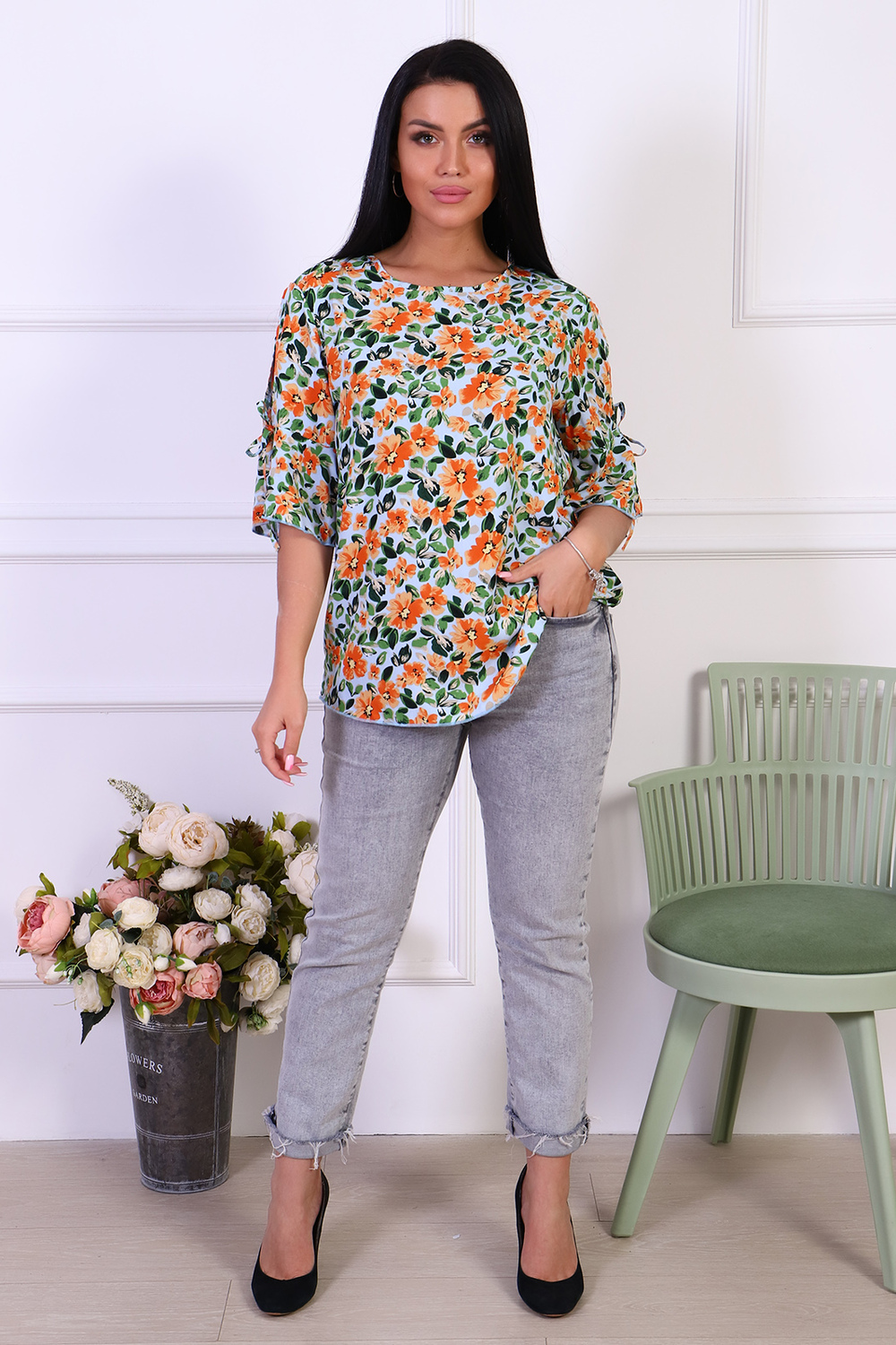 Романтичная туника с цветочным принтом из штапеля. Оригинальные рукава с завязками и воланами. Горловина туники окантована, низ рукавов и изделия обработан декоративной строчкой.