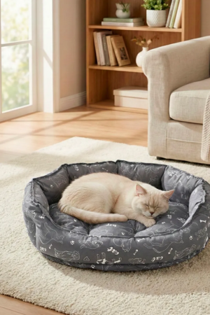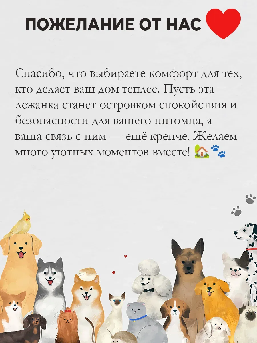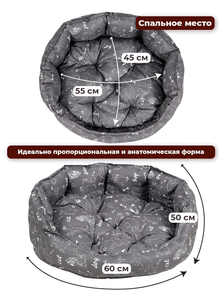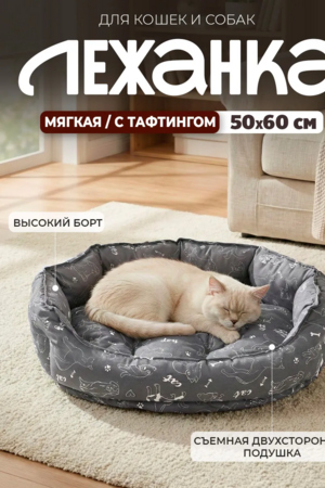 Размер лежанки 50×60 см — универсальный вариант для большинства домашних питомцев. Лежак для кошки или собаки легко разместить в любой комнате: возле дивана, кровати или в любимом месте питомца. Спальное место для животных также удобно брать с собой в машину или в поездки.
