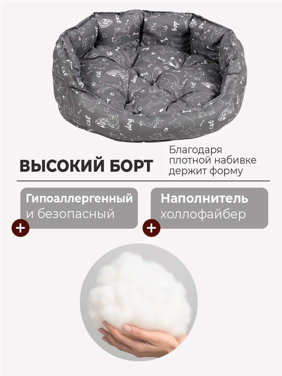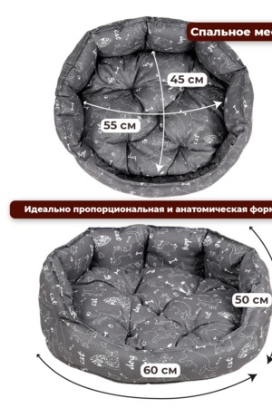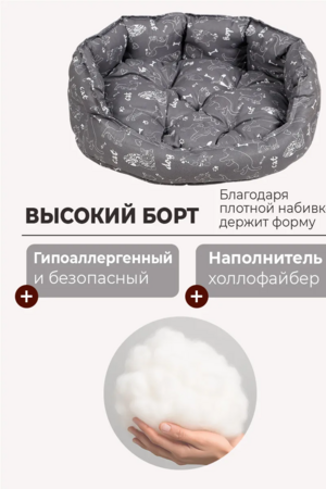 Лежанка для кошек и собак имеет удобную овальную форму и мягкие высокие бортики. Такой лежак для животных напоминает маленький диванчик и создаёт комфортное место для отдыха. Высокие борта можно использовать как подушку, благодаря чему лежанка для кошки или собаки становится ещё более удобной.