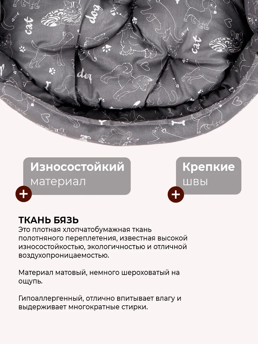Мягкий лежак для кошки выполнен из натуральной ткани бязь с плотным плетением нитей. Материал прочный, износостойкий и приятный на ощупь, поэтому лежанка для животных подходит для ежедневного использования дома, в квартире или на даче.