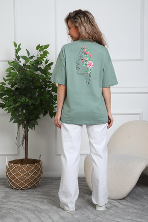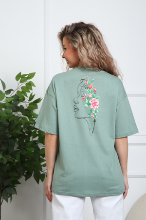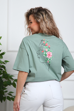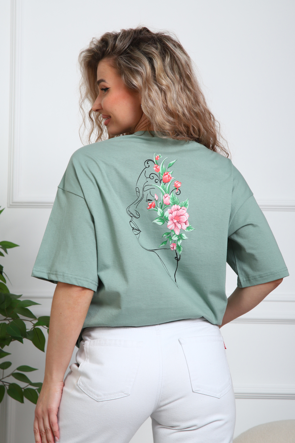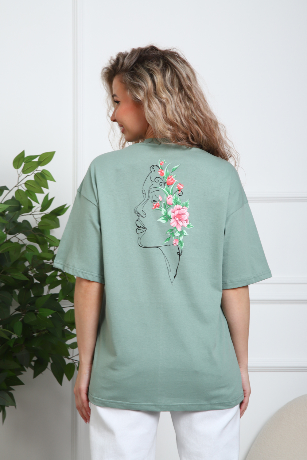 Футболка женская прямого силуэта, с коротким рукавом. Горловина приточная, круглой формы, с отделочной строчкой. Принт на задней полочке изделия.
