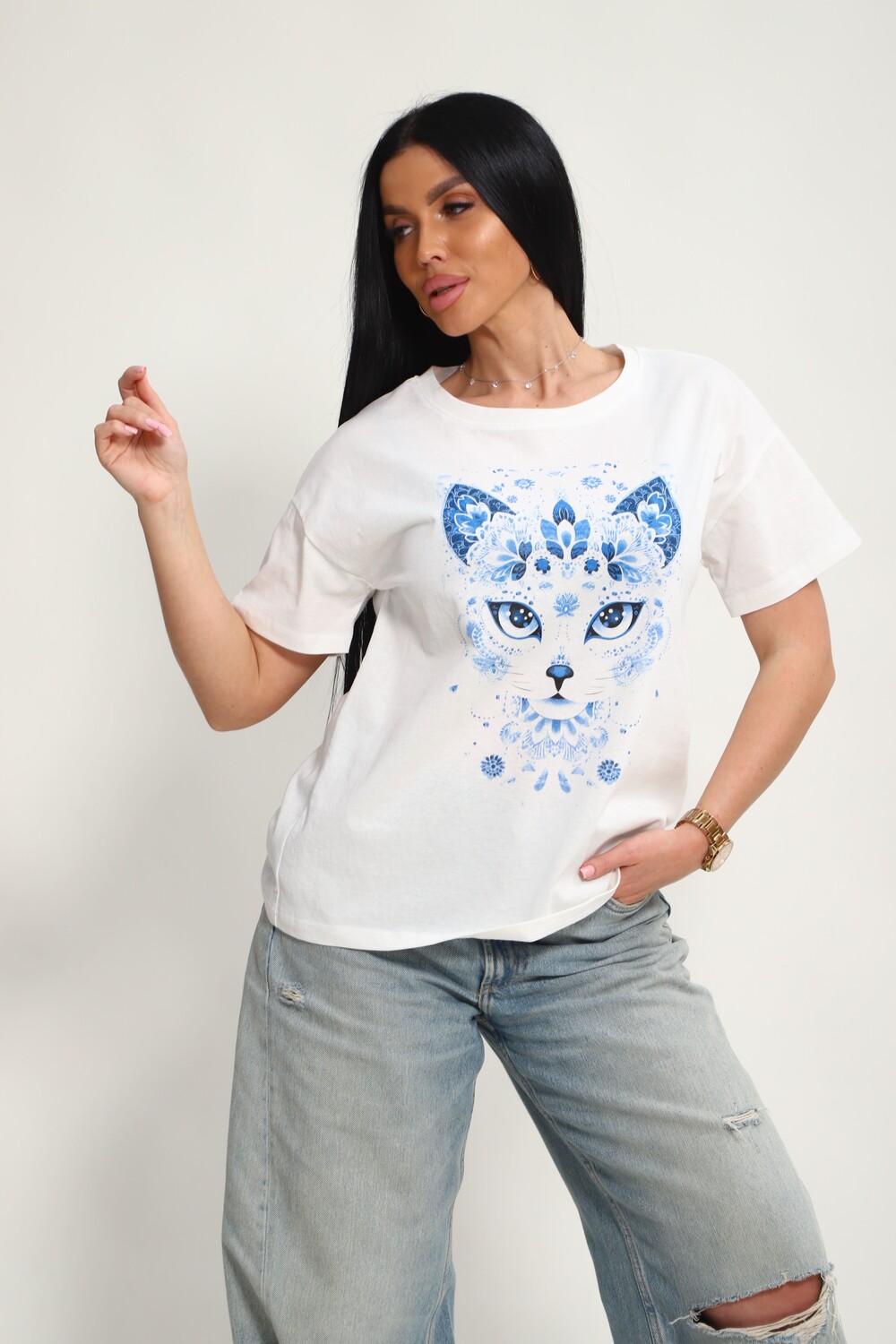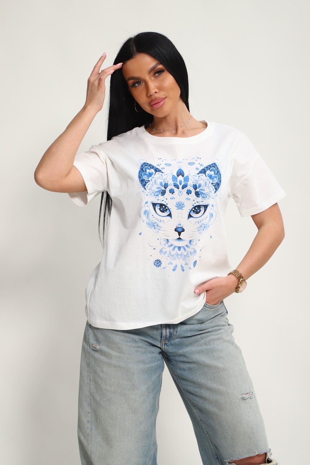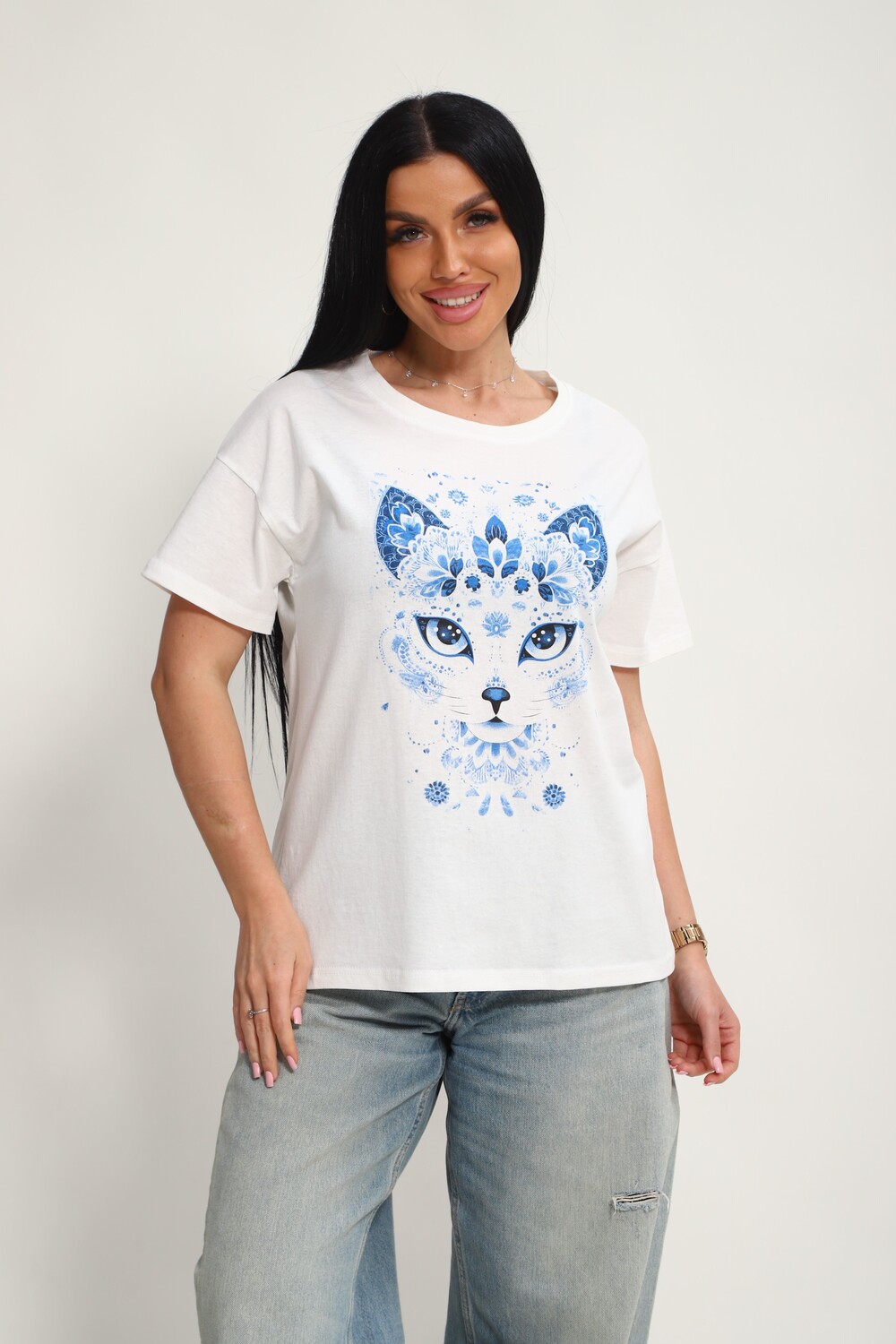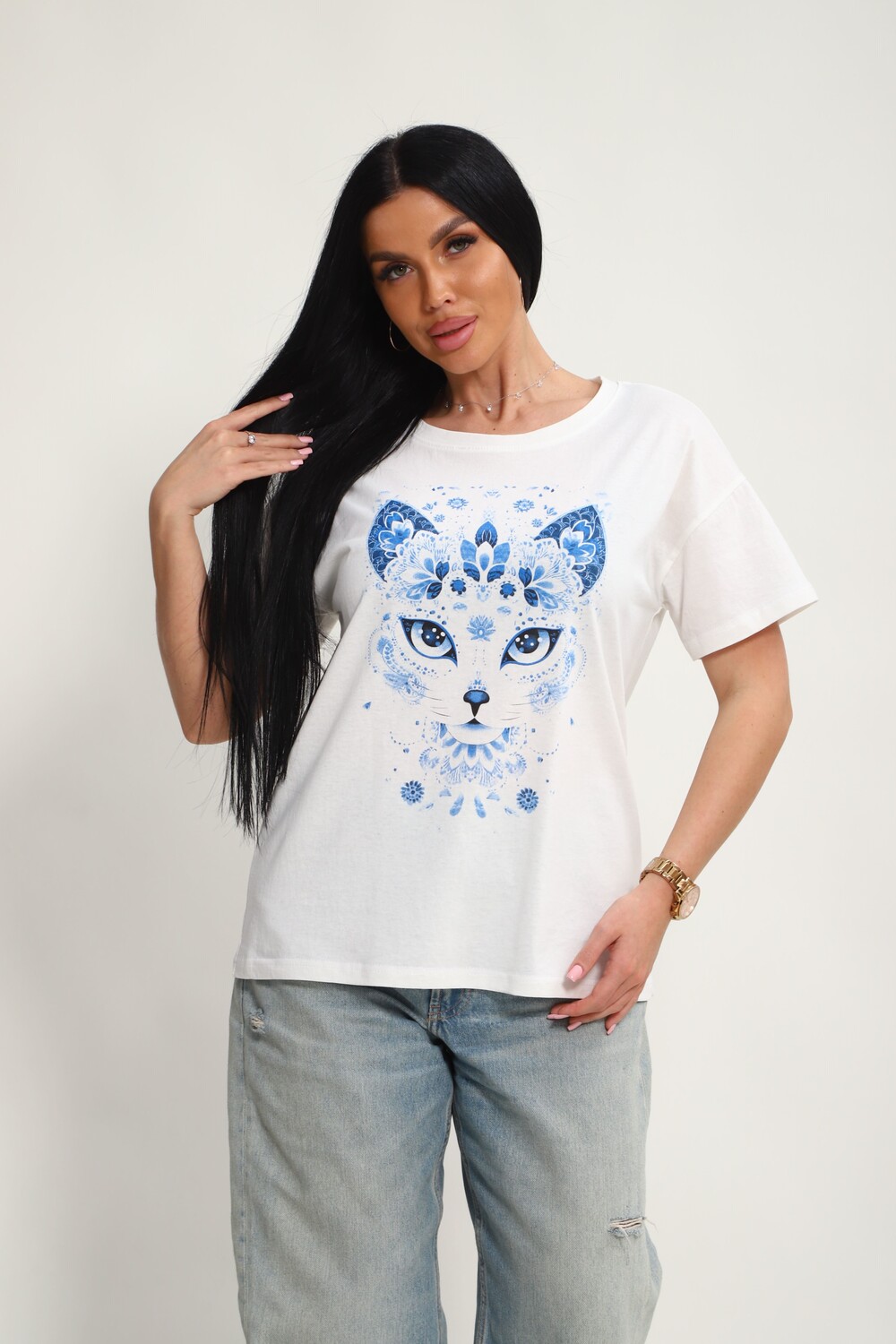 Футболка женская из гладкокрашеного трикотажа, хлопок 100%. Прямого силуэта, свободного облегания, горловина круглой формы. Рукав короткий. Низ изделия прямой. На полочке принт, шелкография.
