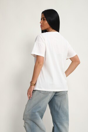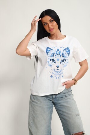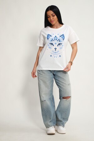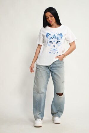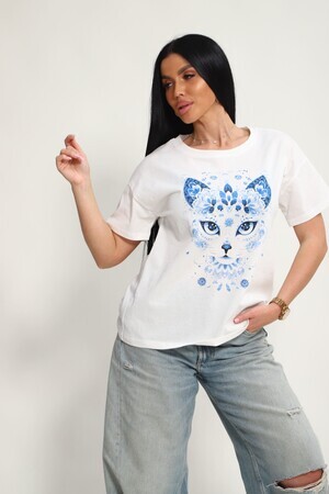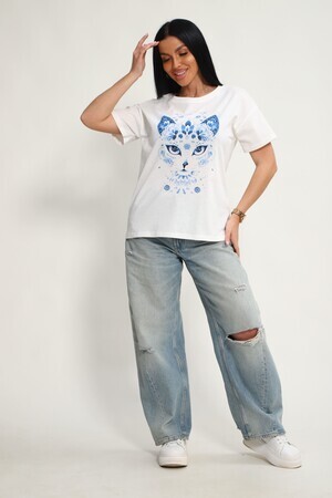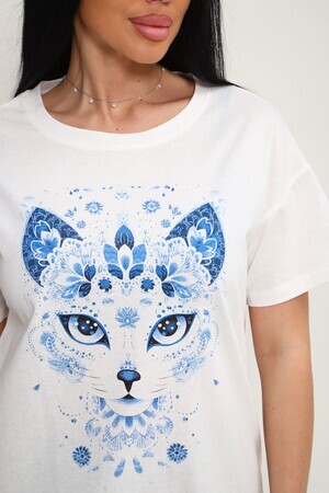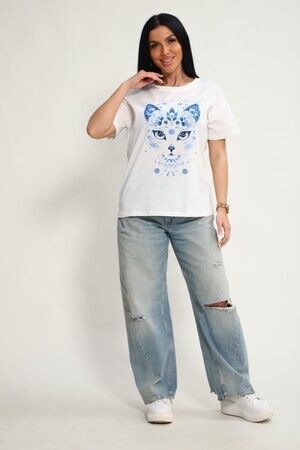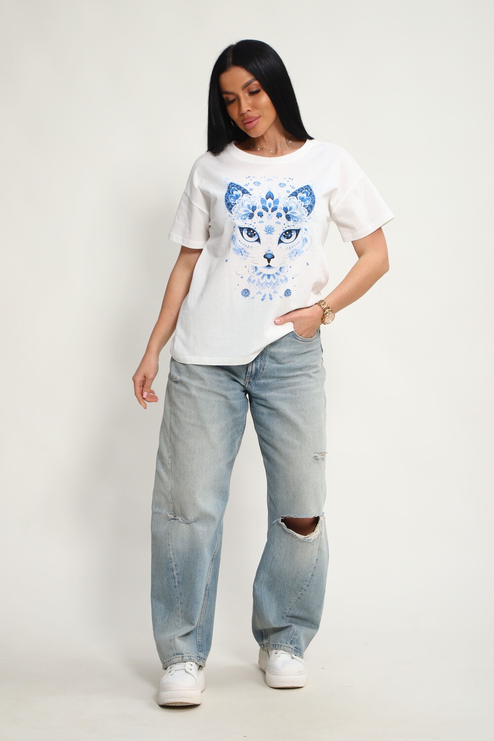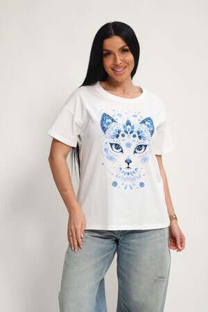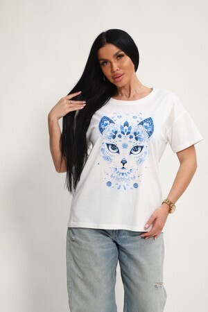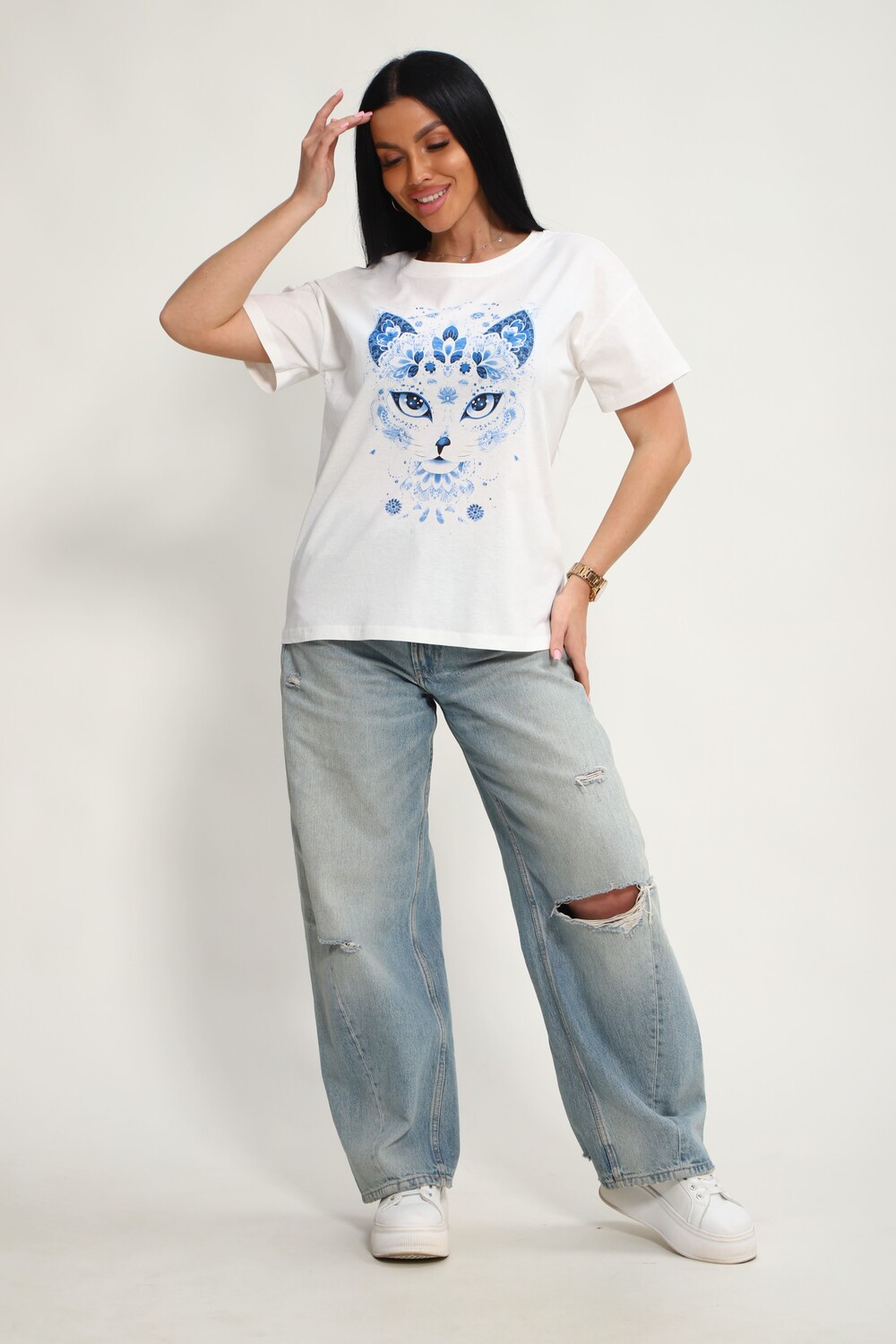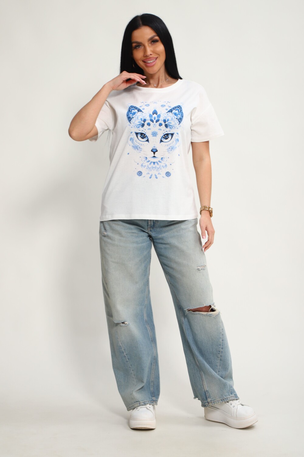 Футболка женская из гладкокрашеного трикотажа, хлопок 100%. Прямого силуэта, свободного облегания, горловина круглой формы. Рукав короткий. Низ изделия прямой. На полочке принт, шелкография.