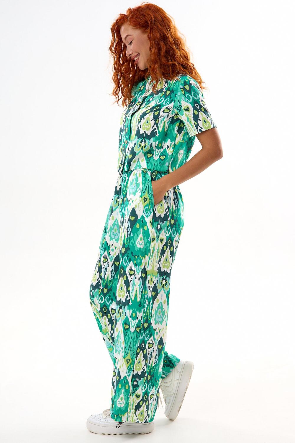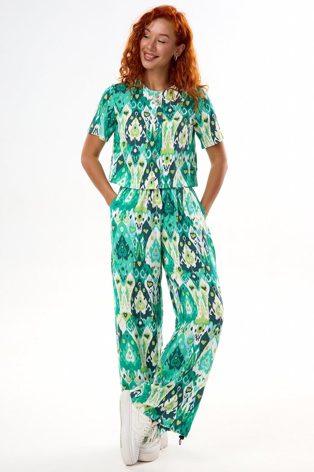 Костюм выполнен из лёгкого и приятного к телу штапеля, идеально подходящего для тёплого сезона. Модель состоит из укороченной блузы на пуговицах с втачным коротким рукавом и длинных прямых брюк на удобной резинке с боковыми карманами. Свободный крой обеспечивает комфорт и свободу движений, а продуманный дизайн делает образ современным и стильным. Этот костюм станет отличным выбором для отдыха, прогулок, похода на работу или вечернего выхода. Сочные и выразительные расцветки привлекают внимание и не оставят вас без комплиментов!