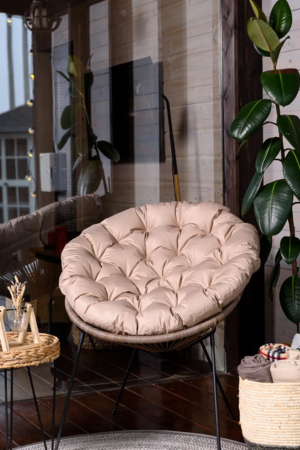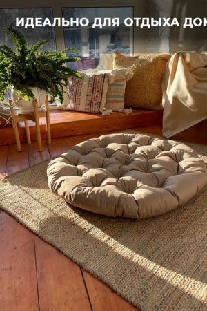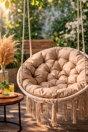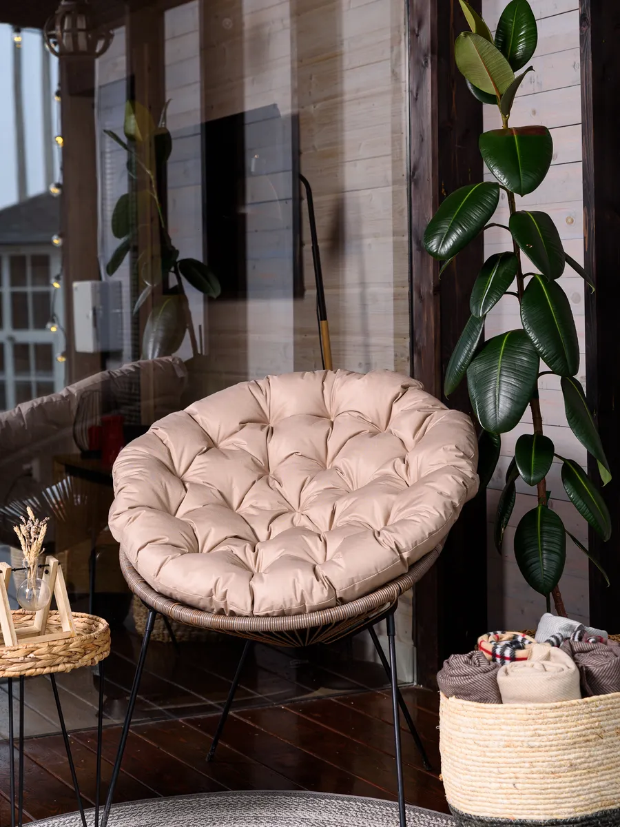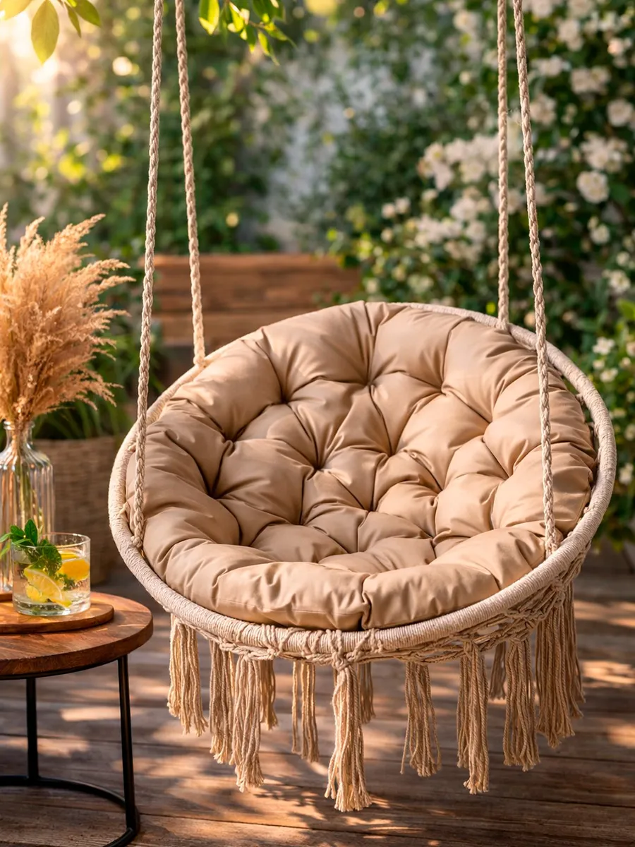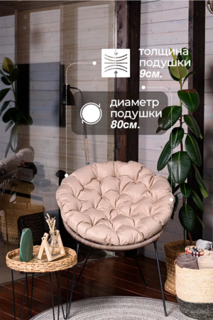 Мягкая круглая подушка размером 80×80 см помогает сделать отдых в подвесном кресле или на садовых качелях значительно комфортнее. Она отлично дополняет мебель для отдыха и помогает создать уютное пространство на даче, в саду, на террасе или балконе.