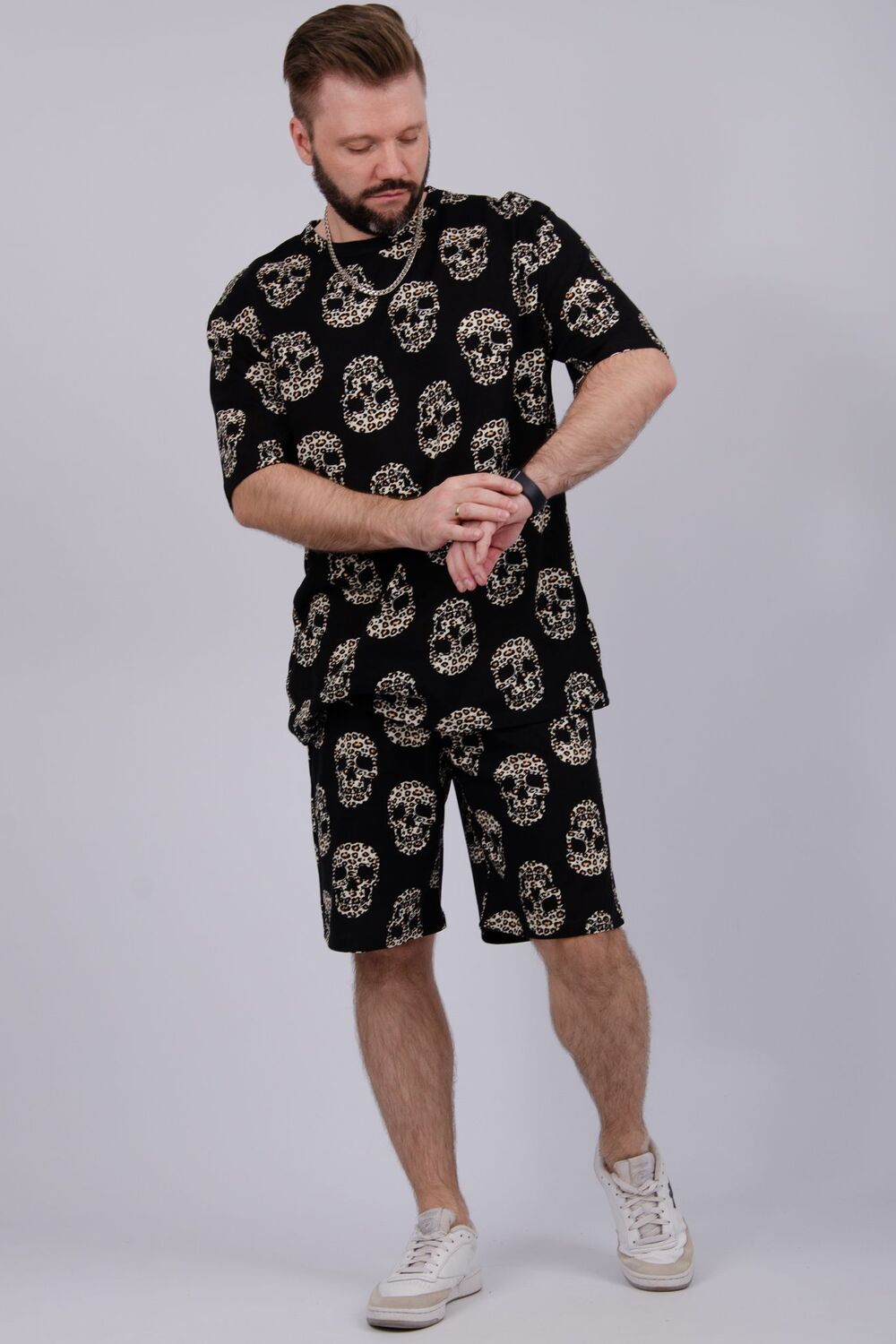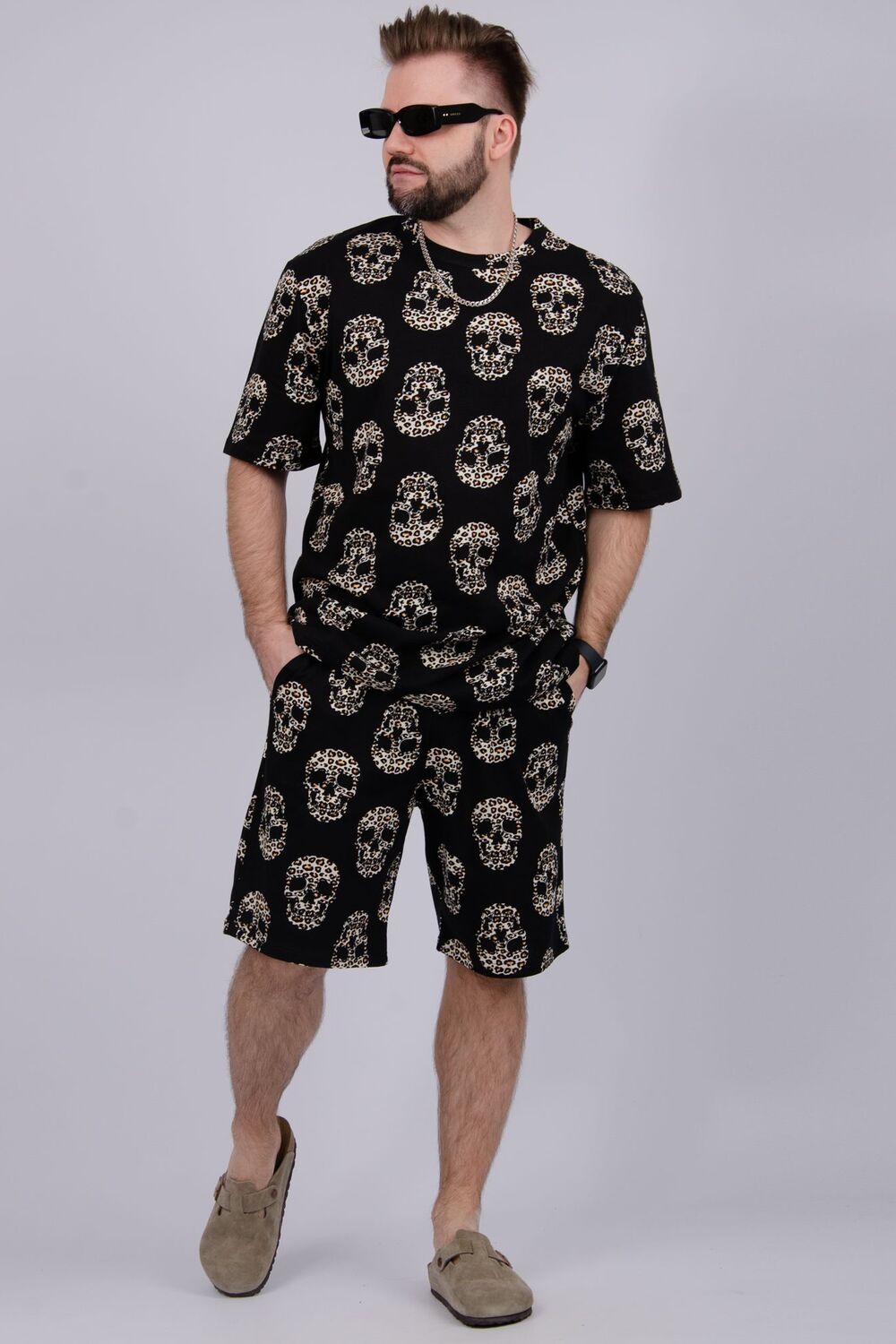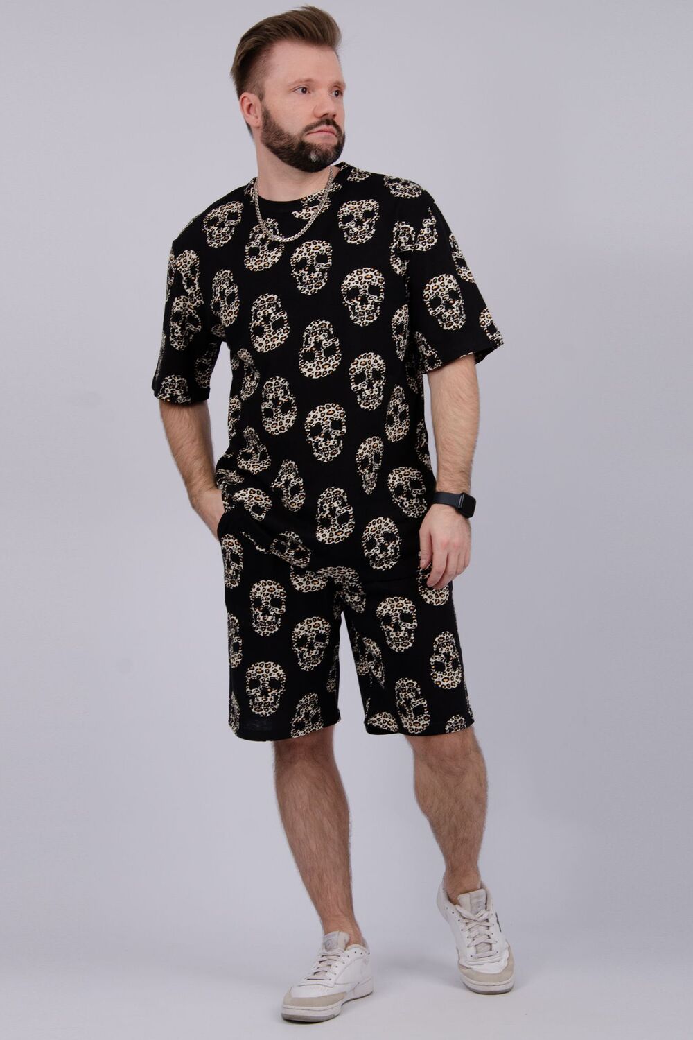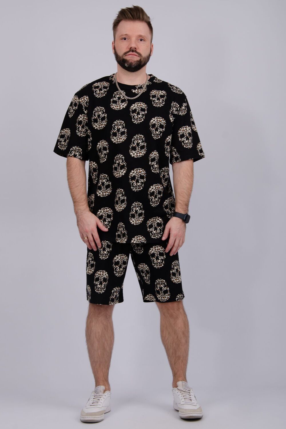 Костюм Харди изготовлен мягкого трикотажного материала. Комплект обеспечивает приятные ощущения на коже и отличную воздухопроницаемость. Включает футболку оверсайз и шорты, которые не сковывают движений и идеально подходят для комфортного использования.