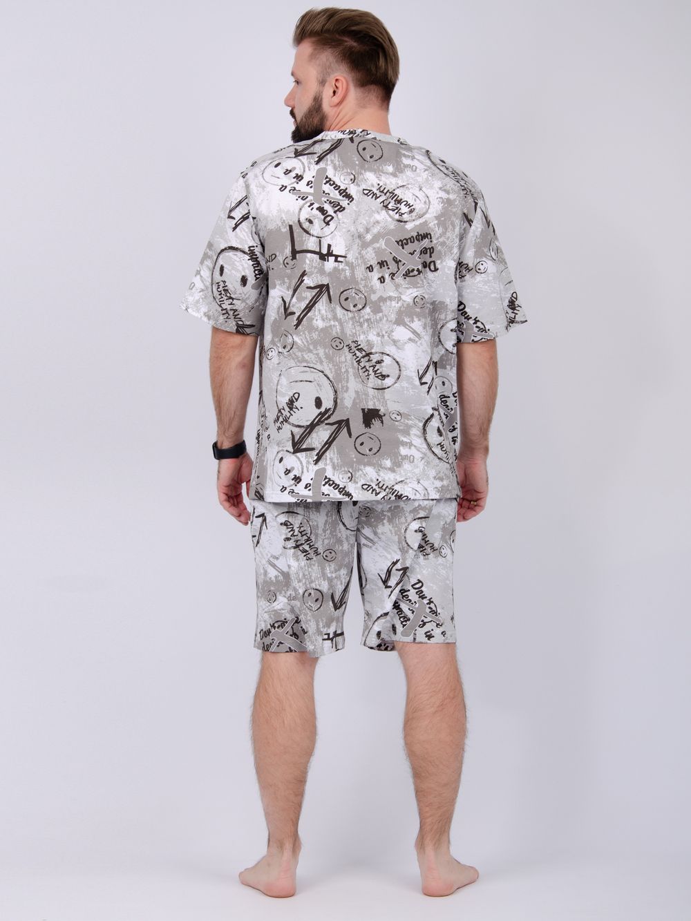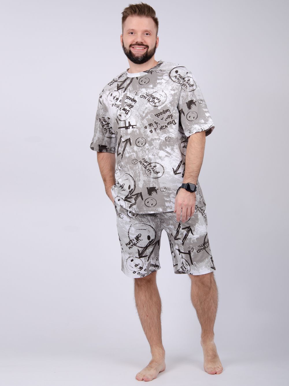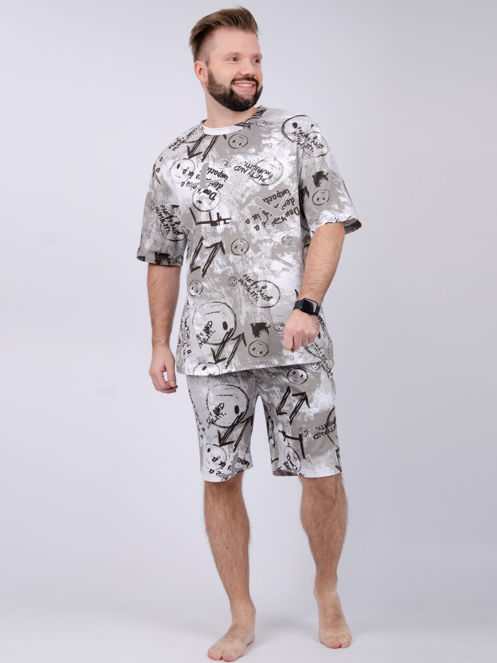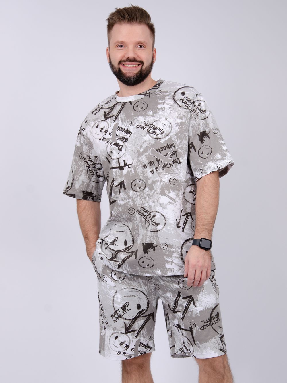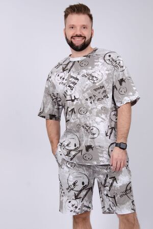 Костюм Харди изготовлен мягкого трикотажного материала. Комплект обеспечивает приятные ощущения на коже и отличную воздухопроницаемость. Включает футболку оверсайз и шорты, которые не сковывают движений и идеально подходят для комфортного использования.