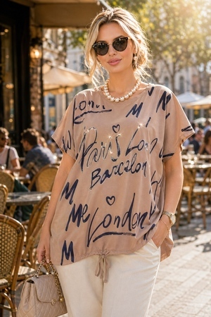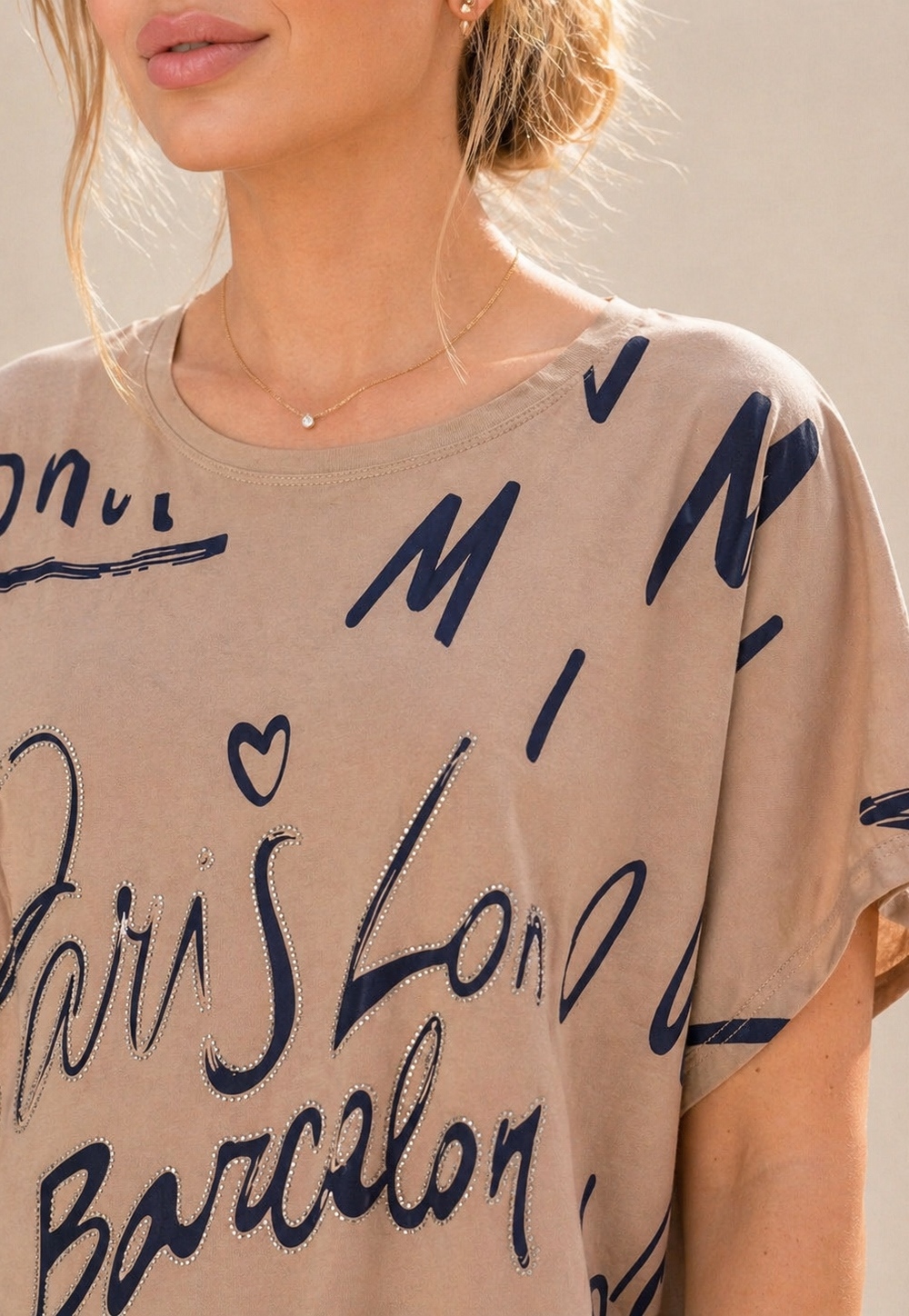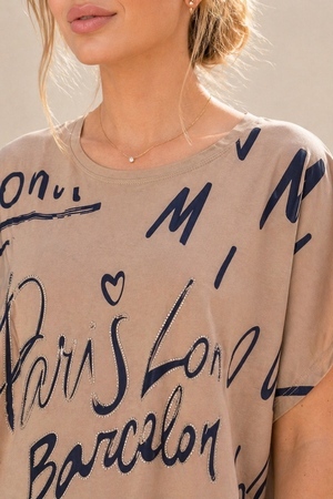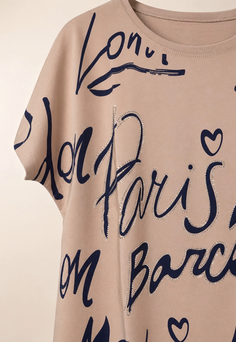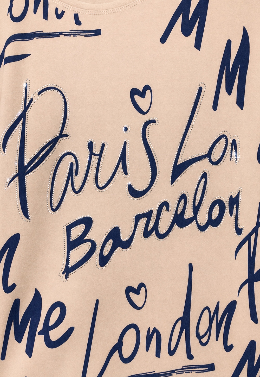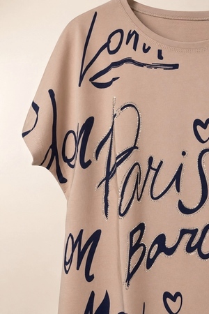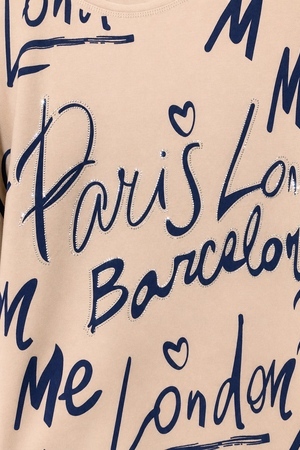 Роскошный дизайн и принт: Лицевая сторона украшена стильным принтом с названиями городов (Париж, Барселона, Лондон). Ключевая деталь — буквы выложены качественными стразами. Они не просто напечатаны, а надежно закреплены: стразы останутся на месте, не отклеятся после стирки и будут радовать вас долгое время. На солнце или при свете софитов композиция особенно красиво переливается, создавая эффект «бриллиантового» сияния.
