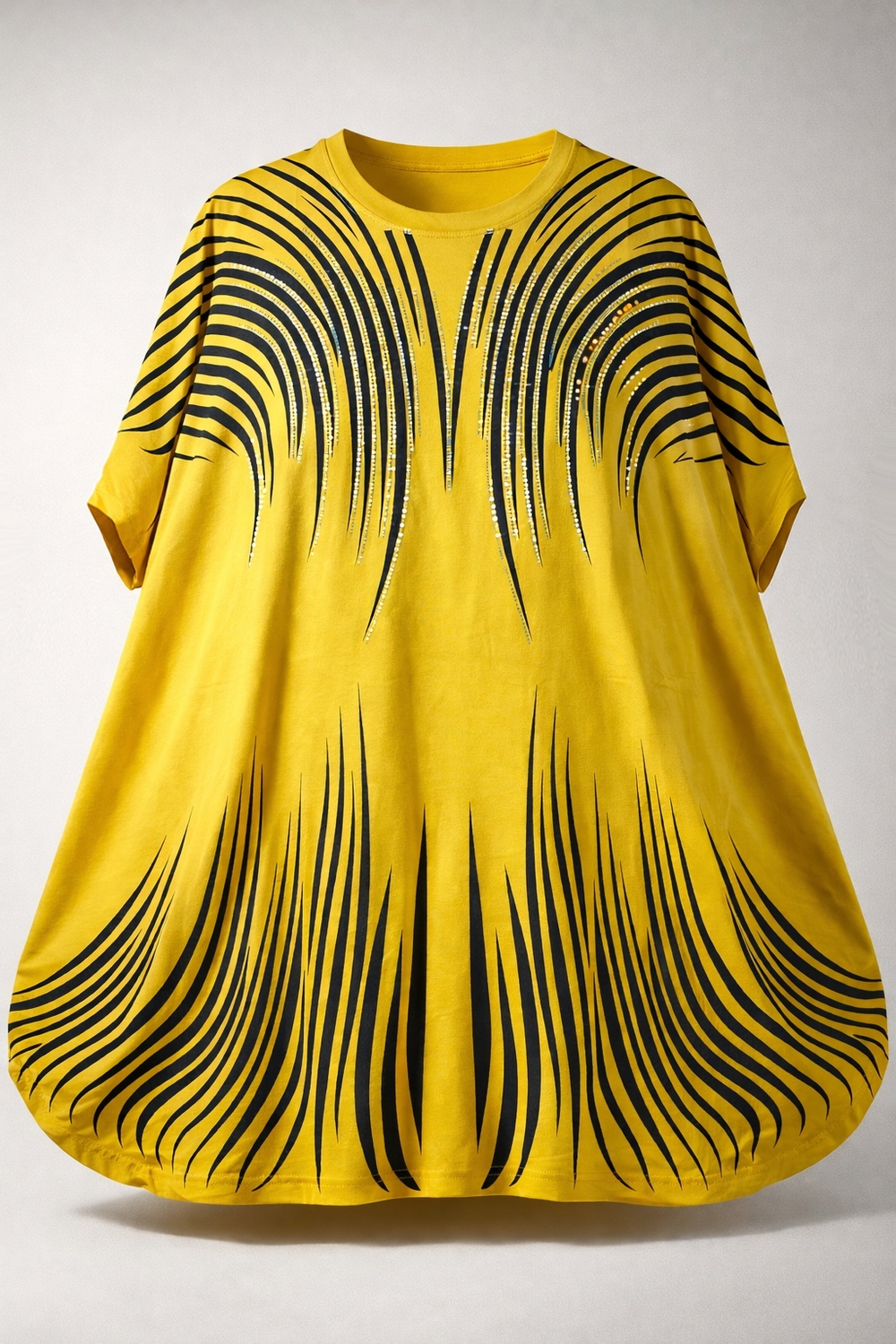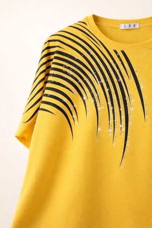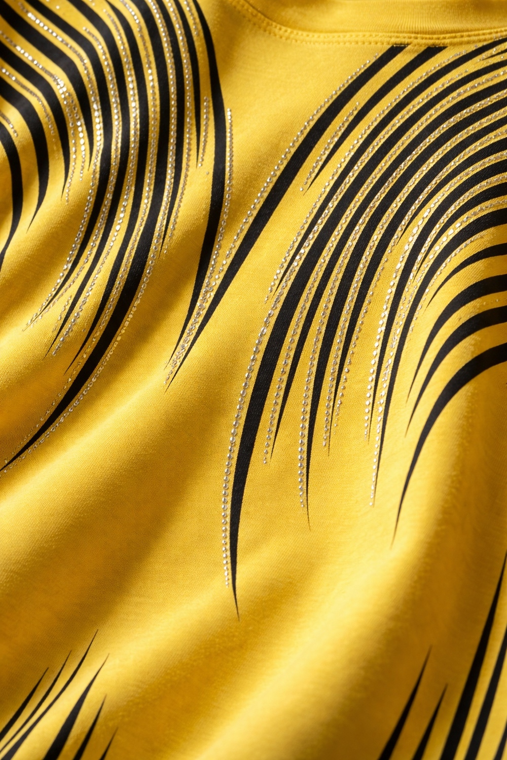 🌟 Дизайн, который восхищает: Главная изюминка модели — динамичный принт из волнистых линий, напоминающих потоки линий. Верхняя часть узора и зона декольте инкрустированы качественными стразами: стразы надежно закреплены профессиональным оборудованием, они не отклеятся после стирки и будут радовать вас долгое время. На солнце и при искусственном освещении композиция начинает особенно красиво переливаться, добавляя образу нотки шика.