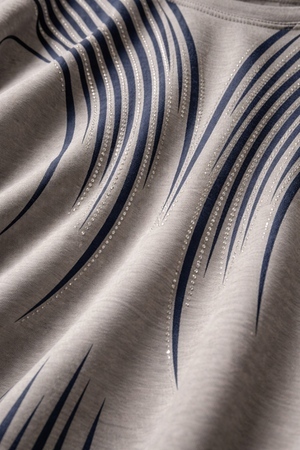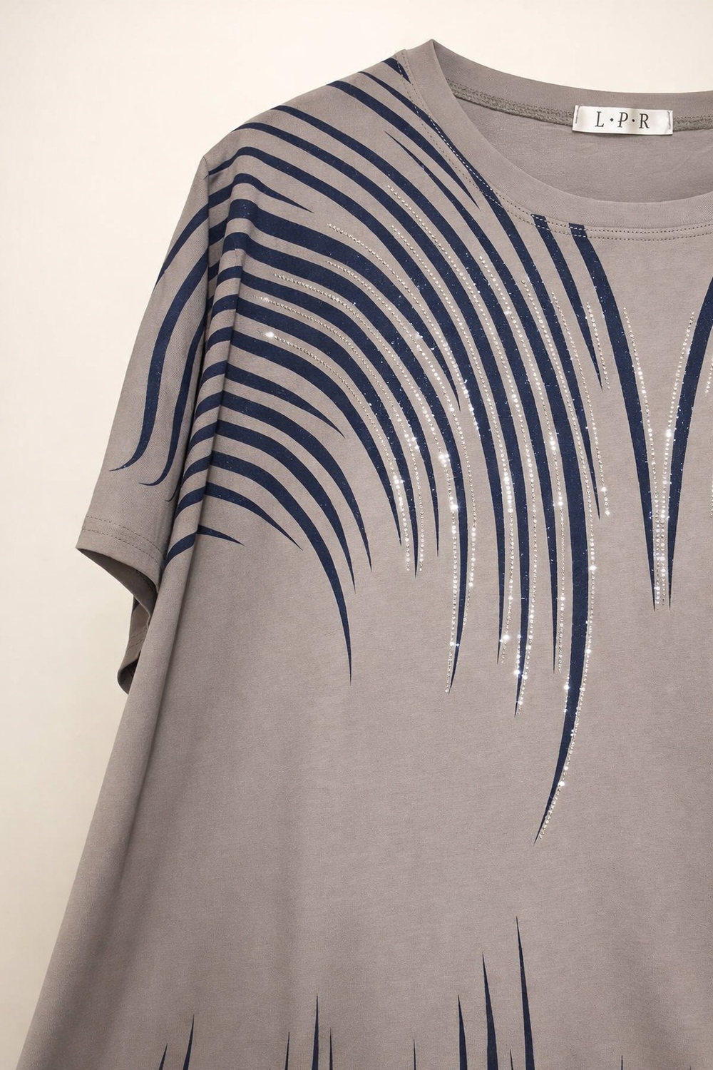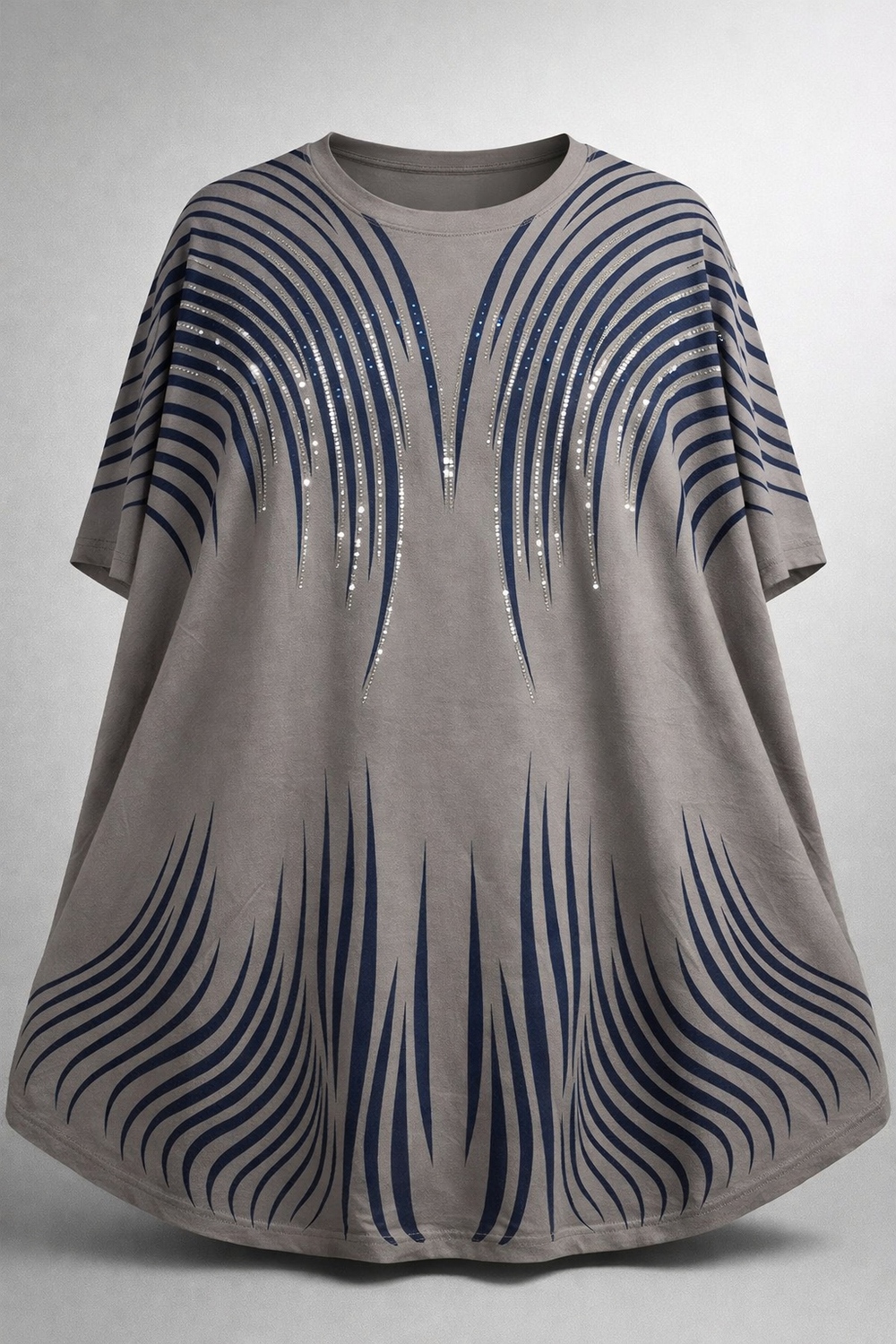 🌟 Дизайн, который восхищает: Главная изюминка модели — динамичный принт из волнистых линий, напоминающих потоки линий. Верхняя часть узора и зона декольте инкрустированы качественными стразами: стразы надежно закреплены профессиональным оборудованием, они не отклеятся после стирки и будут радовать вас долгое время. На солнце и при искусственном освещении композиция начинает особенно красиво переливаться, добавляя образу нотки шика.