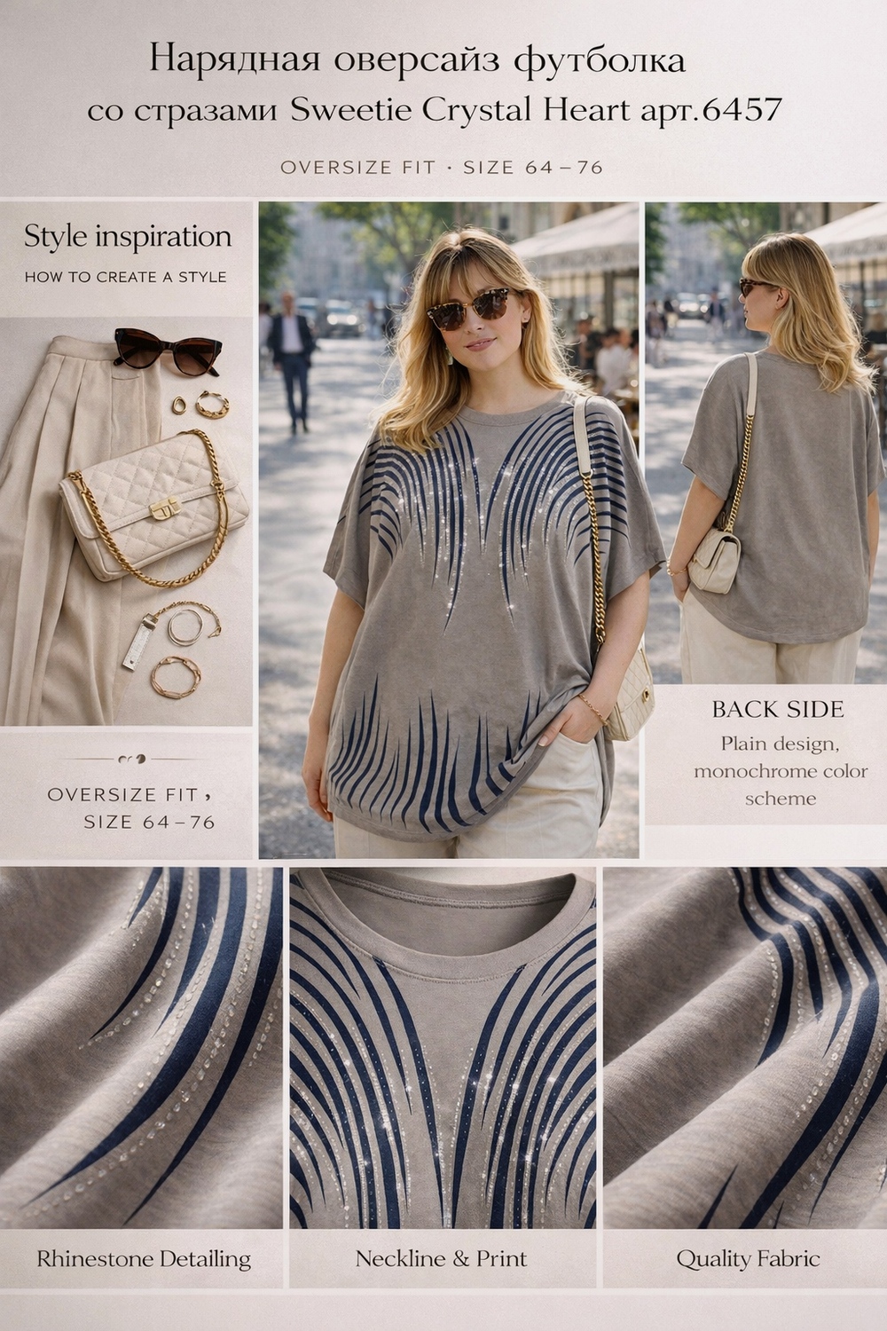 Нарядная оверсайз футболка со стразами Crystal Flow Luxe, большие размеры, арт. F8003 — откройте для себя идеальное сочетание комфорта и стиля с нашей новинкой.
