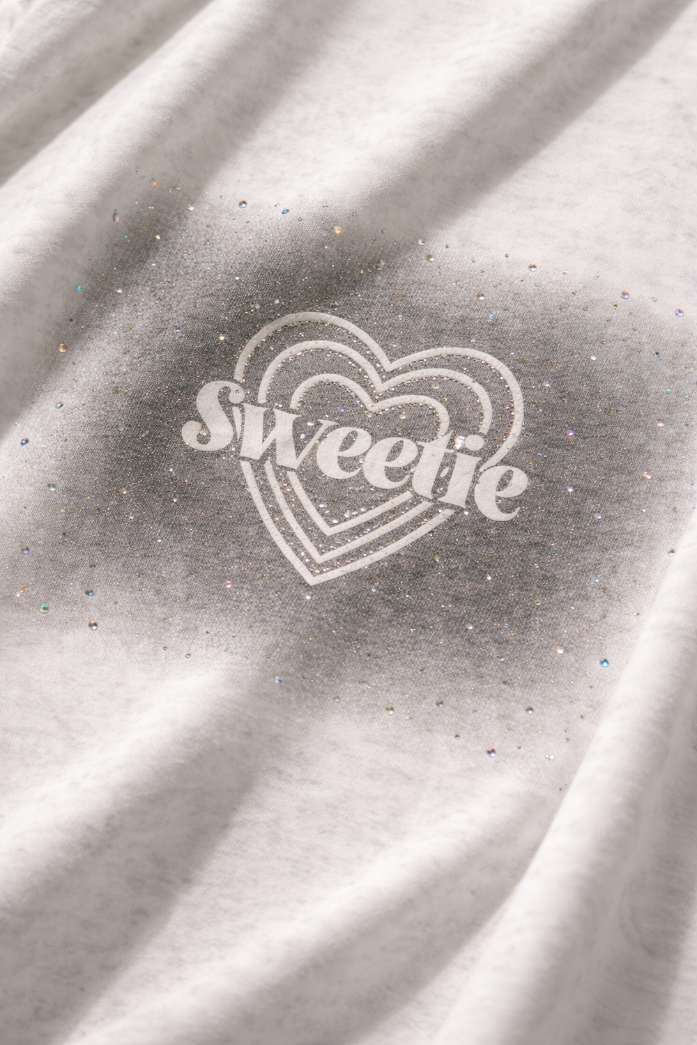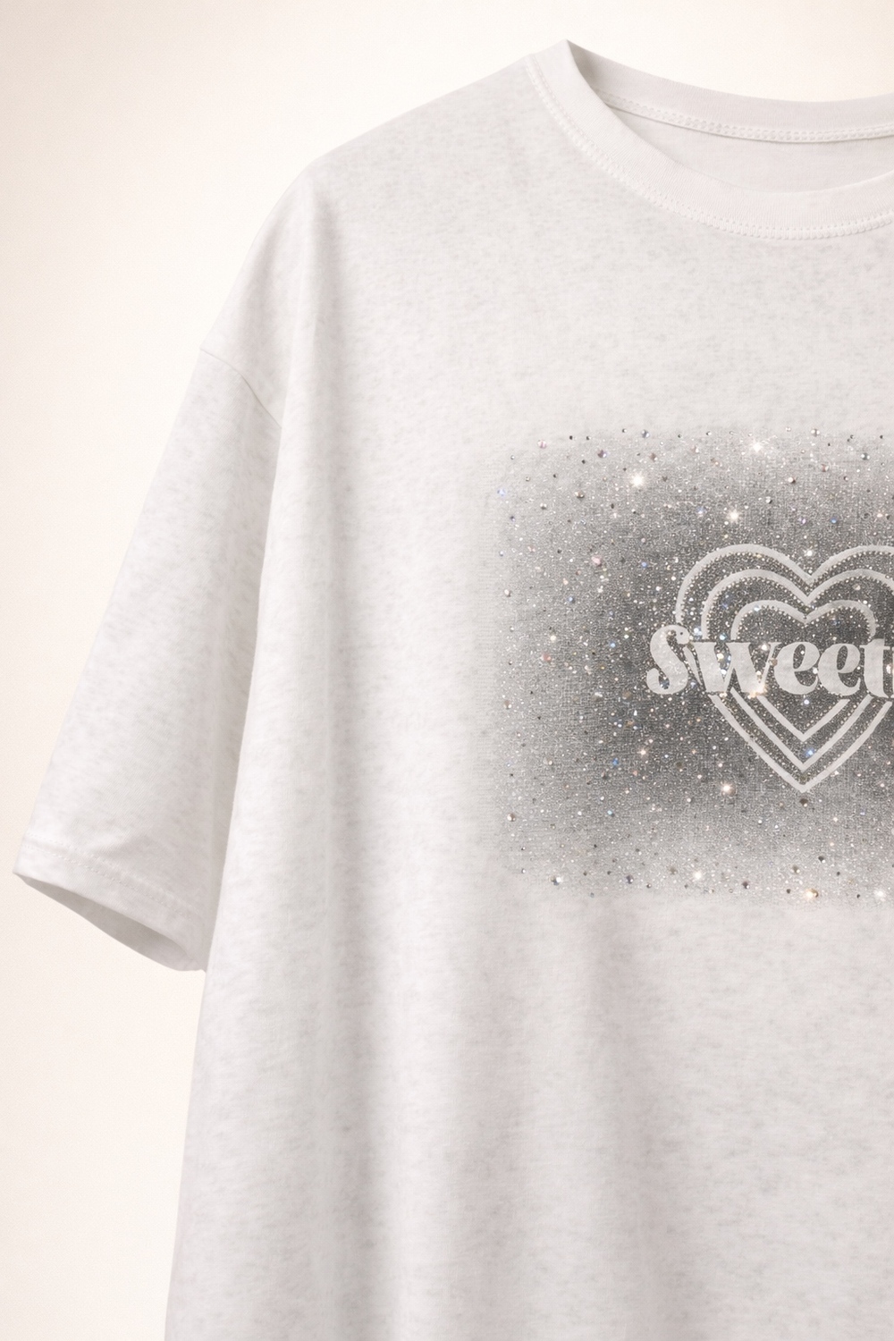 💎 Роскошный дизайн и сияние: Центральным элементом модели является эффектный принт в виде объемного сердца с надписью «Sweetie», окруженный россыпью сверкающих страз. Стразы нанесены по градиентной технологии, создавая эффект тающего сияния.Использована передовая технология фиксации. Стразы останутся на месте — они качественно приделаны, не отклеятся после стирок и не потеряют свой блеск.