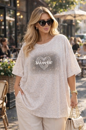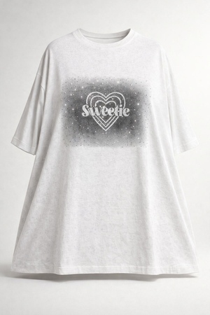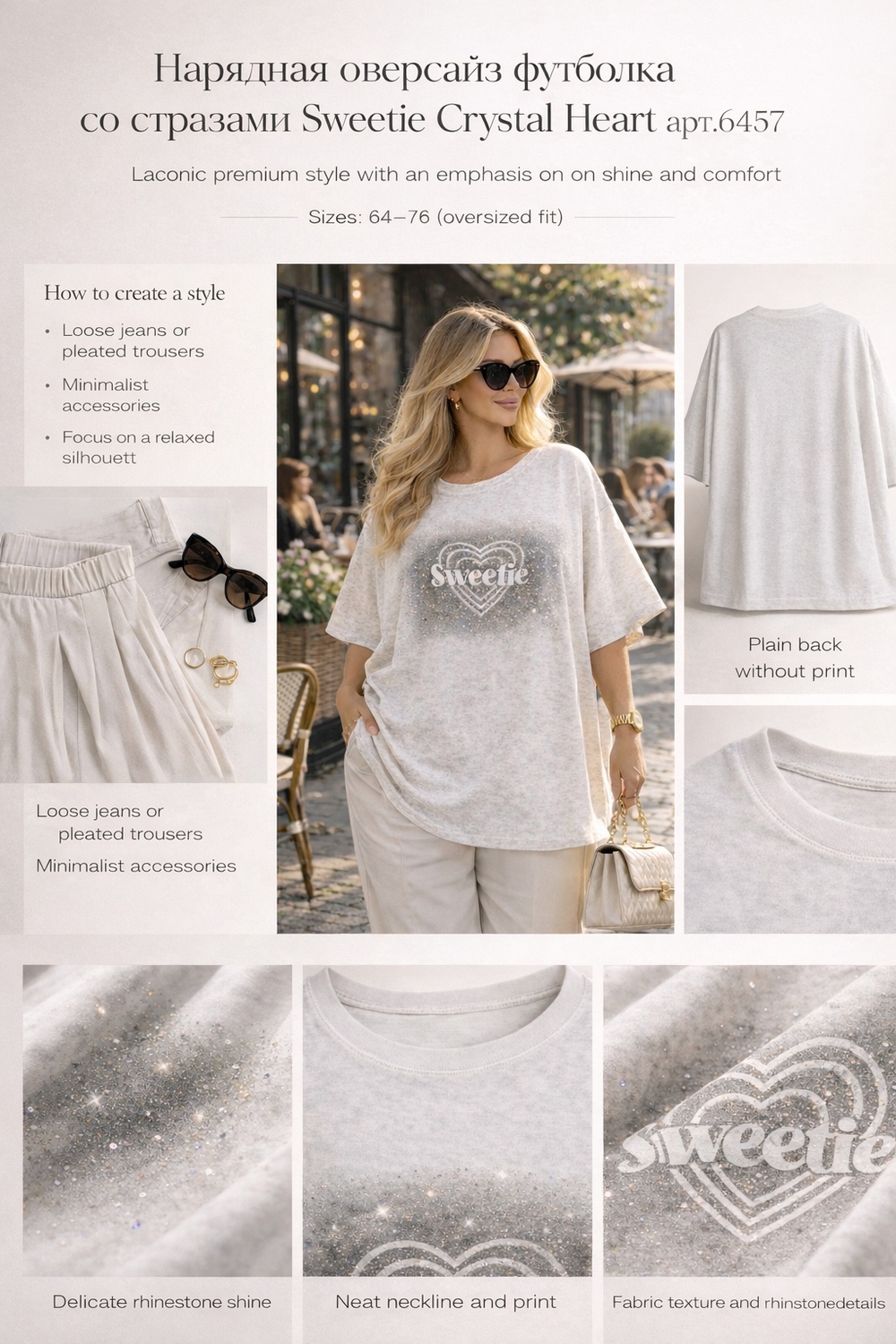 Нарядная оверсайз футболка со стразами Sweetie Crystal Heart арт.6457 — Главный Must-Have Сезона (Размеры 64–76). Эта футболка — не просто базовая вещь, это настоящий манифест современной моды для пышных форм. Если вы хотите выглядеть стильно, дорого и следовать последним веяниям фешн-индустрии, модель Crystal Flow Luxe создана специально для вас.