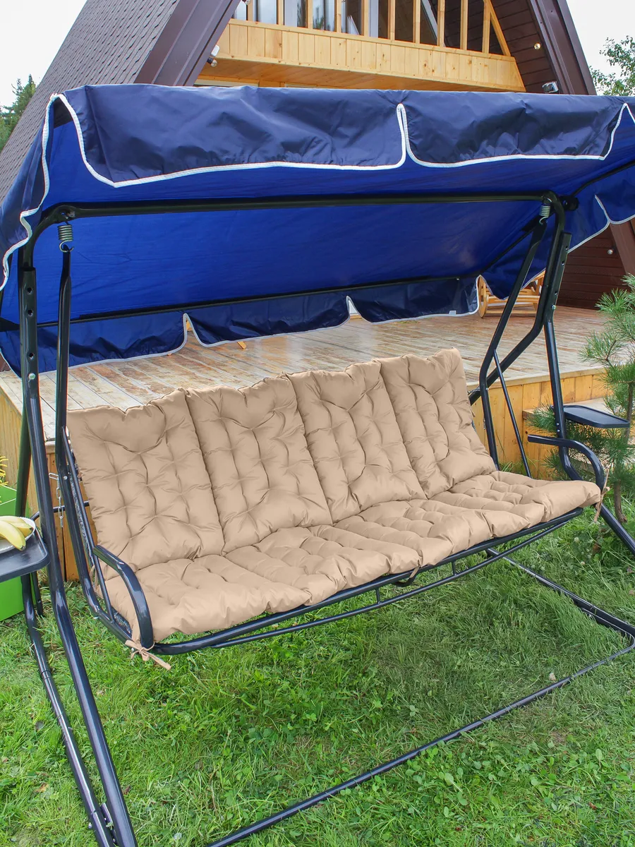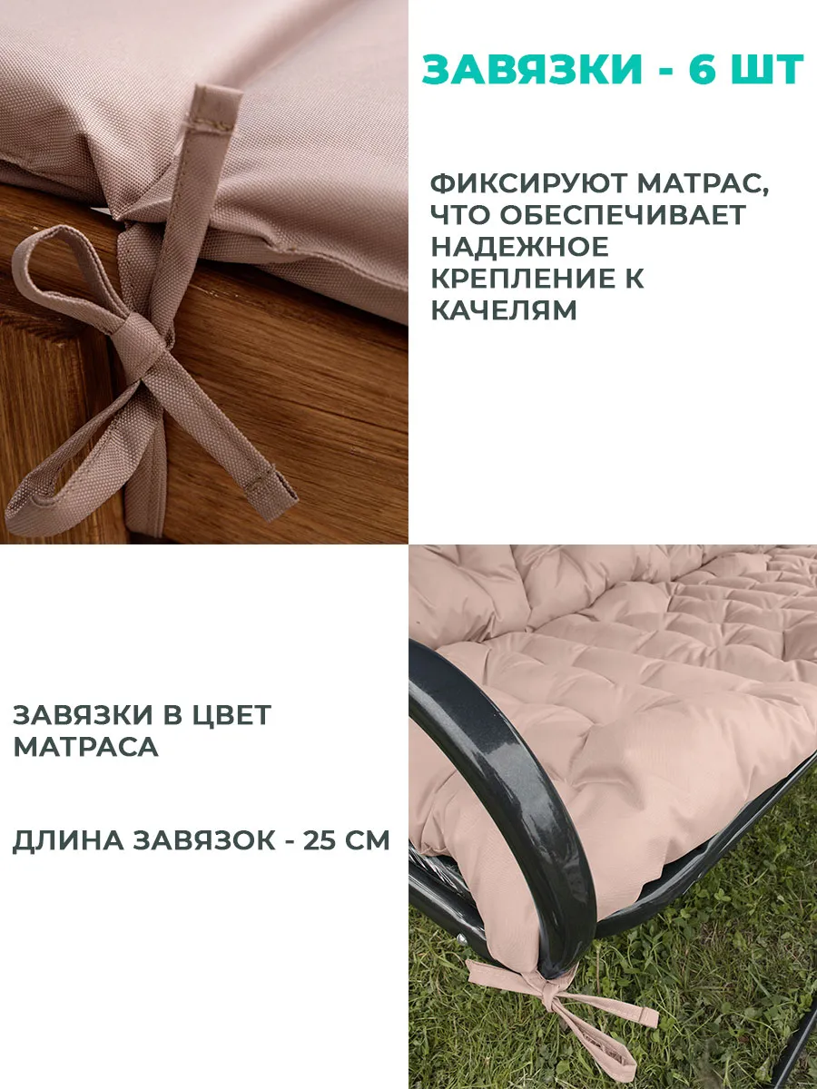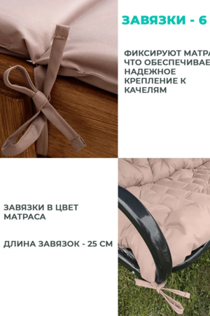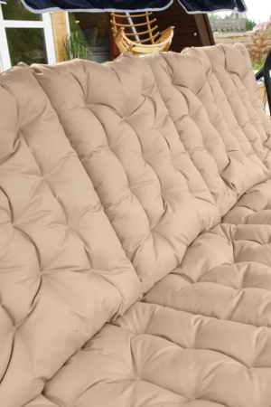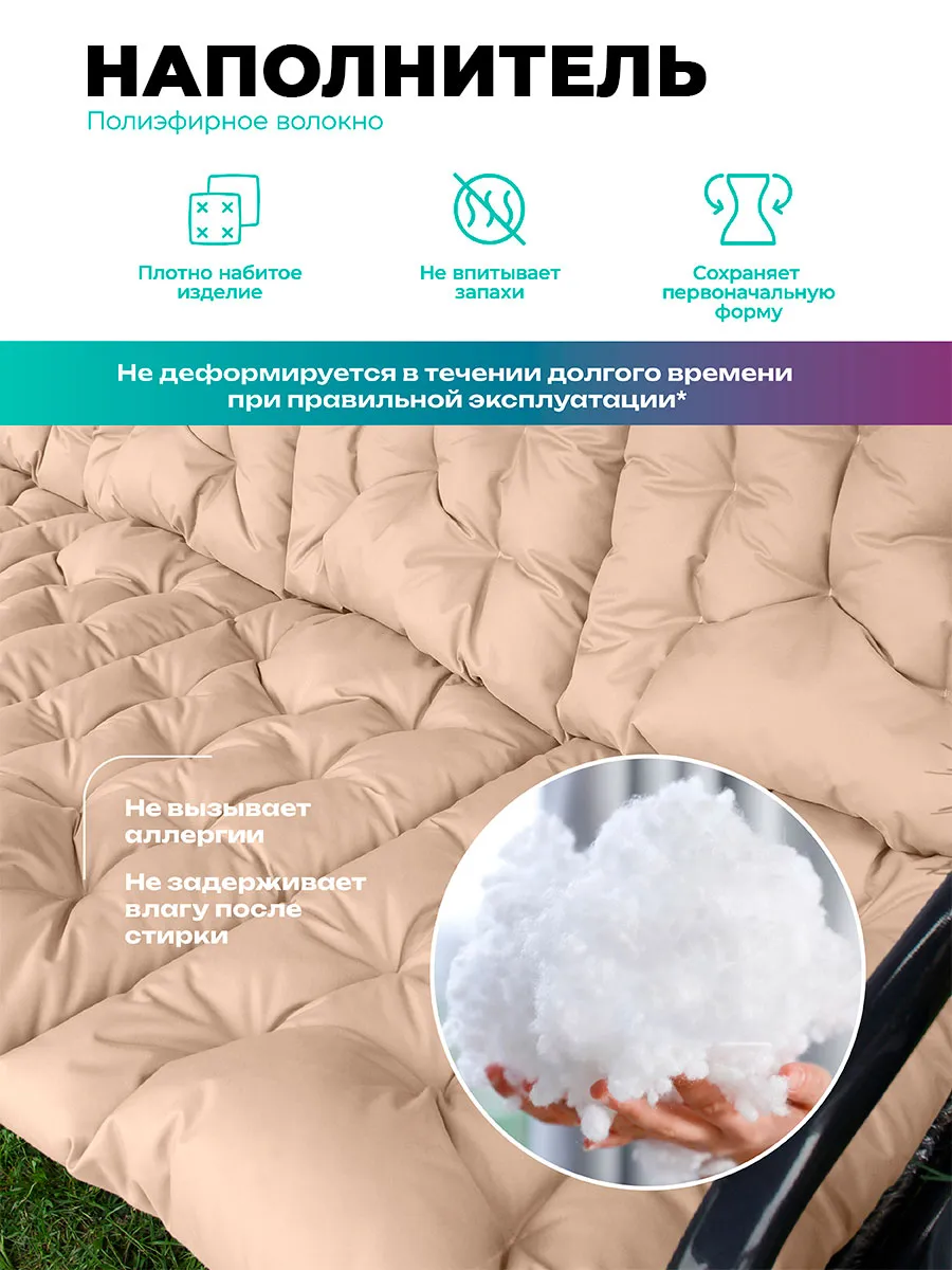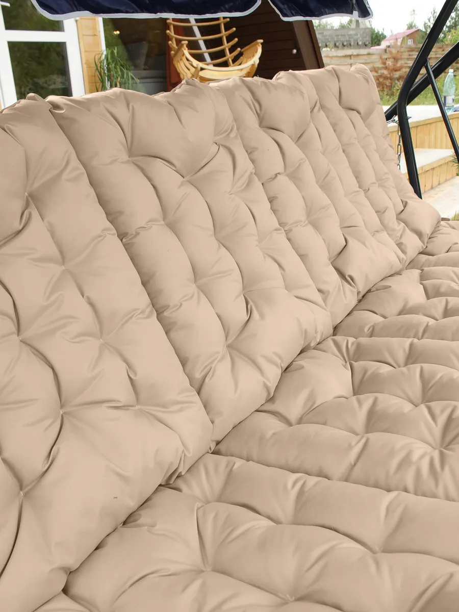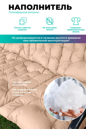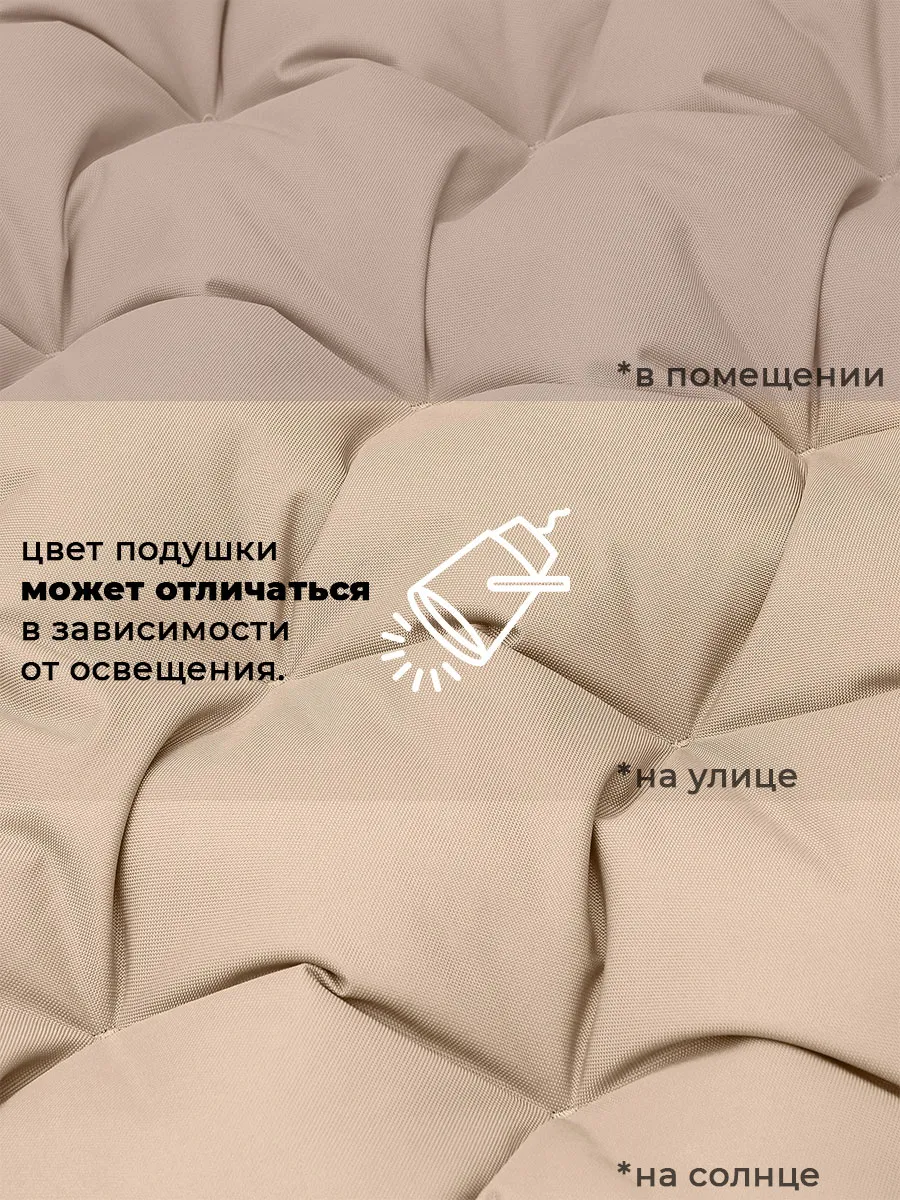 Мягкая и упругая набивка равномерно распределяет нагрузку, не сбивается и обеспечивает комфорт даже при длительном отдыхе. Толщина 6-8 см делает поверхность достаточно плотной, чтобы использовать изделие не только на качелях, но и на жестких основаниях.
