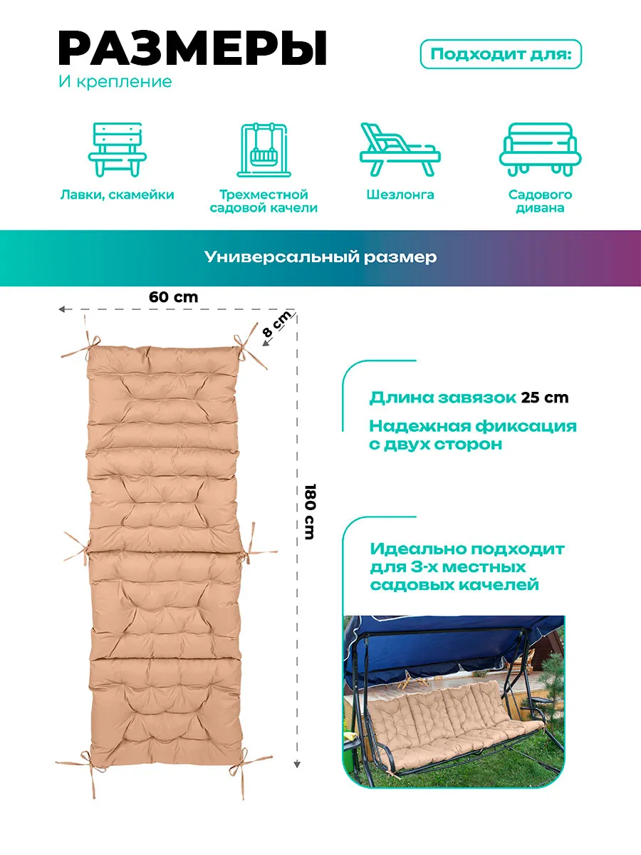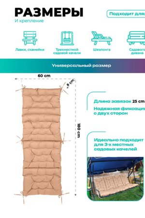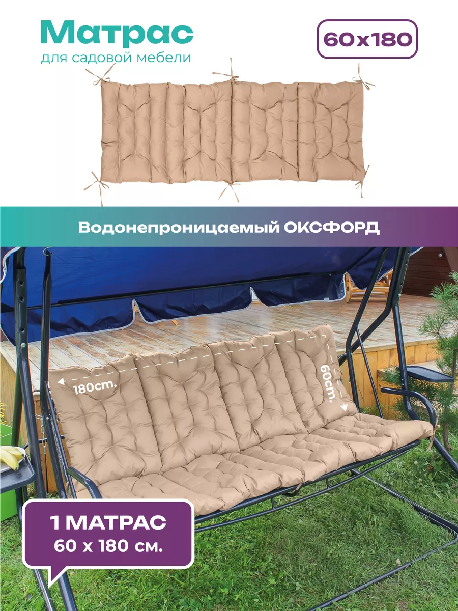 Матрас для садовых качелей 60×180 см — удобное решение для комфортного отдыха на даче и в саду. Подходит для большинства моделей и используется как сиденье и спинка, создавая полноценную зону расслабления на свежем воздухе.