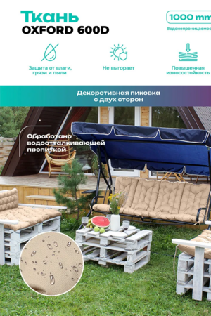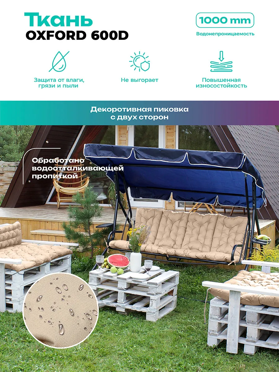 Изделие выполнено из прочной ткани для уличной мебели с водоотталкивающими свойствами. Материал устойчив к выгоранию, не боится влаги и быстро сохнет, благодаря чему сохраняет аккуратный внешний вид при регулярном использовании на улице.
