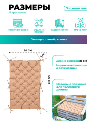 Размер 80х120 см (также ищут: 120х80, 80 на 120) подходит для большинства скамеек и садовой мебели. Завязки по краям надежно фиксируют изделие, предотвращая смещение во время использования.