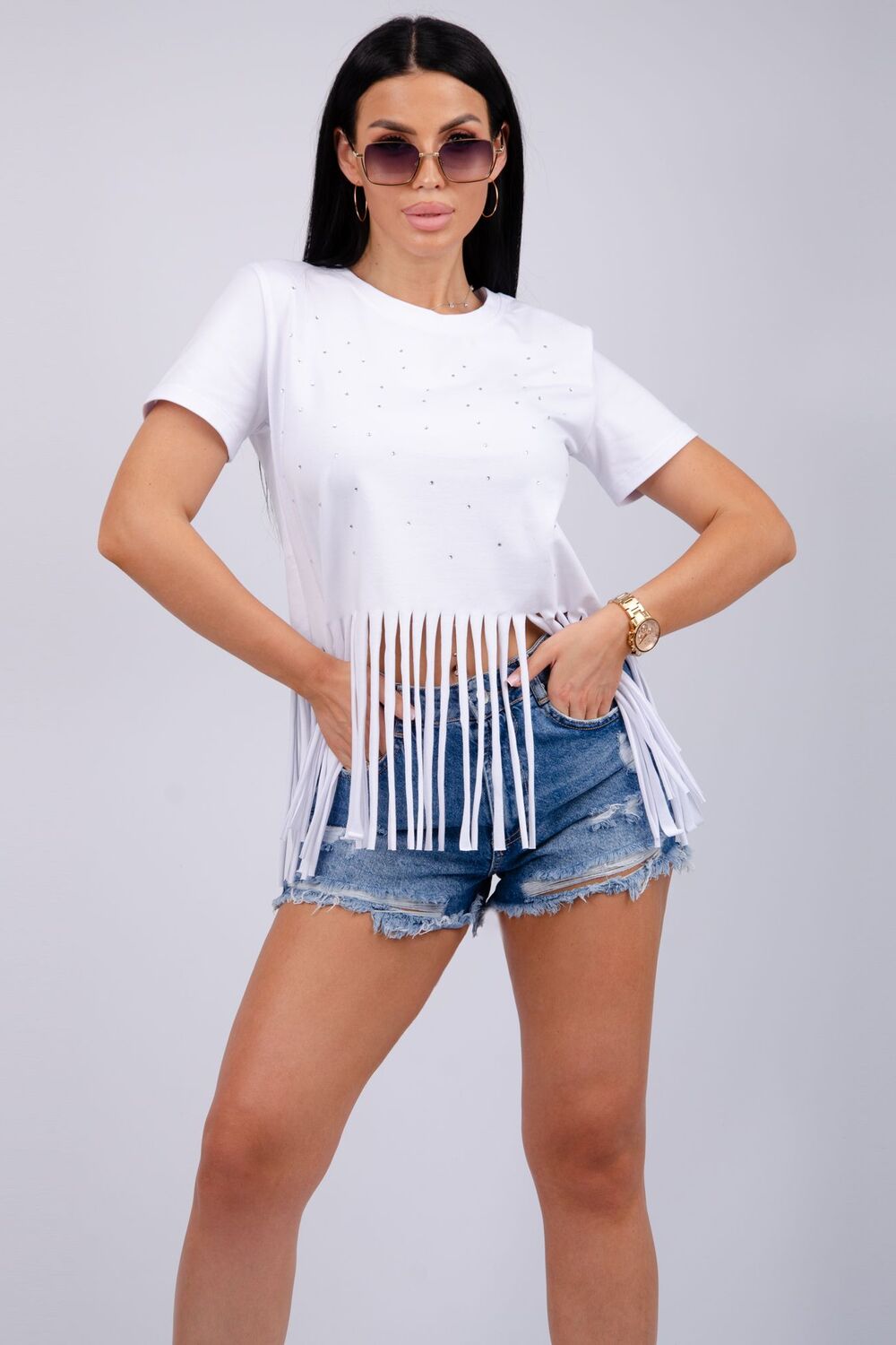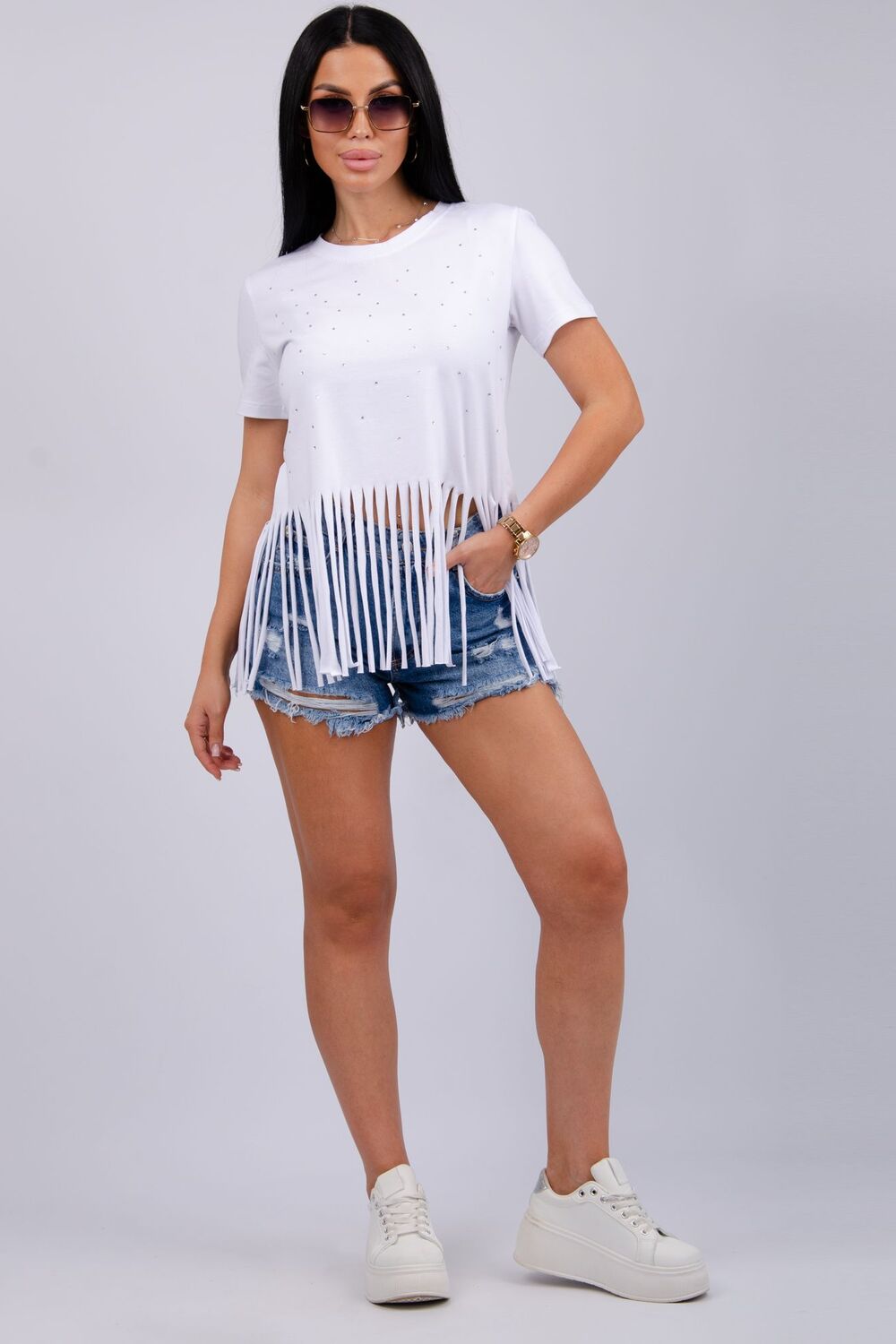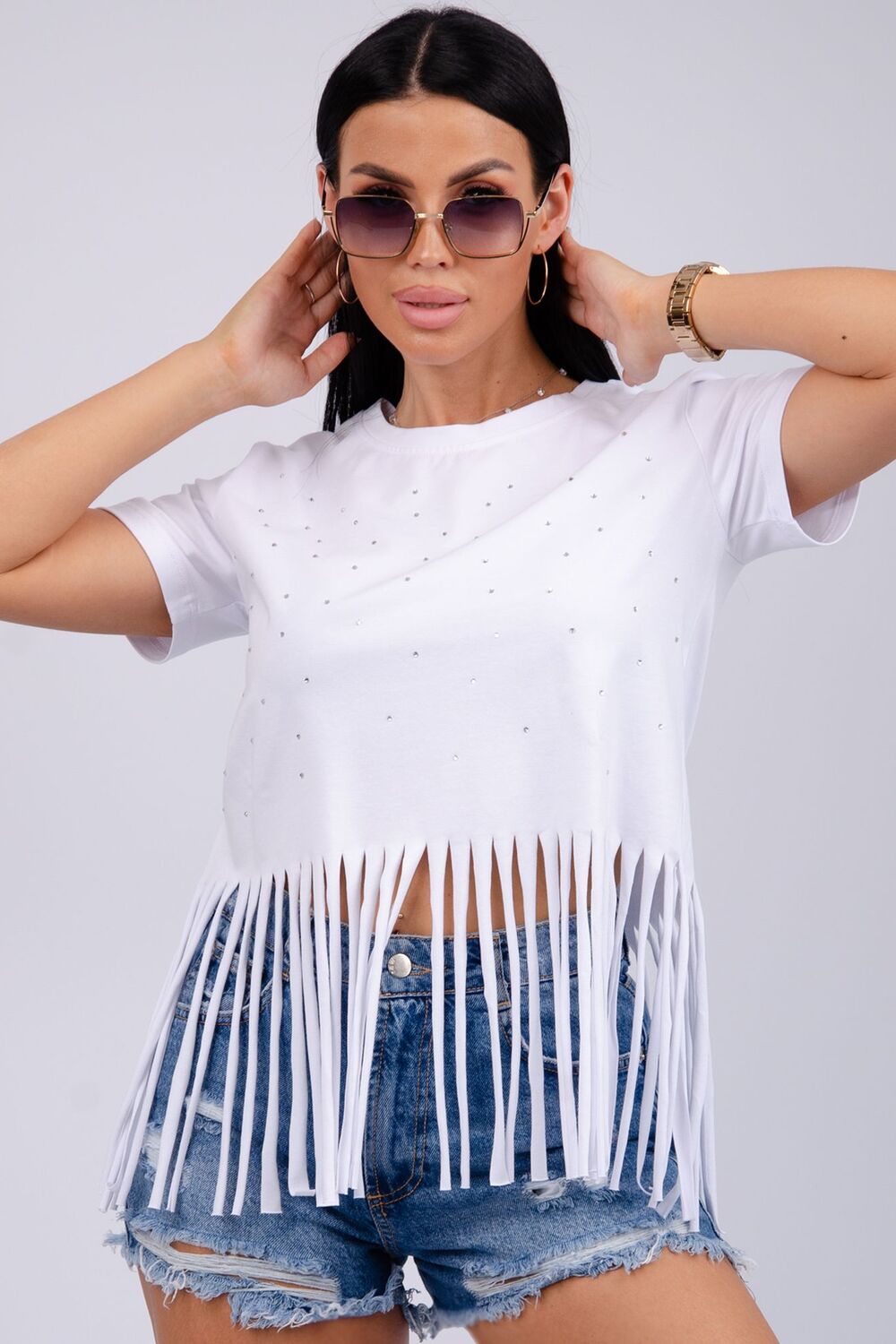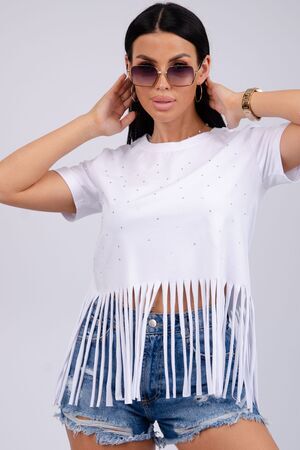 Футболка женская из хлопка с эластаном. Футболка со стразами и бахромой подчеркнет вашу индивидуальность.