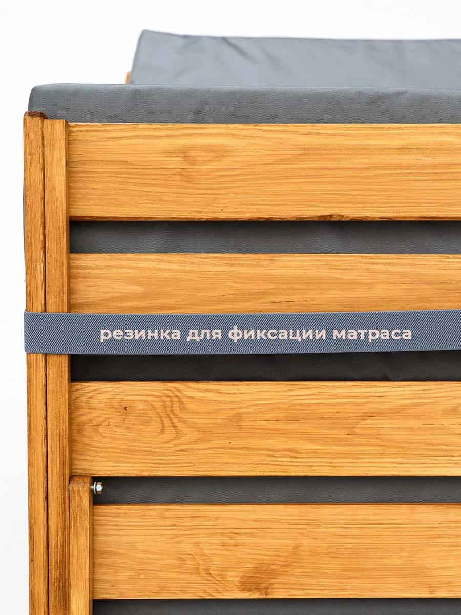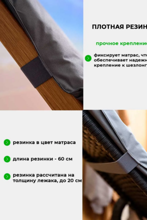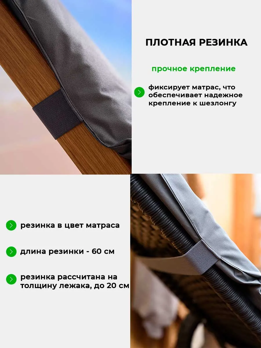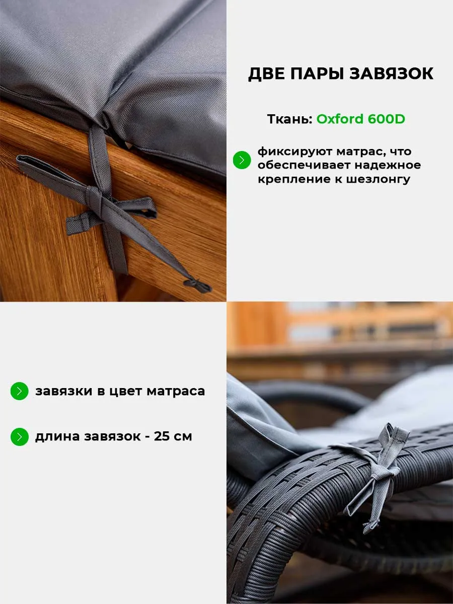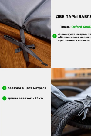 Для фиксации матраса на шезлонге предусмотрена резинка на изголовье, которая позволяет надежно зафиксировать верхнюю часть матраса, а две пары завязок - закрепляют нижнюю часть, к садовой мебели, что обеспечивает фиксацию на лежаках. Двустороннюю подстилку можно перевернуть, что обеспечивает равномерный износ и продлевает срок службы.