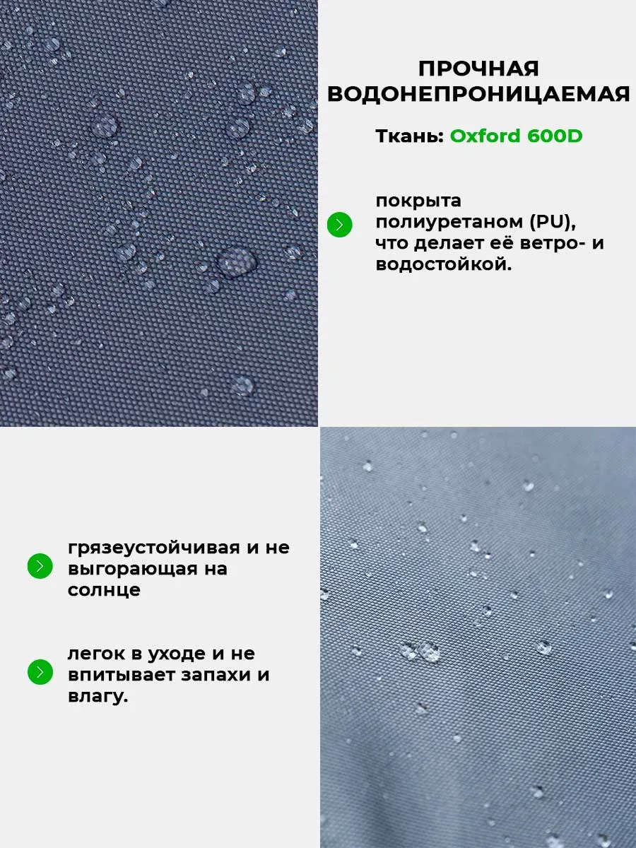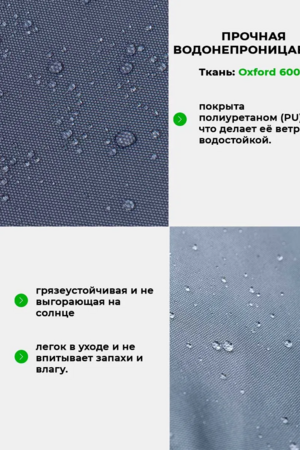 Он изготовлен из оксфорда 600D, ткань Oxford водостойкая, она покрыта полиуретаном (PU), что делает её ветро- и водостойкой. Особенностью является водоотталкивающая ткань, которая делает его грязеустойчивым и не выгорающим на солнце, он легок в уходе и не впитывает запахи и влагу.