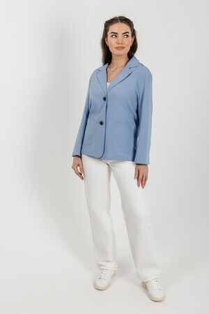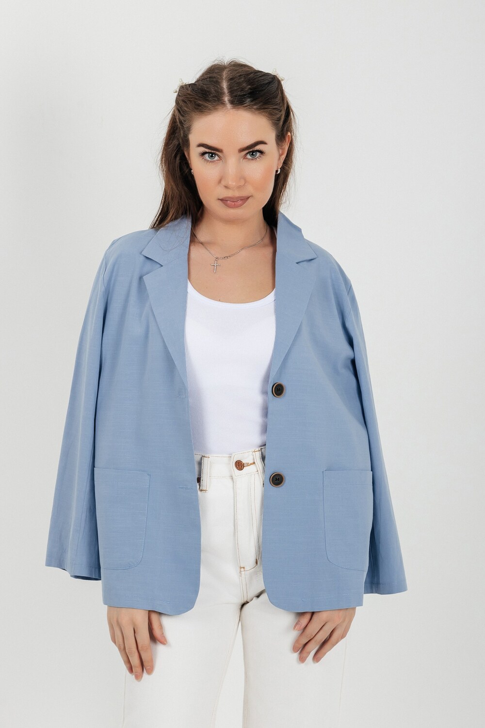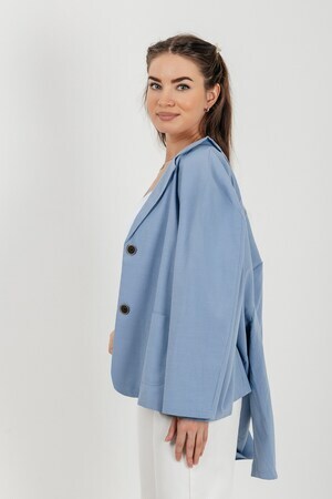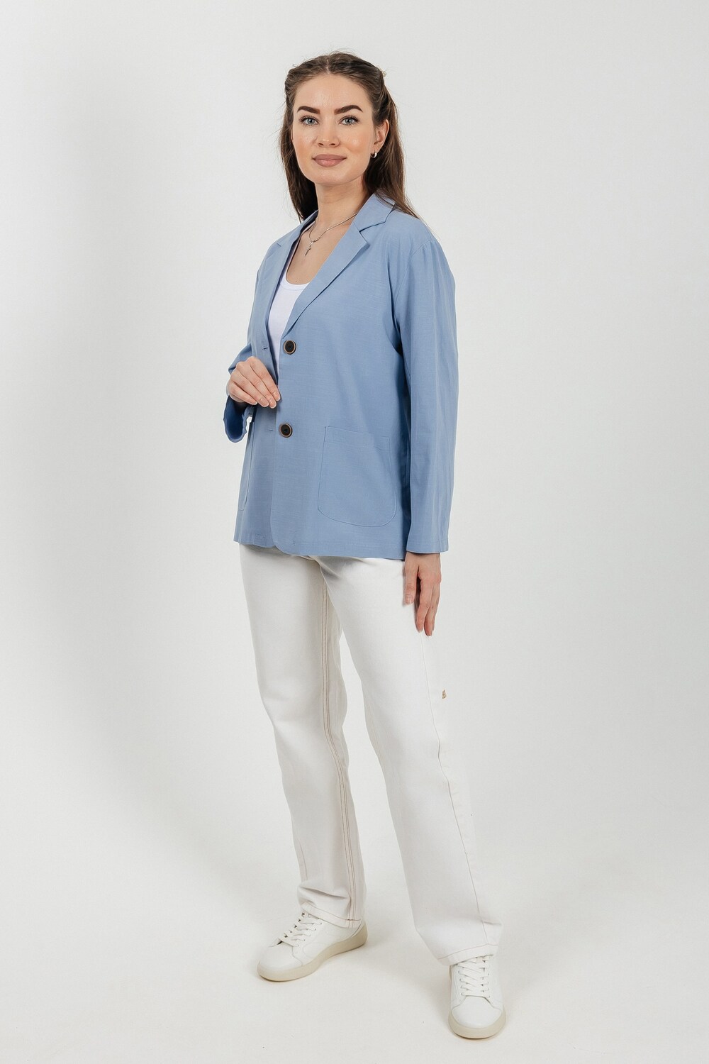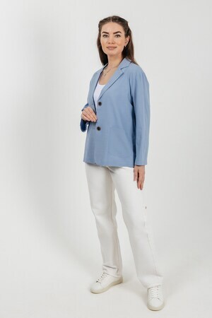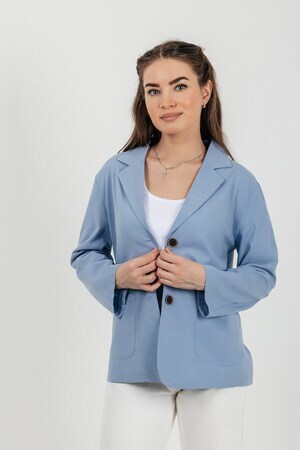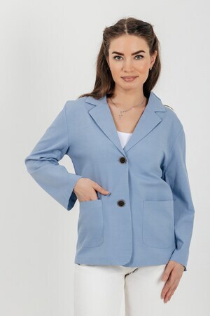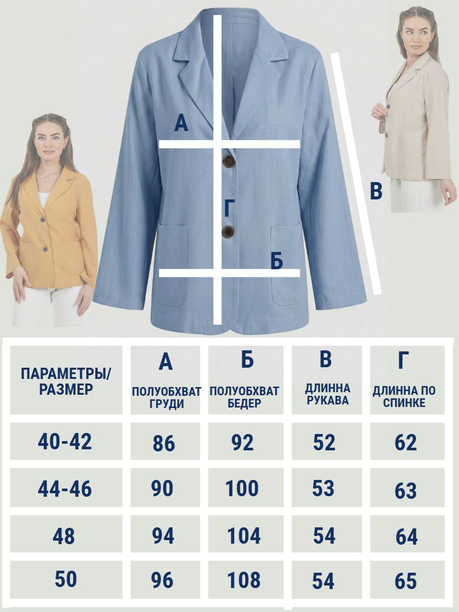 Лёгкий женский пиджак без подклада станет незаменимой вещью в весенне‑летнем гардеробе. Благодаря отсутствию подклада модель особенно комфортна: она не стесняет движений и не создаёт лишнего тепла даже в жаркую погоду. Классический дизайн с чёткими линиями и лаконичными деталями легко вписать в любой стиль: наденьте его с офисной юбкой для строгого образа или с джинсовыми шортами для прогулки. Застёжка на пуговицы, удобные карманы и продуманный крой делают эту модель практичной и функциональной. Пиджак гармонично сочетается с разными элементами гардероба — от платьев до брюк. Уход прост: деликатная стирка при 30∘C и аккуратная глажка.
