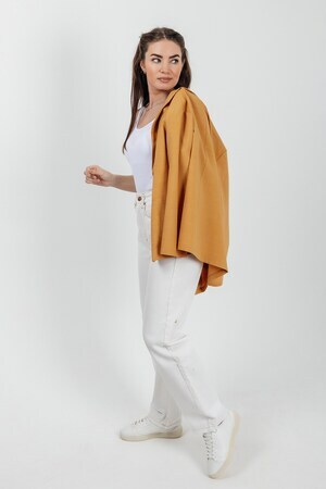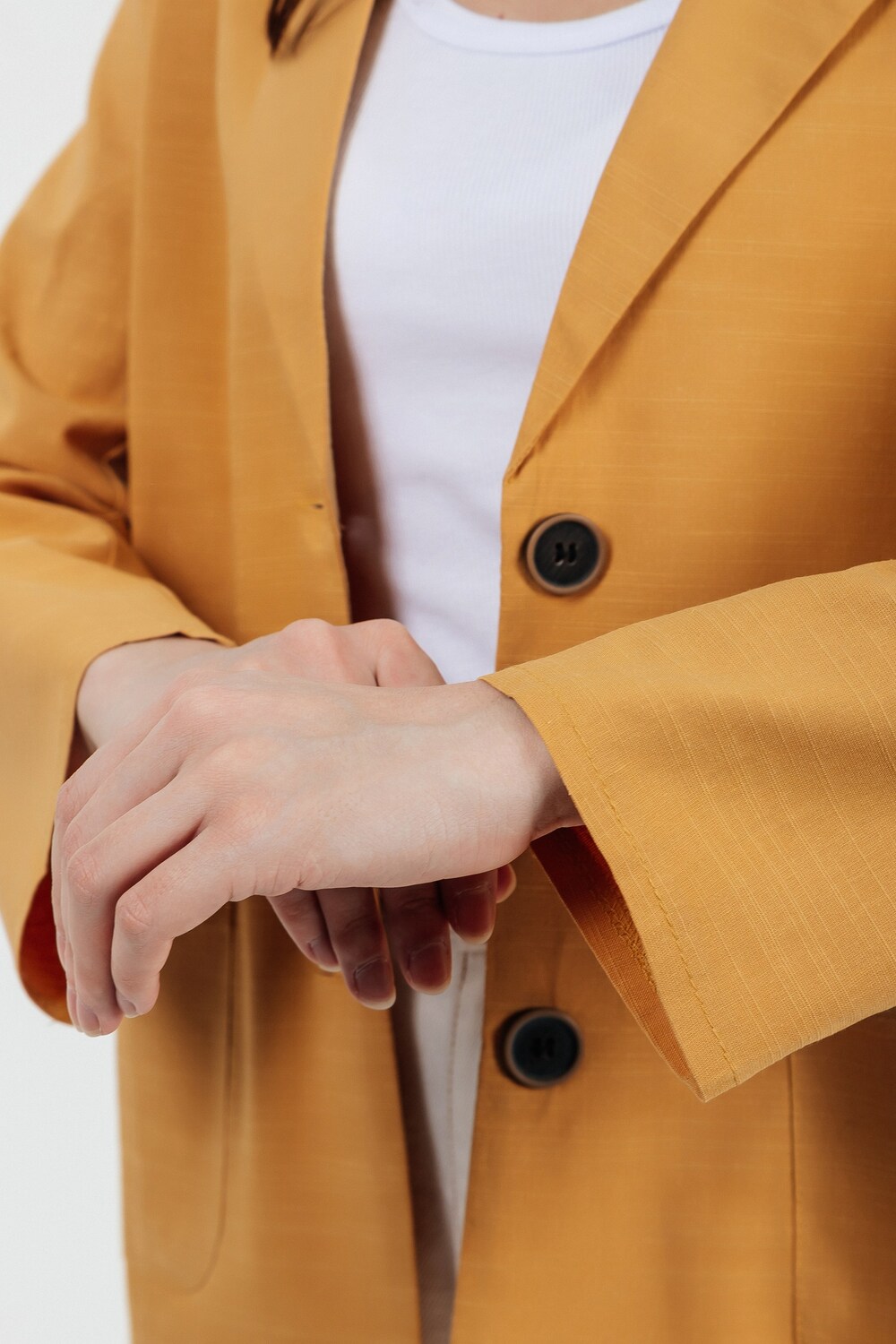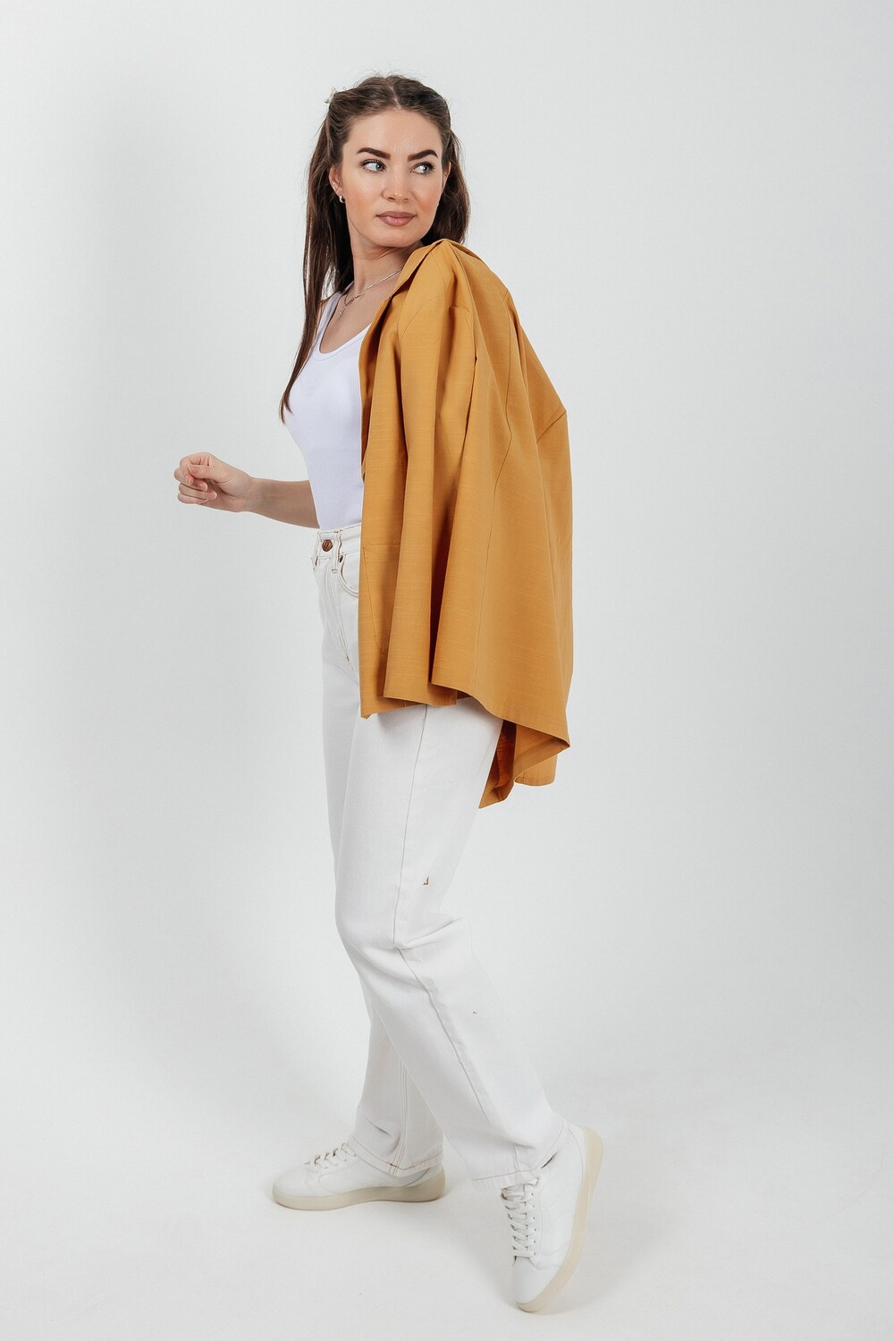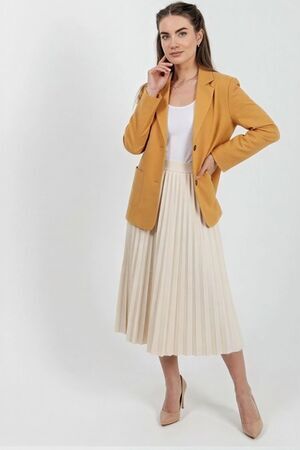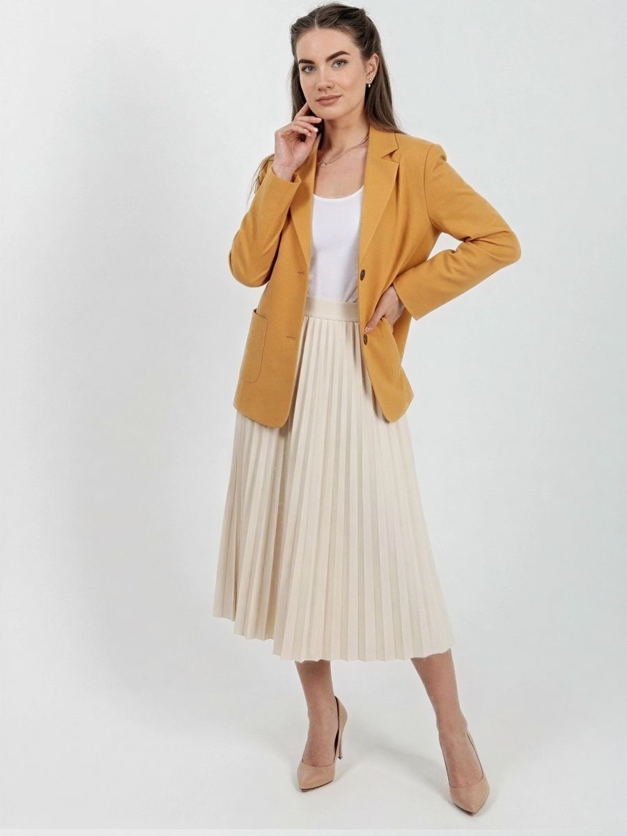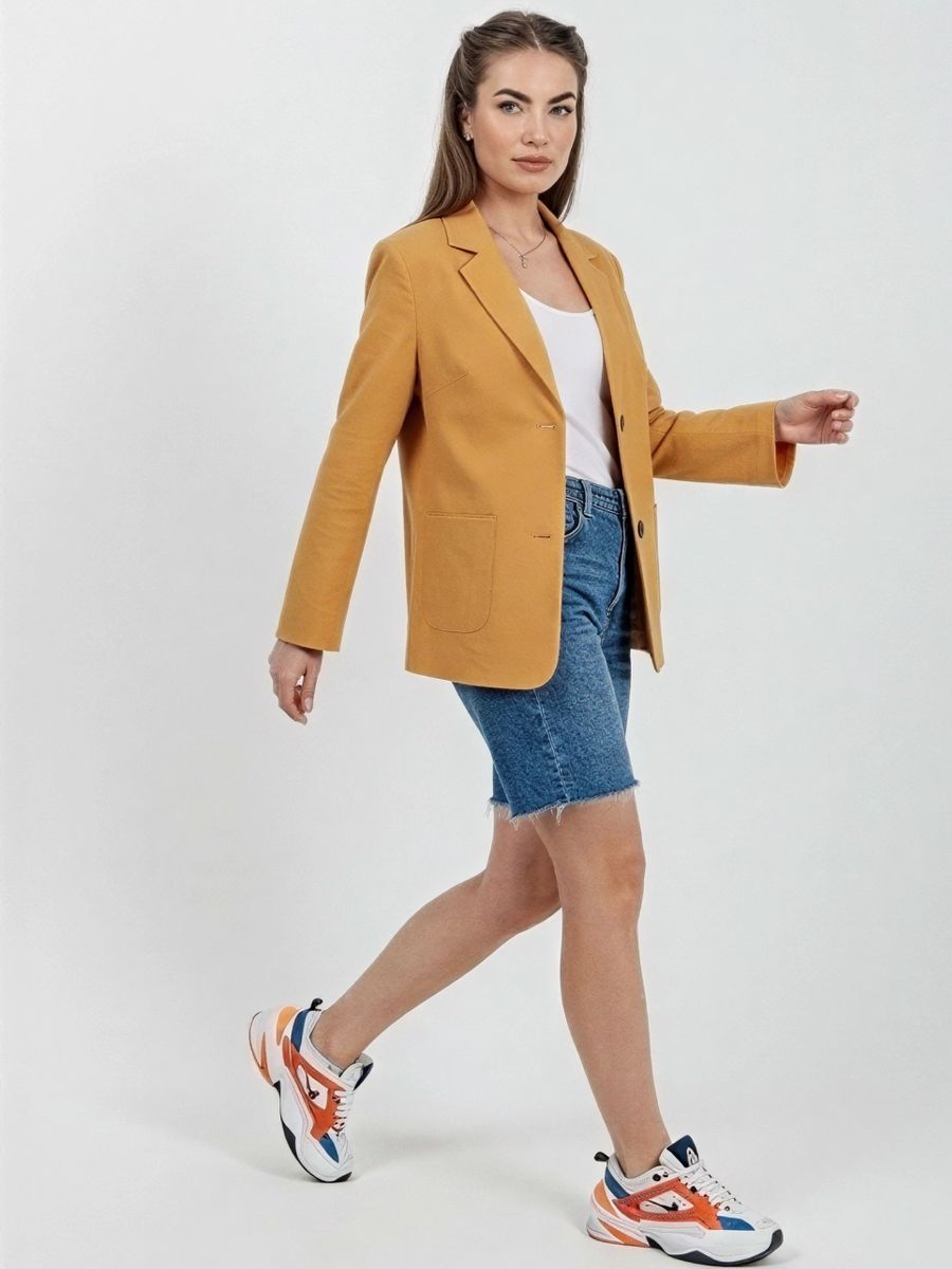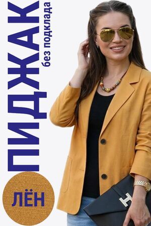 Лёгкий женский пиджак без подклада станет незаменимой вещью в весенне‑летнем гардеробе. Благодаря отсутствию подклада модель особенно комфортна: она не стесняет движений и не создаёт лишнего тепла даже в жаркую погоду. Классический дизайн с чёткими линиями и лаконичными деталями легко вписать в любой стиль: наденьте его с офисной юбкой для строгого образа или с джинсовыми шортами для прогулки. Застёжка на пуговицы, удобные карманы и продуманный крой делают эту модель практичной и функциональной. Пиджак гармонично сочетается с разными элементами гардероба — от платьев до брюк. Уход прост: деликатная стирка при 30∘C и аккуратная глажка.