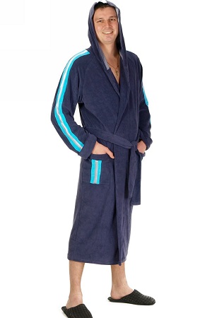 Мужской халат из махры. Запашной халат с поясом, имеется капюшон, накладные карманы по бокам, яркая отделка карманов и рукавов, общая длина приблизительно до середины голени