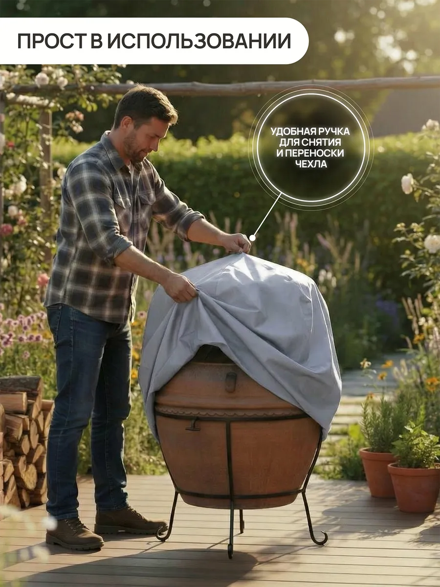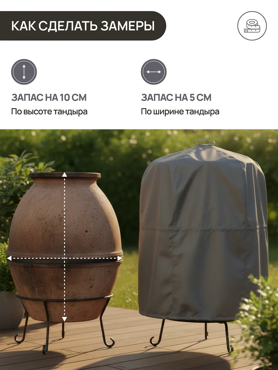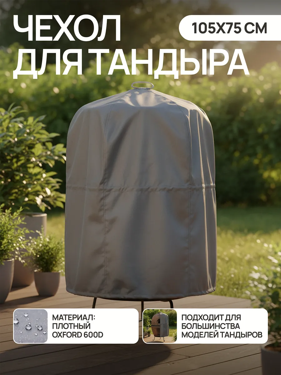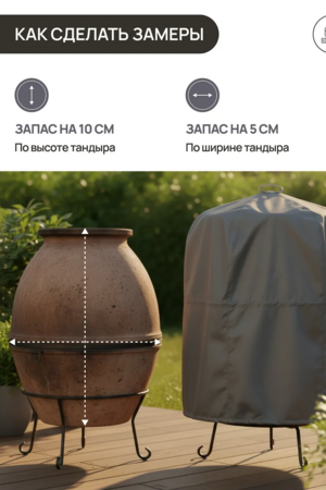Чехол для тандыра водонепроницаемый 75х105 см — надежная защита тандыра от дождя, снега, влаги, солнца, пыли и грязи. Уличный чехол на тандыр продлевает срок службы печи, предотвращает растрескивание от влаги, образование плесени и выгорание от ультрафиолета. Тент на тандыр подходит для круглогодичного использования: летом защищает от солнца и пыли, зимой — от снега, мороза и осадков. Идеален для дачи, сада и загородного участка.