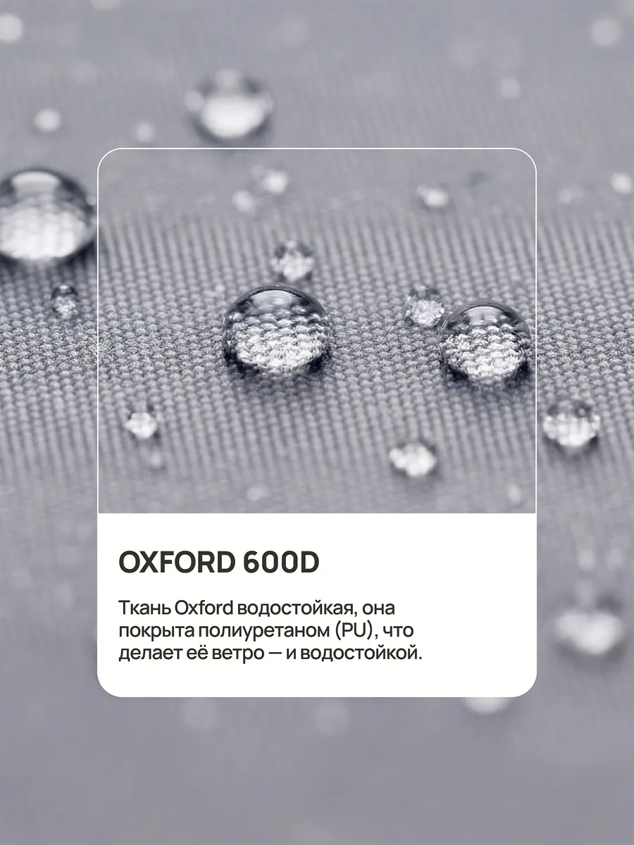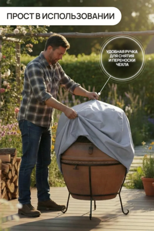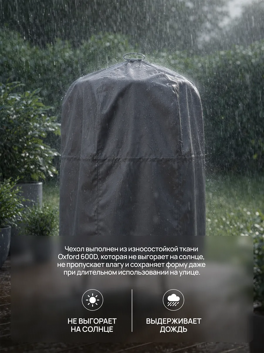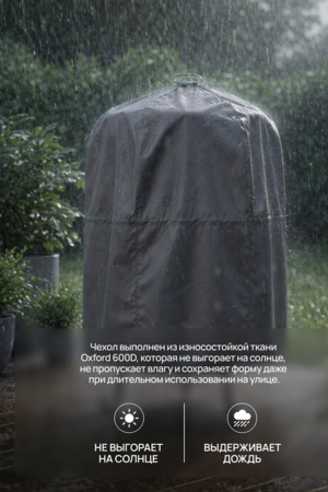 Чехол изготовлен из прочной ткани Oxford 600D которая не выгорает на солнце и сохраняет форму при длительном использовании на улице. Ткань Oxford водостойкая, она покрыта полиуретаном (PU), что делает её ветро- и водостойкой. Чехол защищает оборудование в любую погоду: от сильного дождя, снега, ветра и палящего солнца. Плотный чехол для тандыра сохраняет внешний вид и функциональность печи на долгие годы.