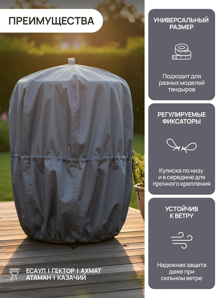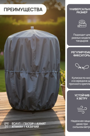 Чехол защитный для тандыра предотвращает накопление влаги, грязи и пыли. Без чехла тандыр может трескаться от влаги, терять внешний вид и быстрее изнашиваться. Чехол для тандыра зимний особенно актуален в холодное время года и межсезонье, когда оборудование подвергается агрессивным погодным условиям.