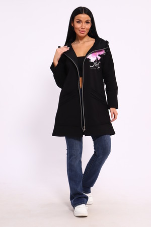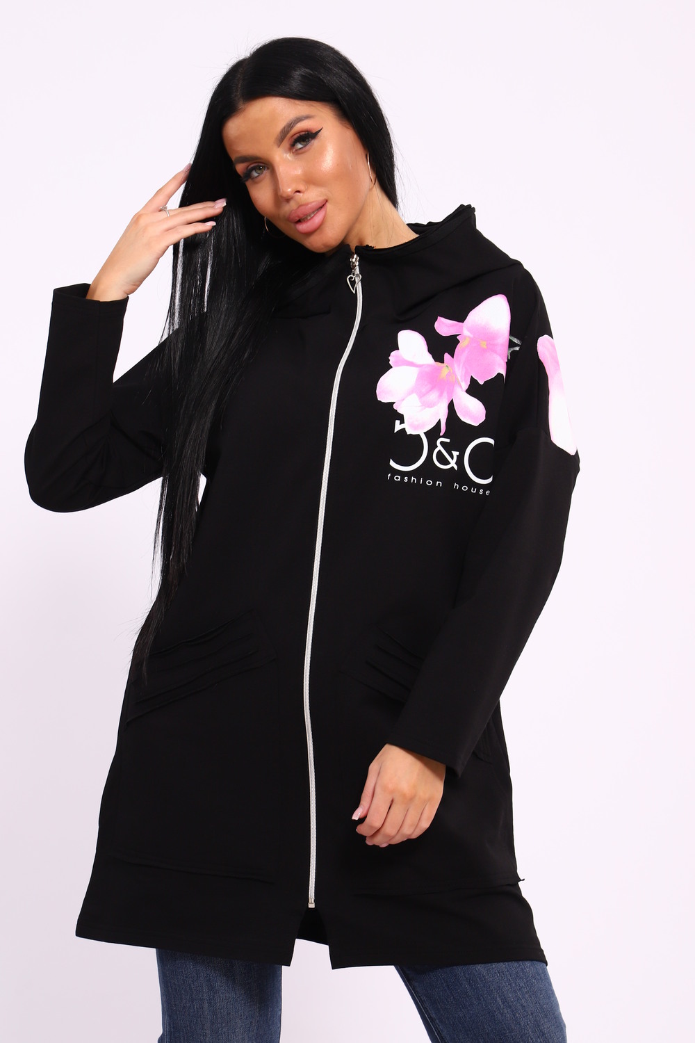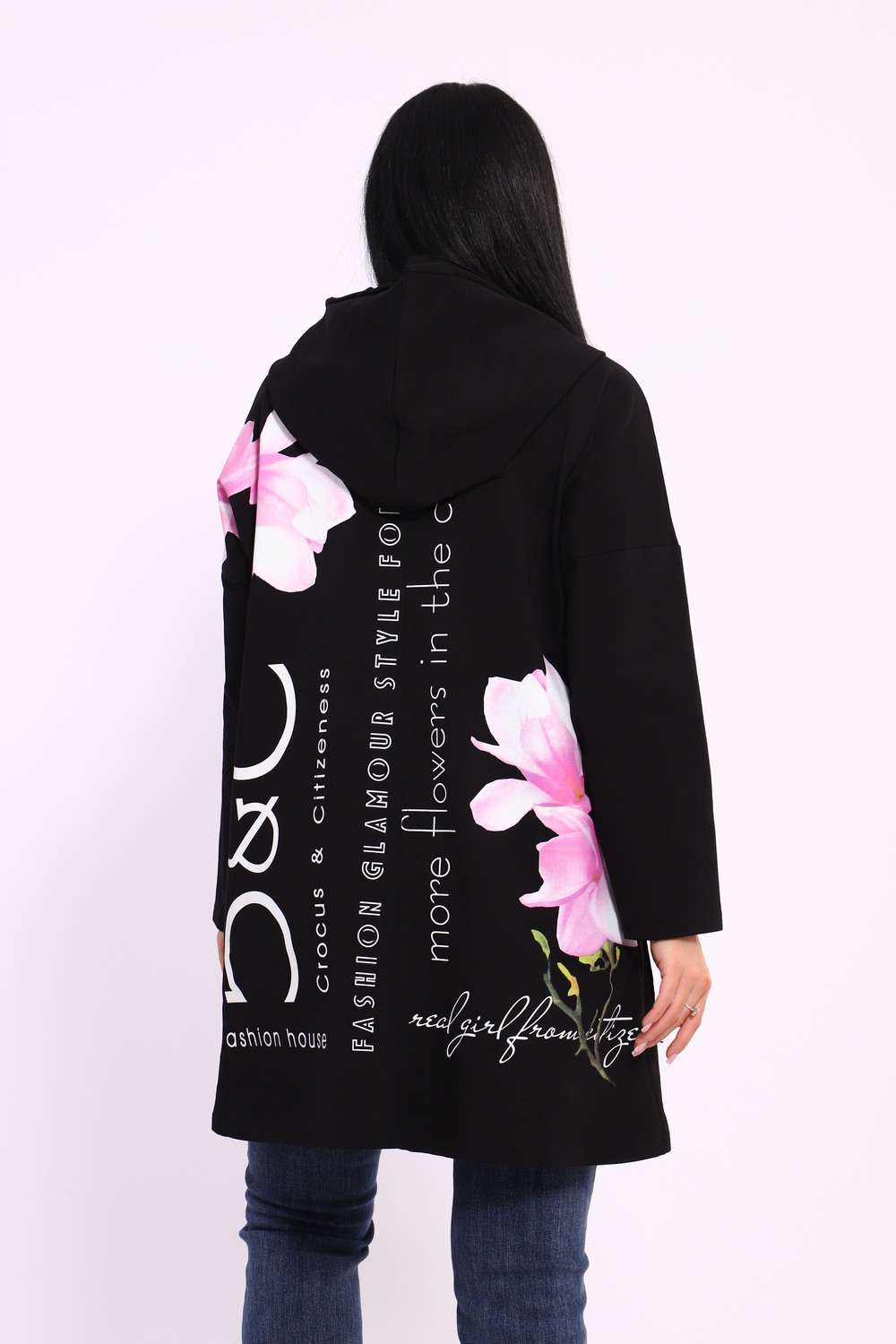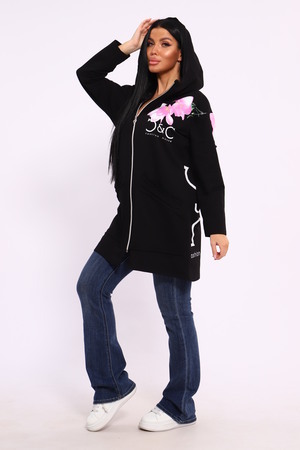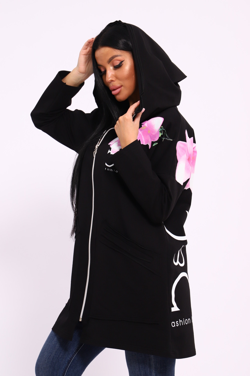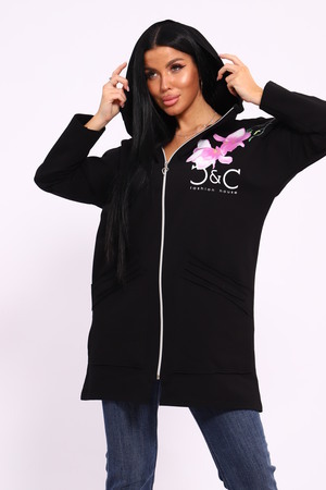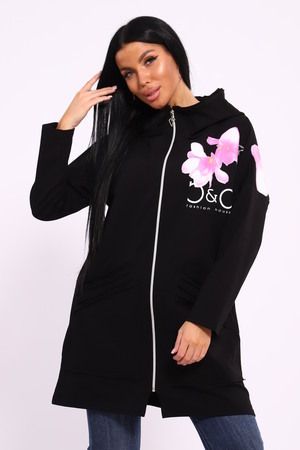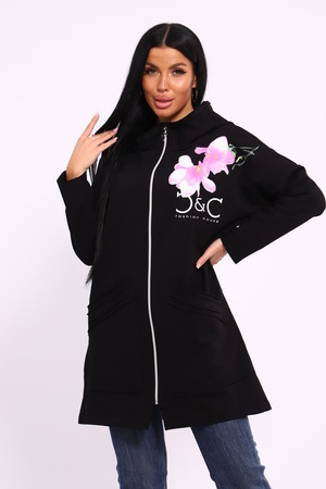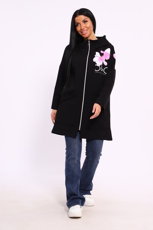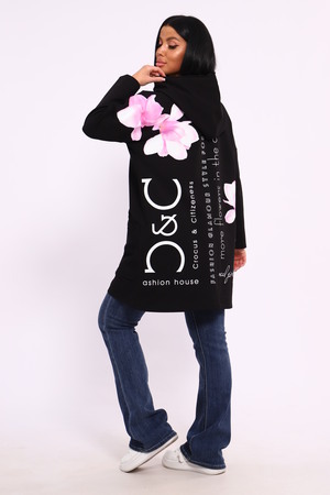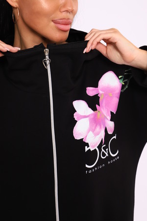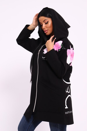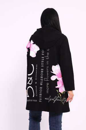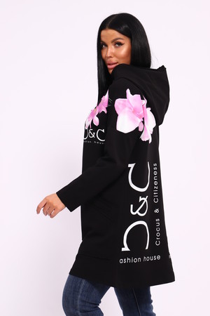 Женская туника из футера. Застегивается на молнию, по бокам карманы, имеется капюшон, принт в виде цветов и надписей, общая длина чуть выше коленей. Размеры от 50 до 64.